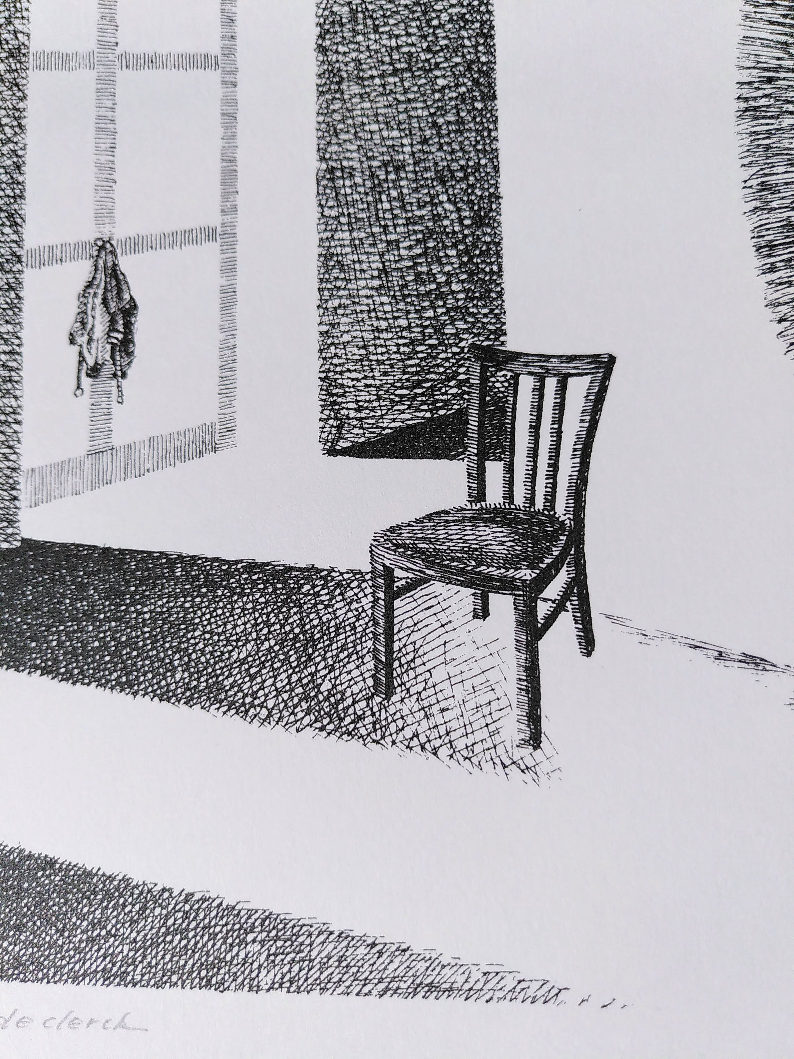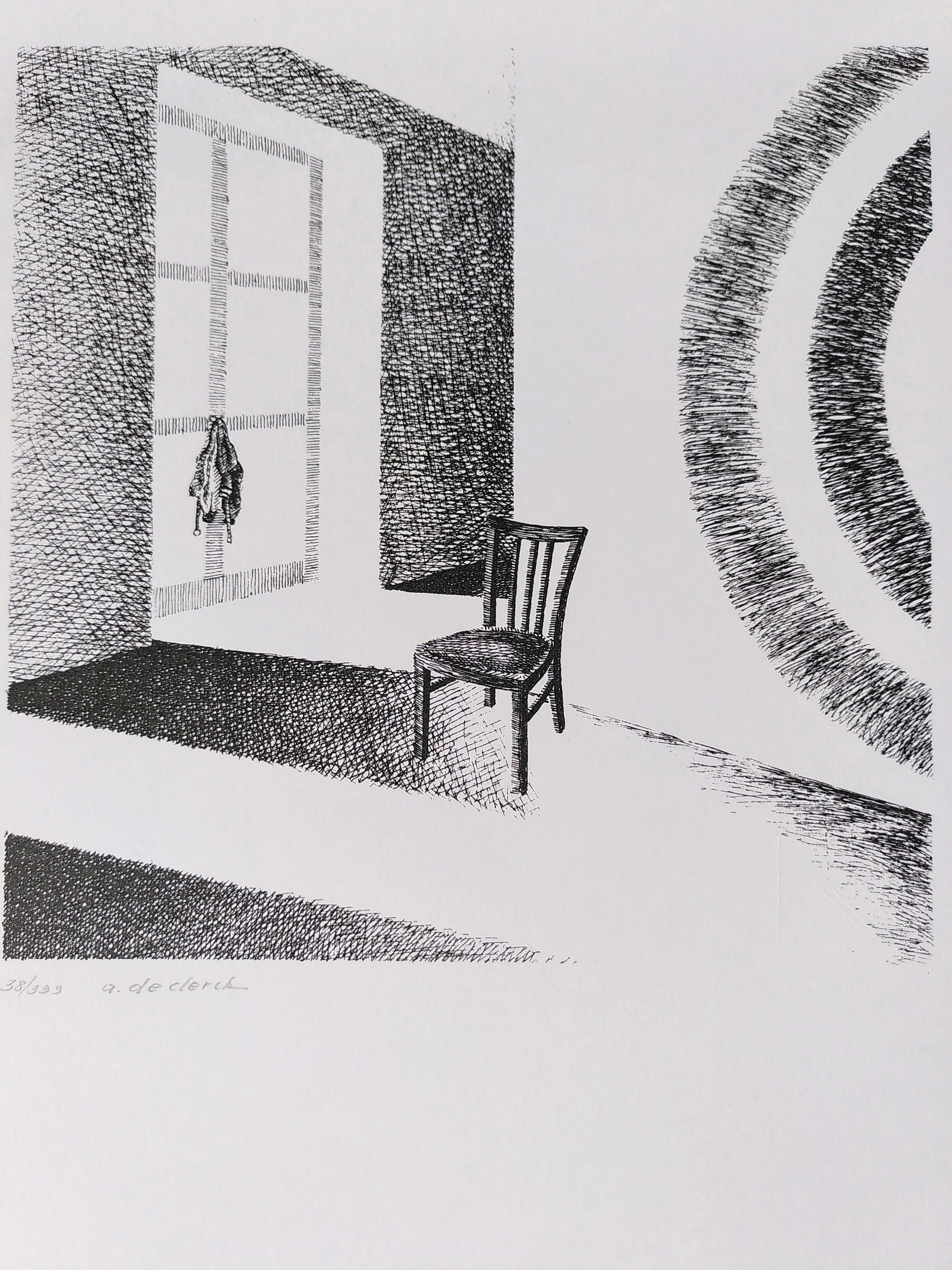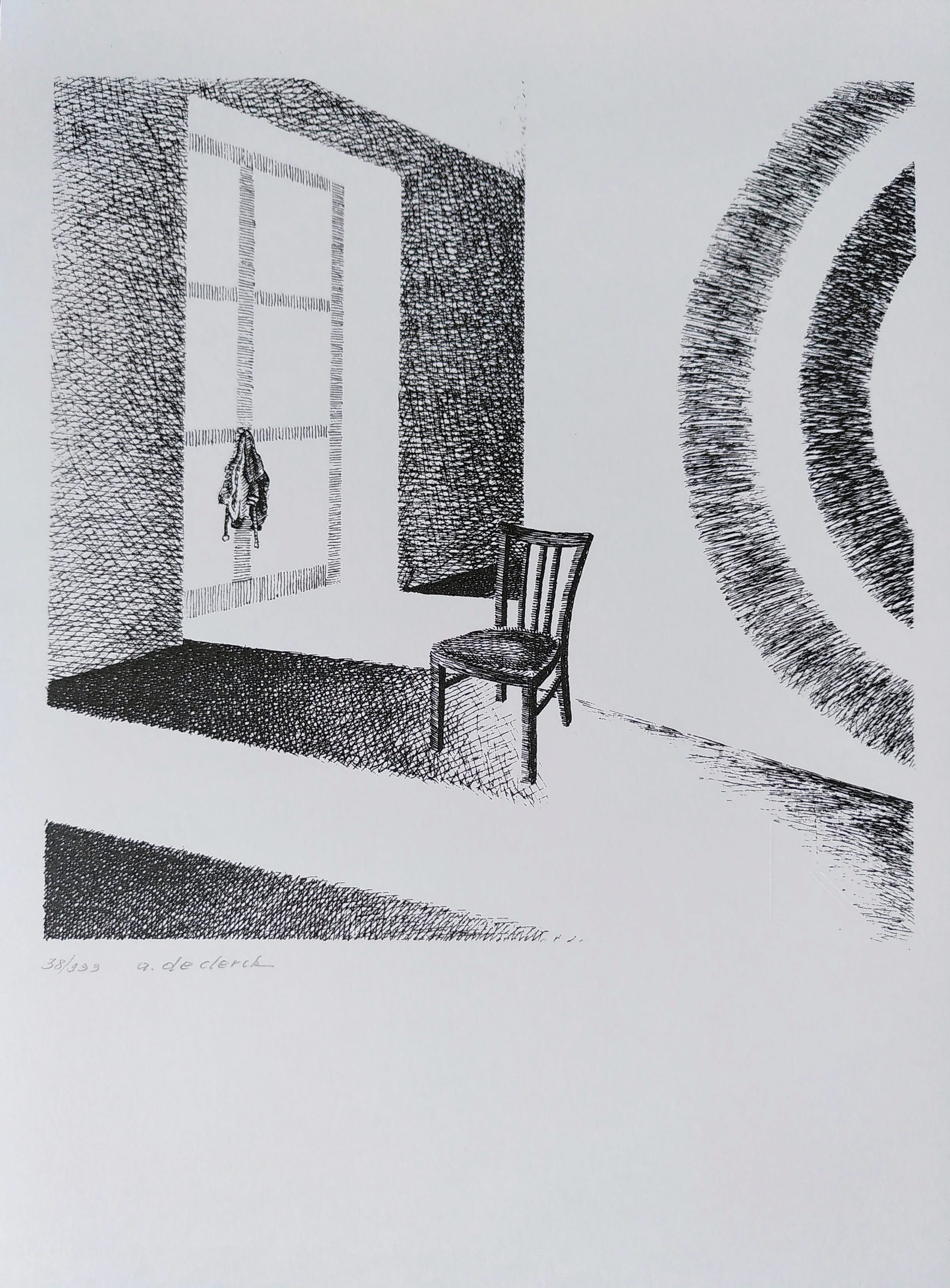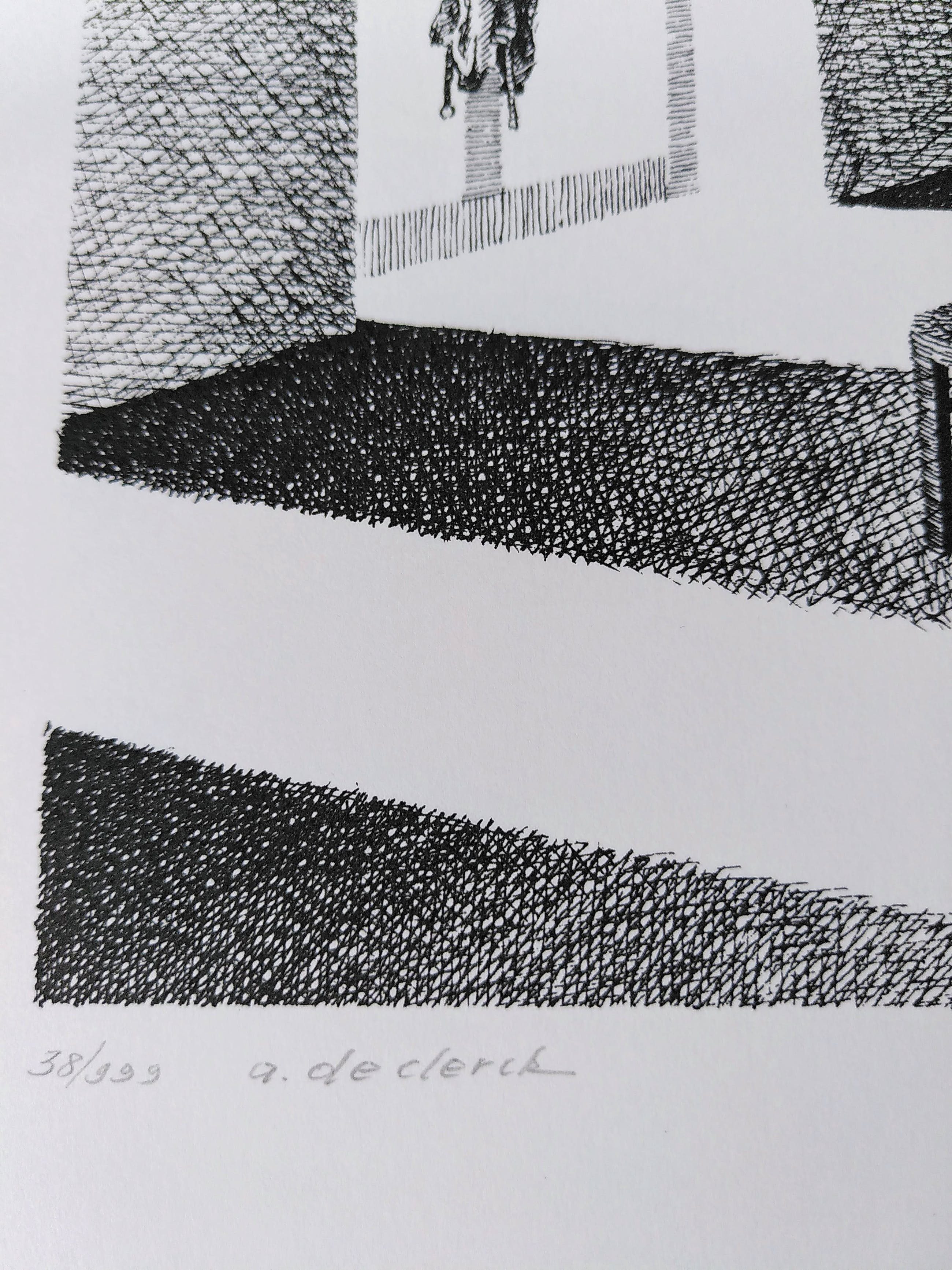 Deze zeefdruk is door meesterzeefdrukker Wout van der Vet met de hand gedrukt en genummerd en gesigneerd met potlood door de kunstenaar Antoon de Clerck (jeugdvriend Roger Raveel) . Betreft nr. 29 uit de oplage. In nieuwstaat.