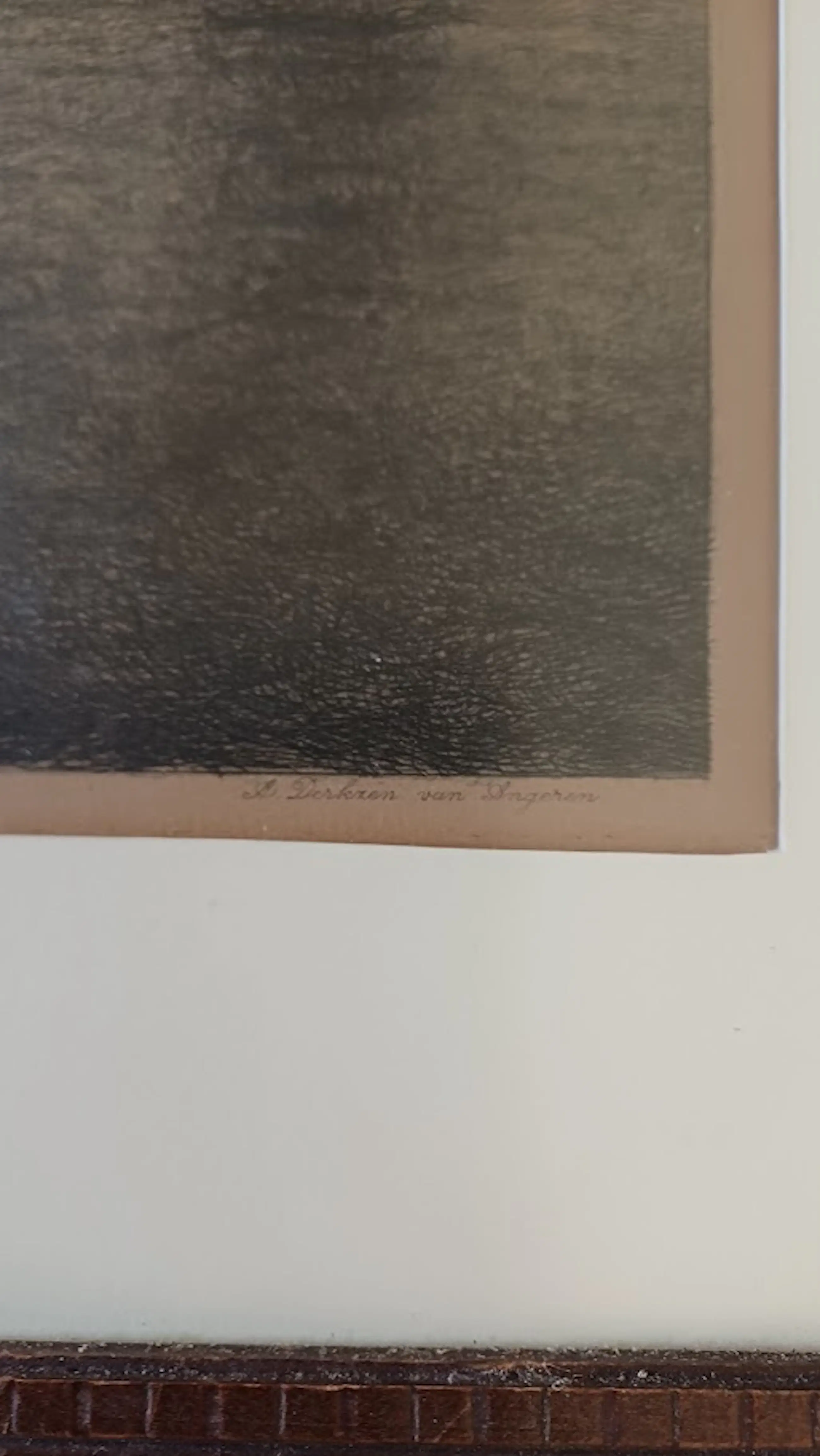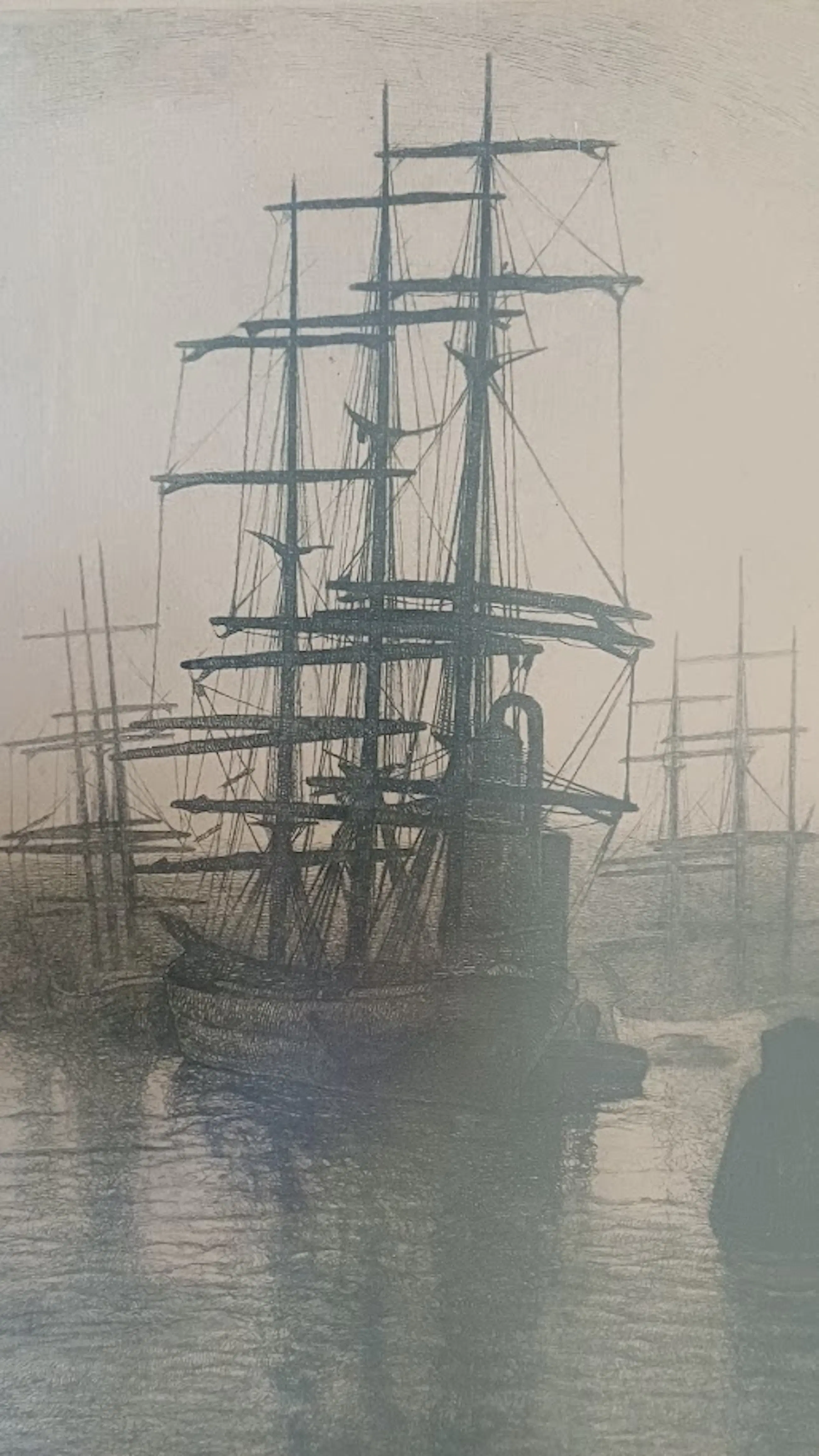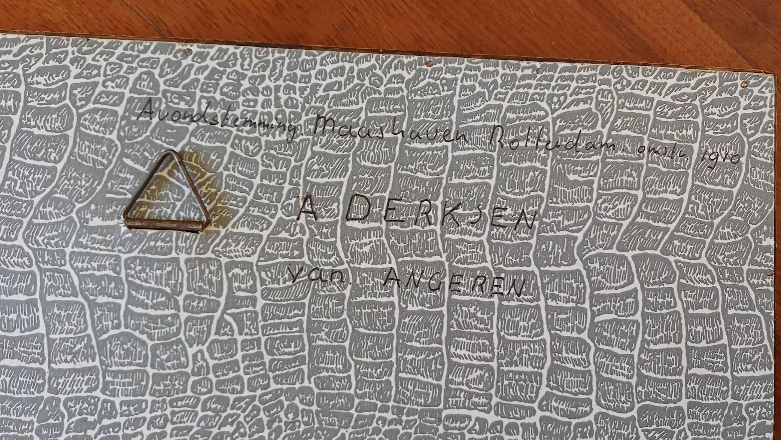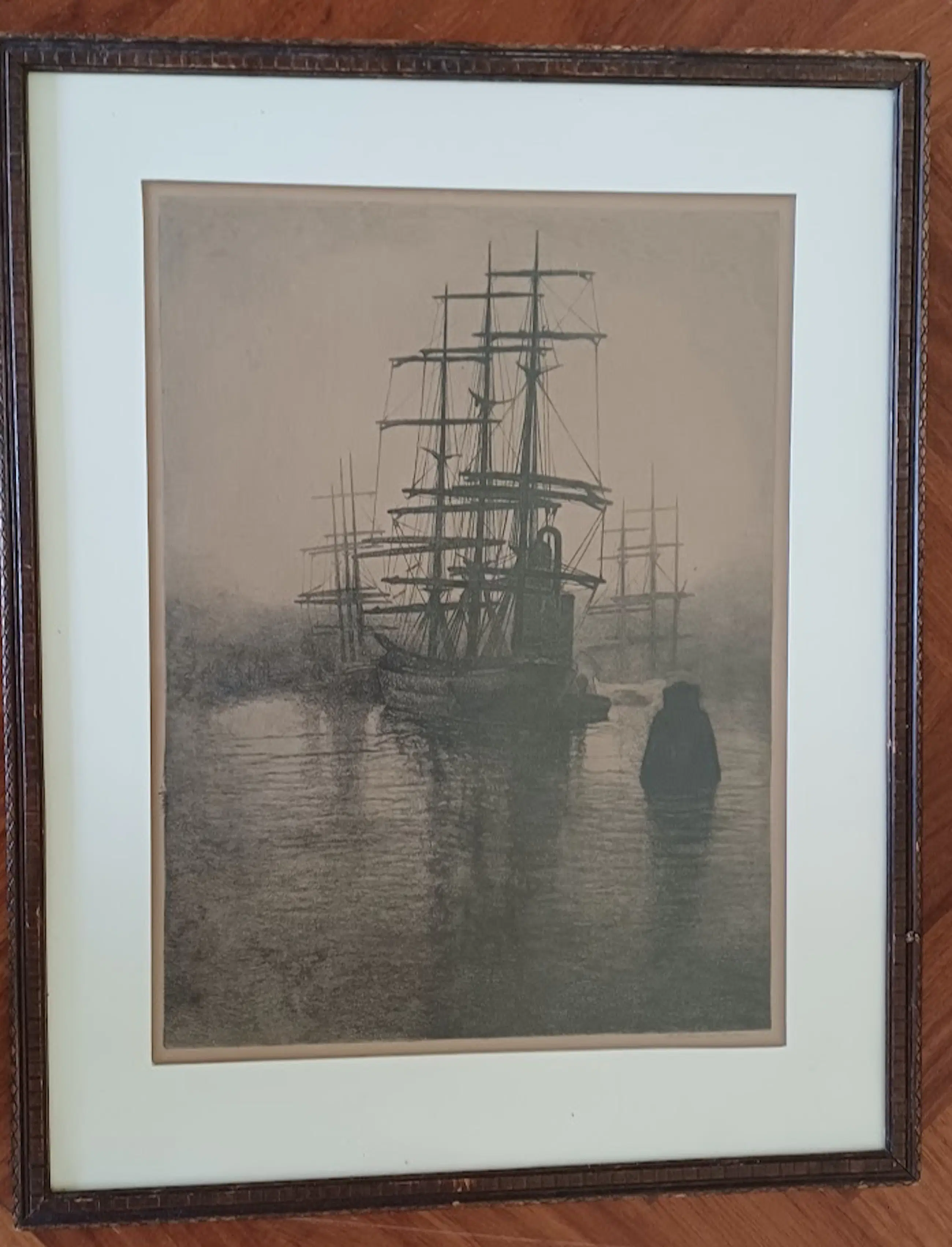 De lijstenmaker heeft de ets gedateerd ca. 1910 en de titel meegegeven "Avondstemming Maashaven Rotterdam".
