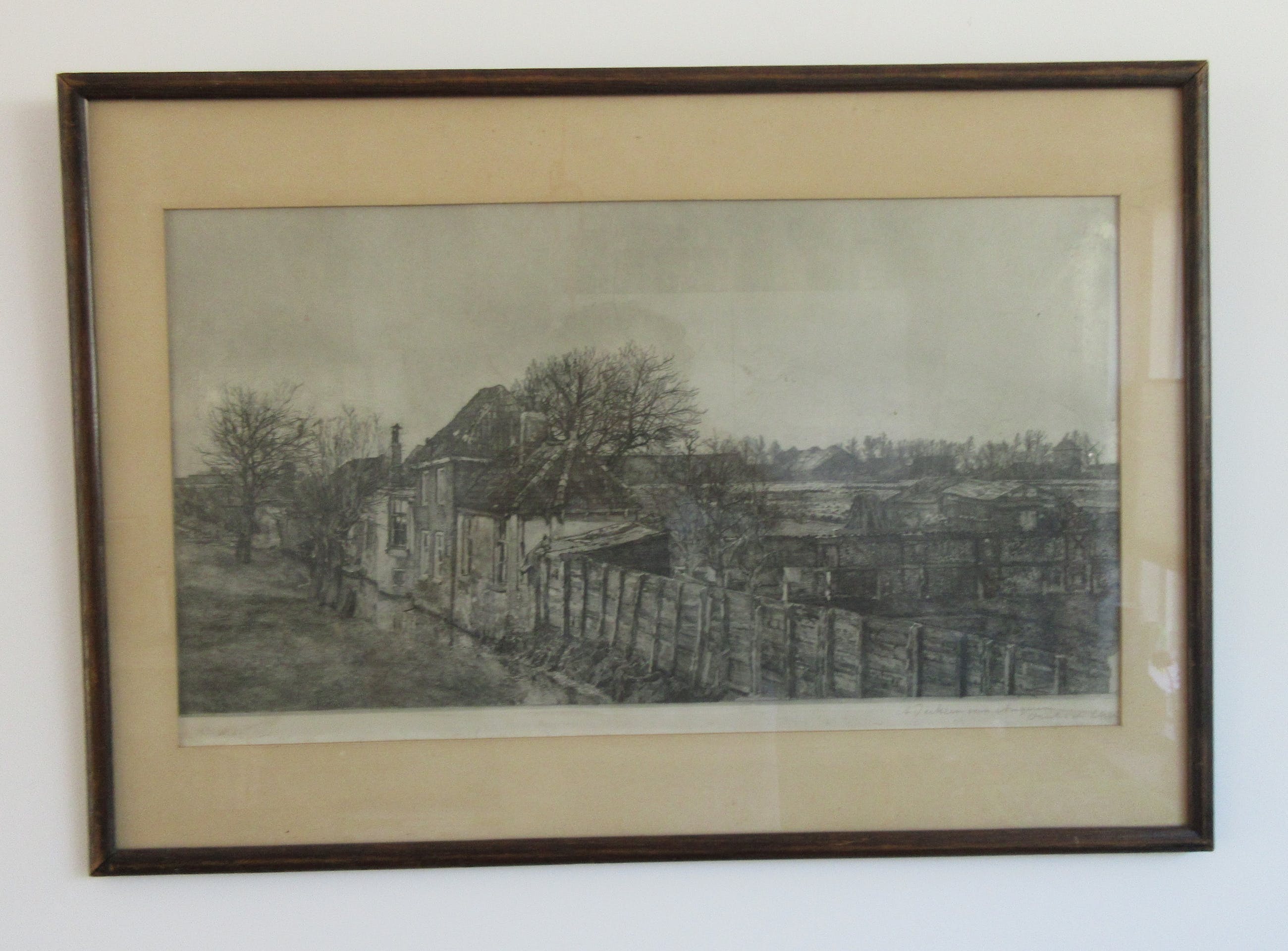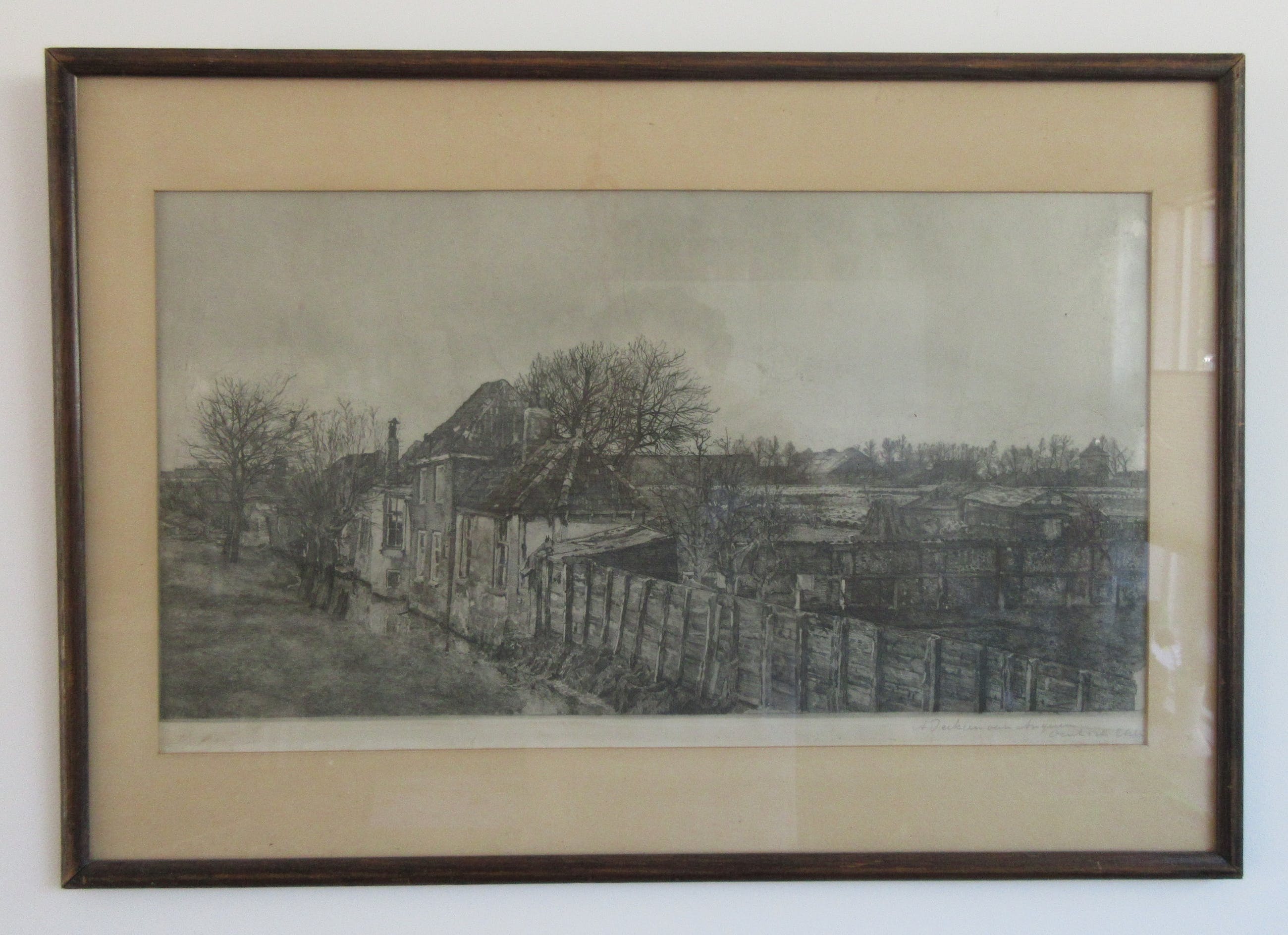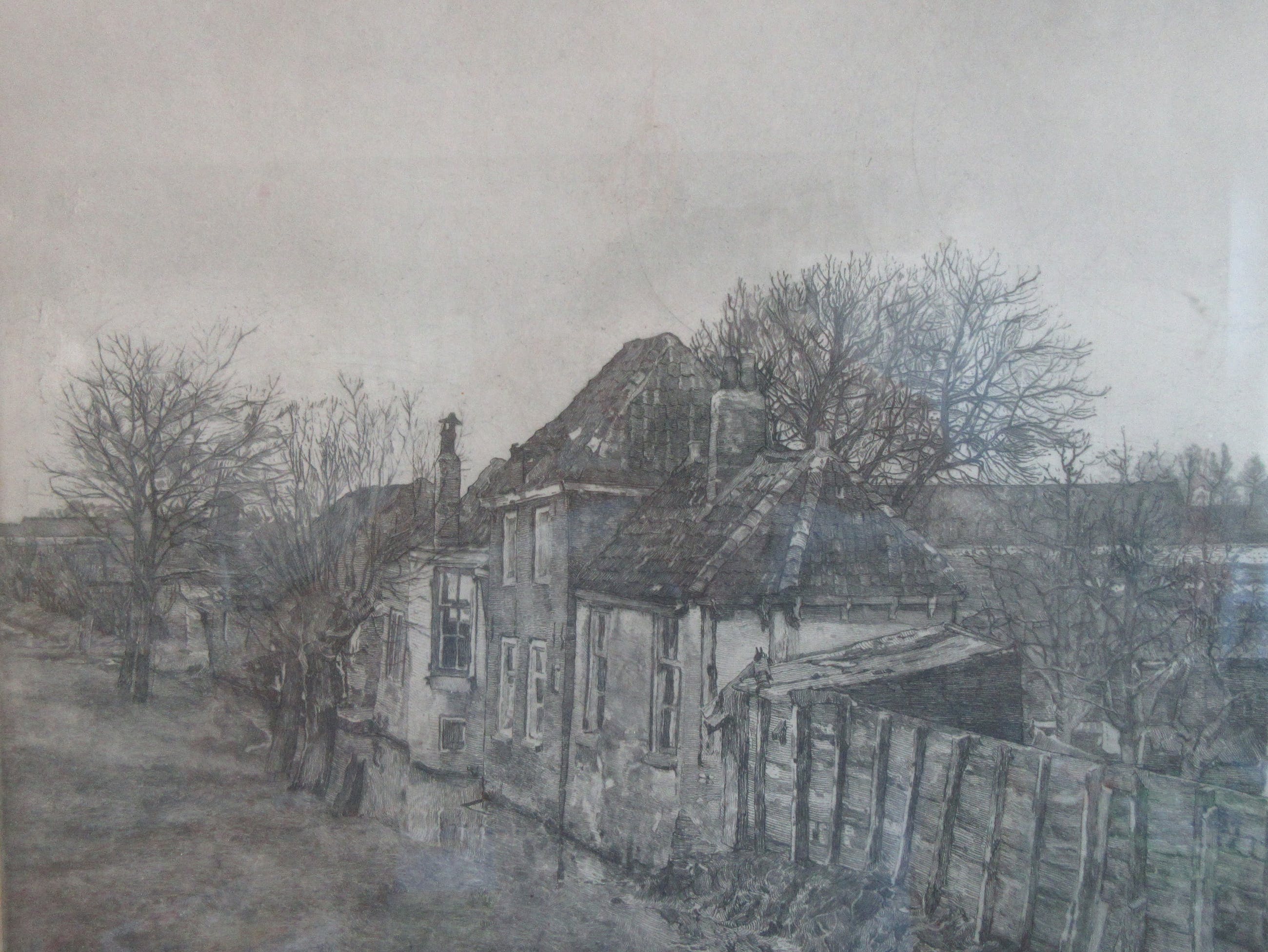 Ets "Huizen van de Postbode" in Schipluiden gemaakt in de periode 1904-1907. Er is een serie van deze huizen zie onderstaande info. Het werk zit in de originele bruin houten lijst met glazen plaat. Rechtsonder gesigneerd A Derkzen van Angeren en getiteld Schipluiden.