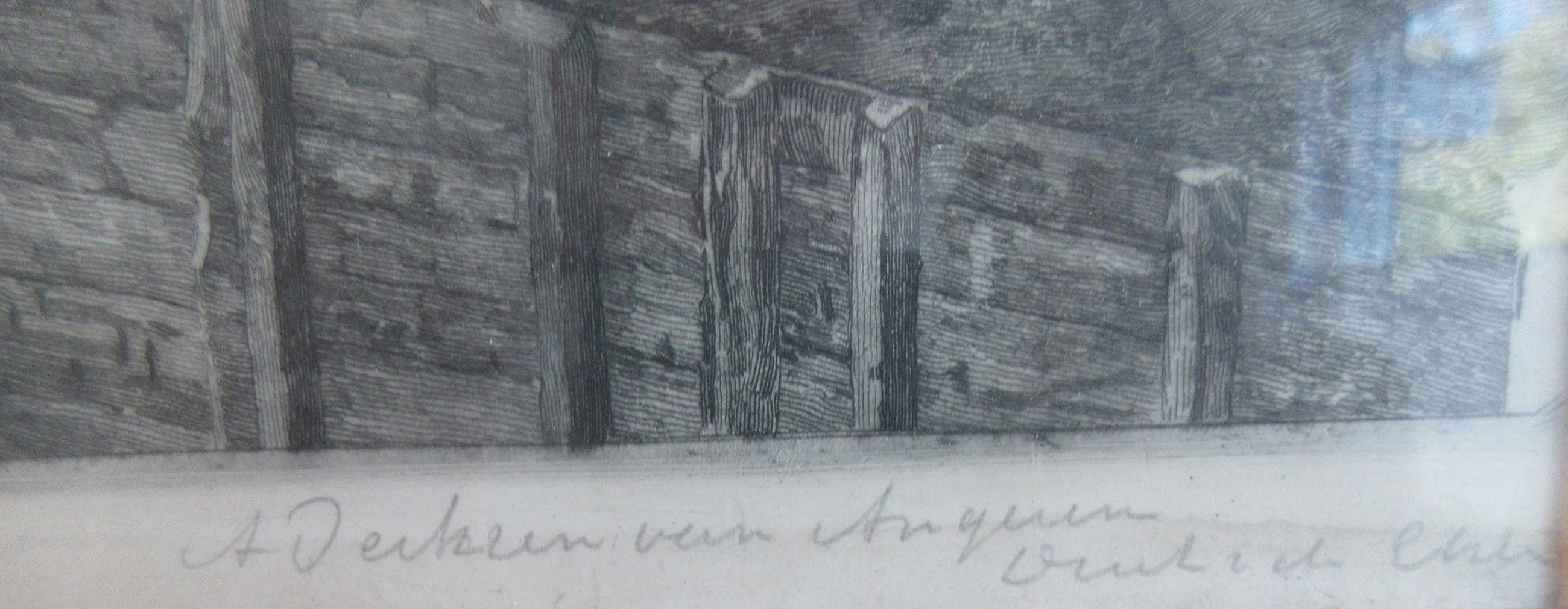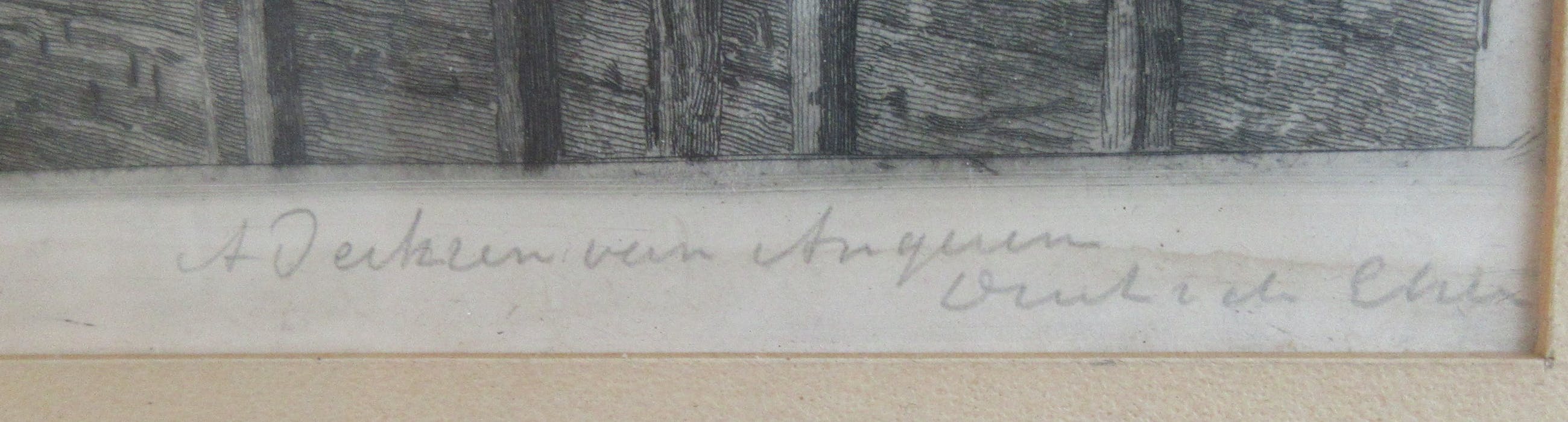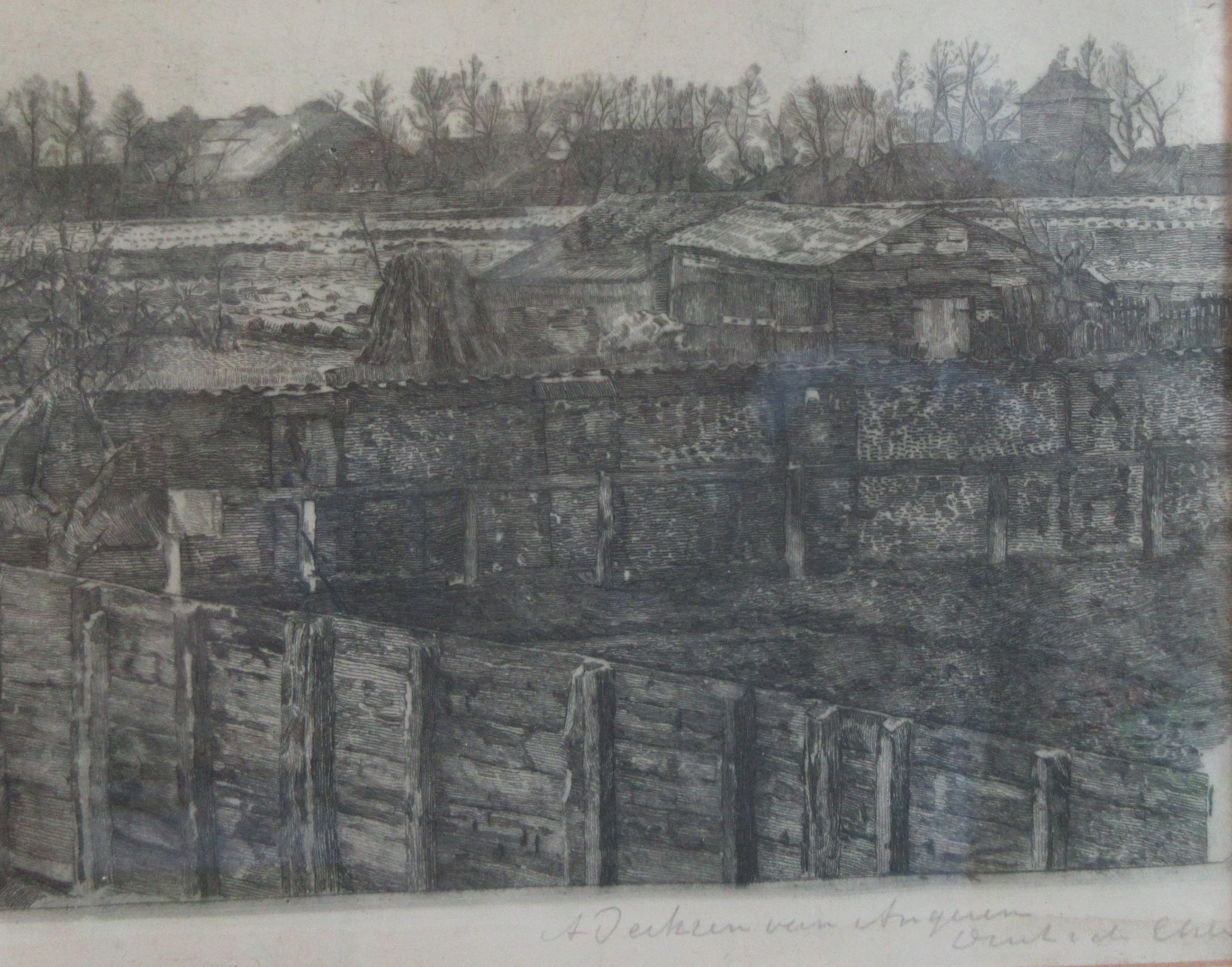 Ets "Huizen van de Postbode" in Schipluiden gemaakt in de periode 1904-1907. Er is een serie van deze huizen zie onderstaande info. Het werk zit in de originele bruin houten lijst met glazen plaat. Rechtsonder gesigneerd A Derkzen van Angeren en getiteld Schipluiden.