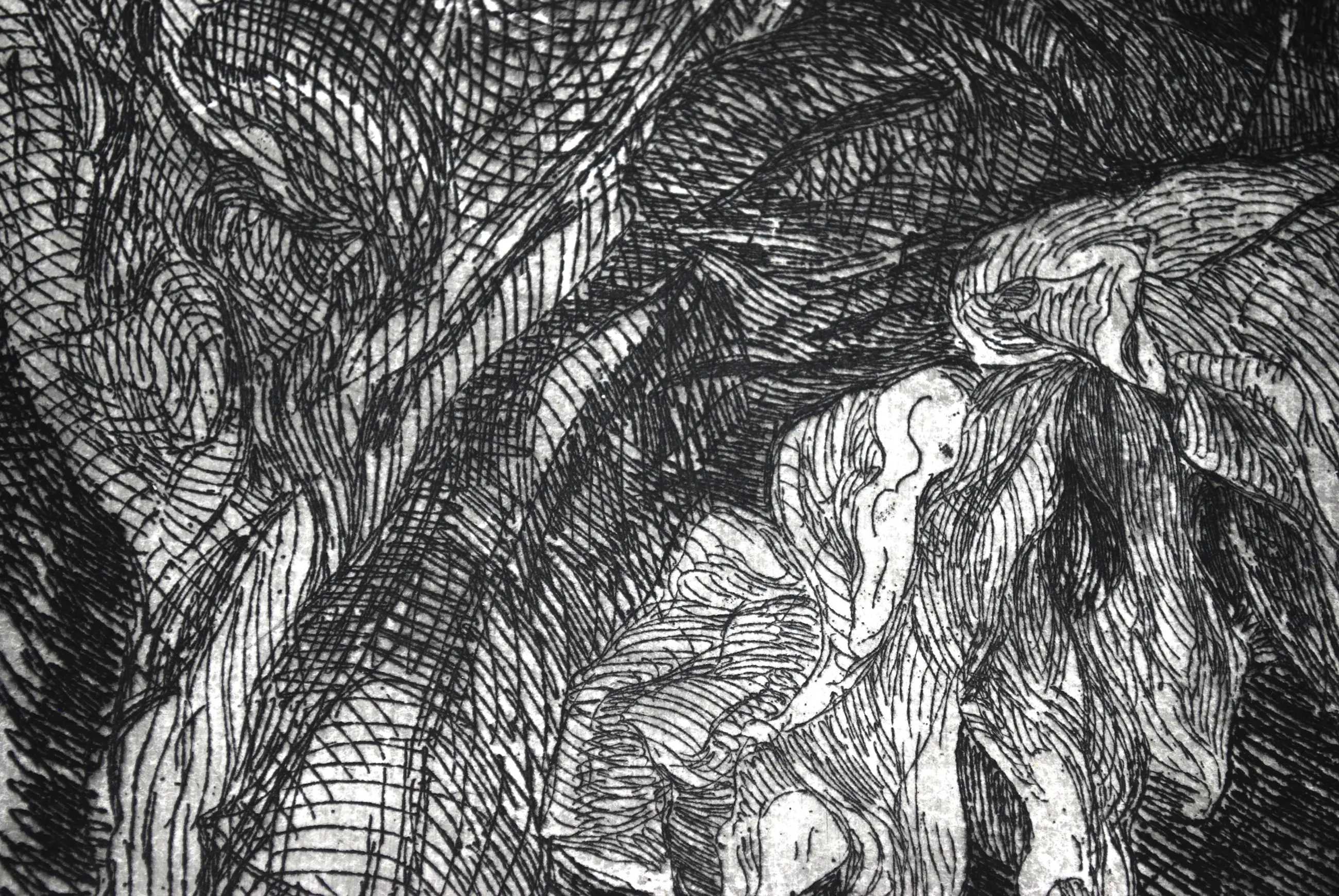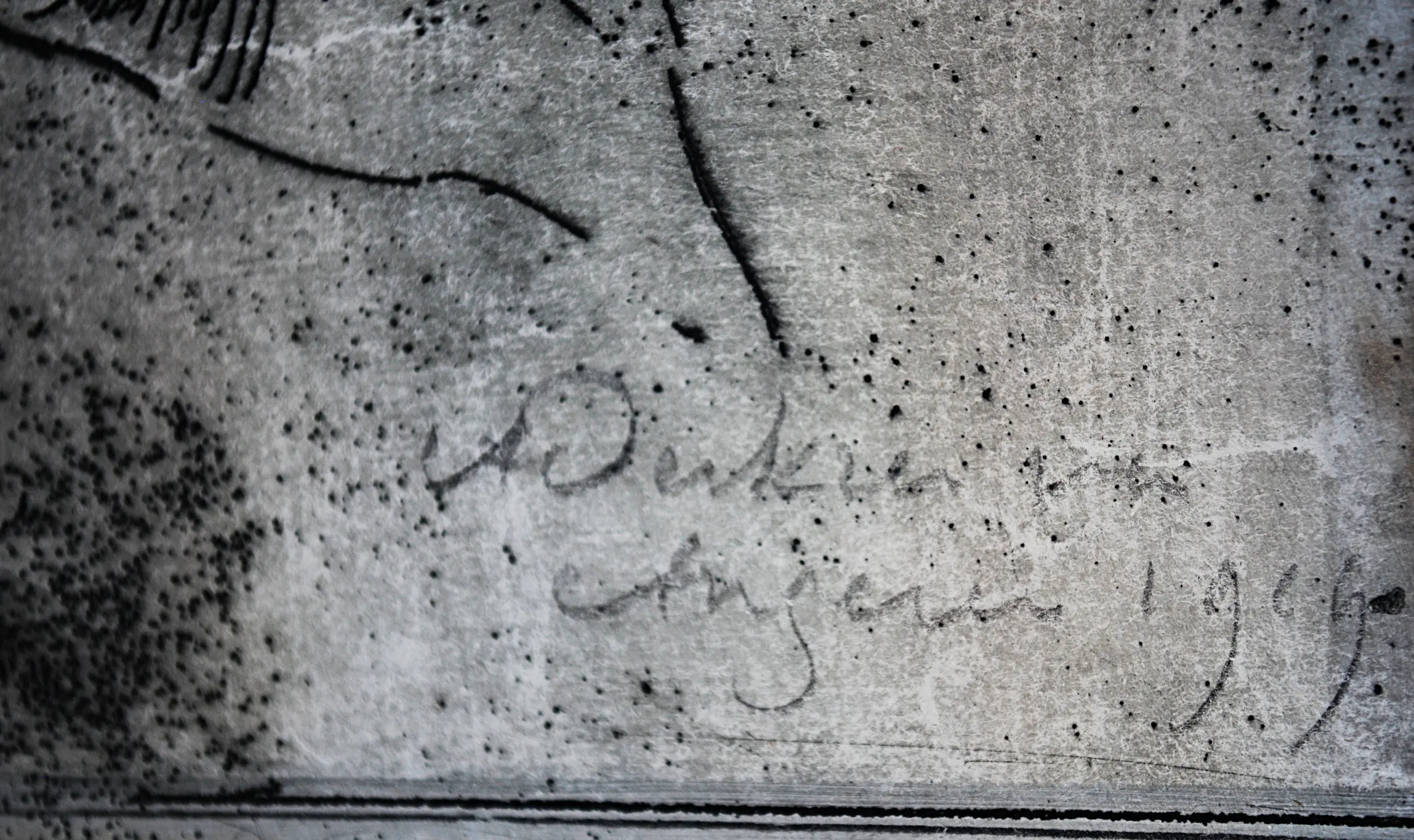Enige lichte kreukjes, schaafjes/ een geplakt scheurtje aan de rechterzijde, verder in prima schone staat. De lijst heeft wat slijtage.