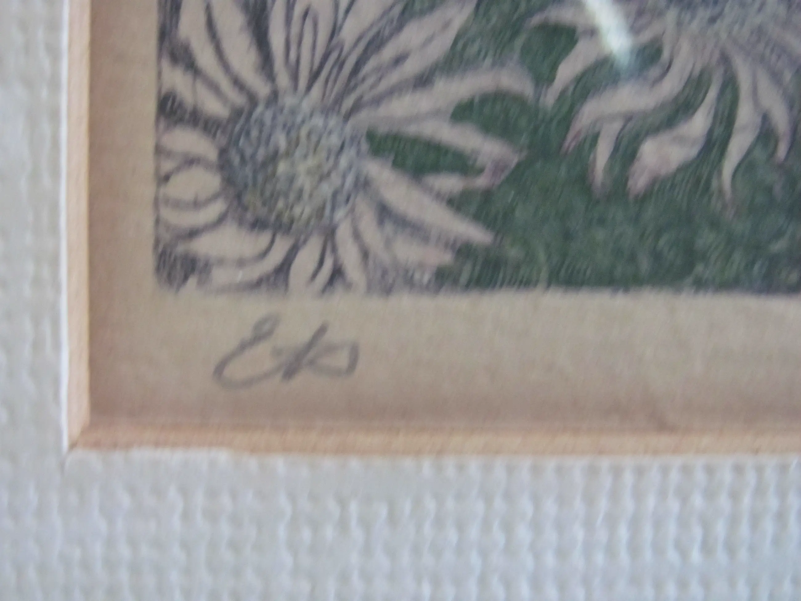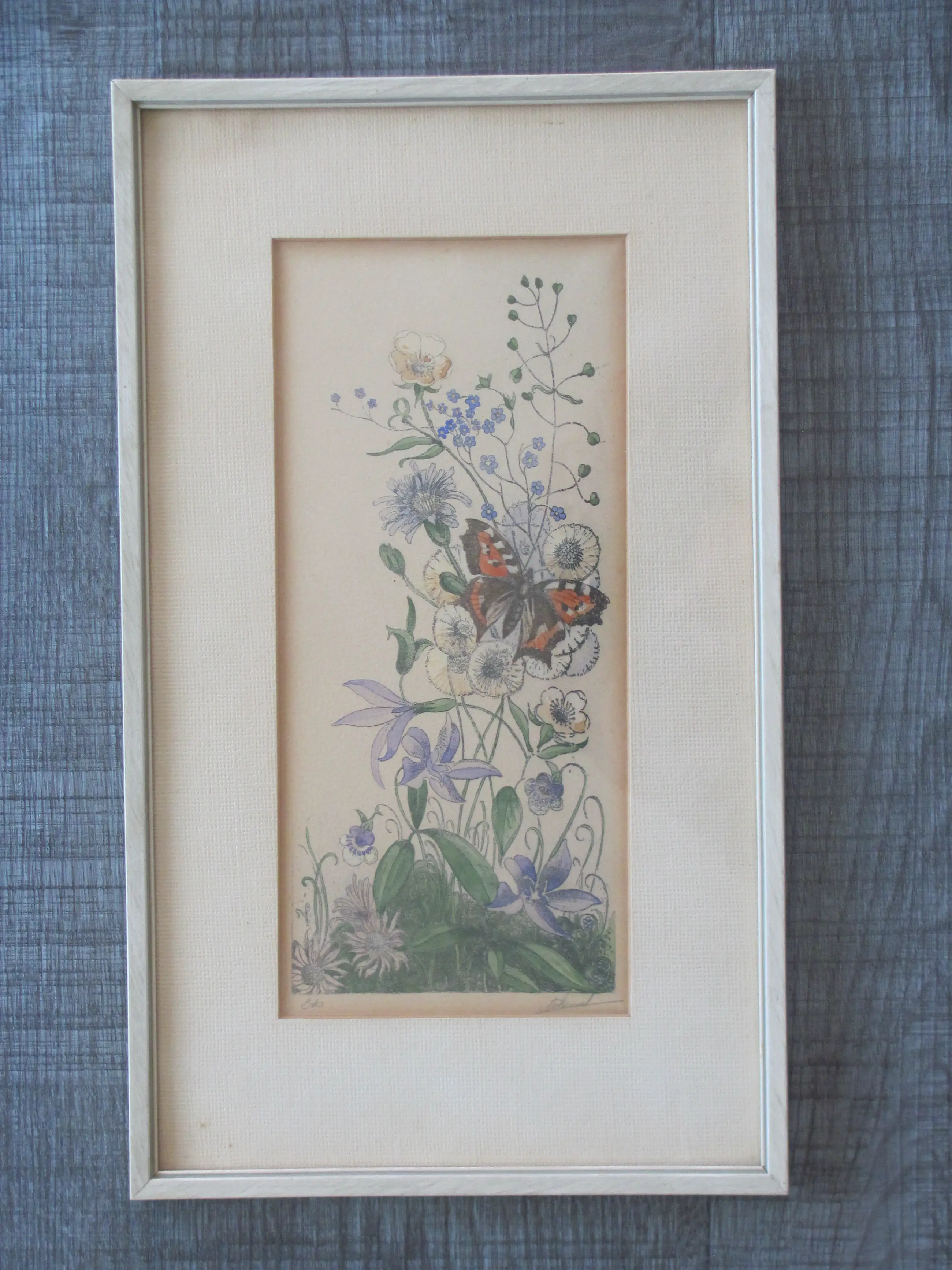 Fraaie ets van Antoon van Hemert die je niet vaak ziet. Deze keer geen stadsgezicht of wintergezicht, maar een natuurtafereel van een vlinder en bloemen in de lente/zomer. Linsonder in potlood "ets" en rechtsonder de handtekening van A. van Hemert.