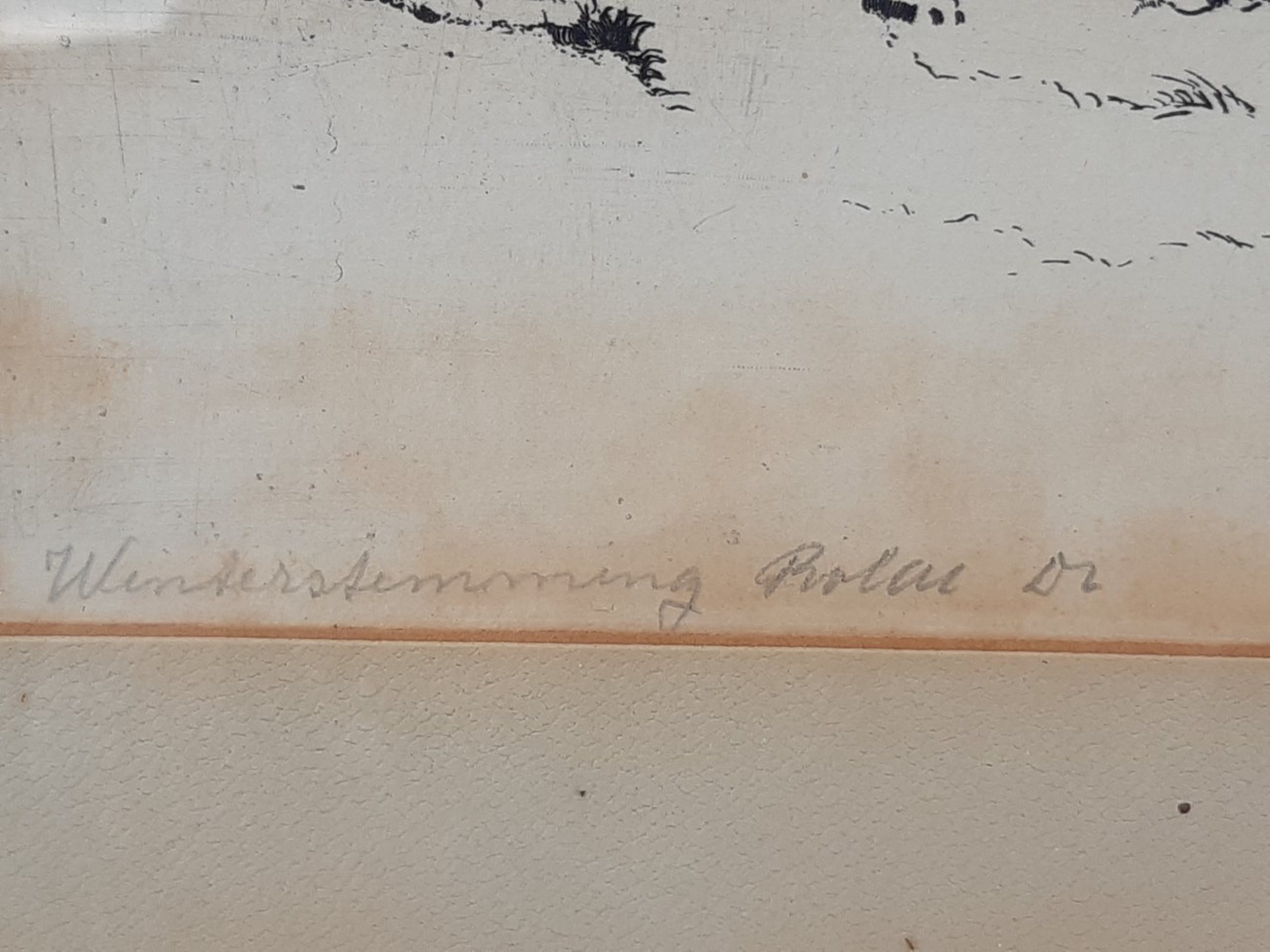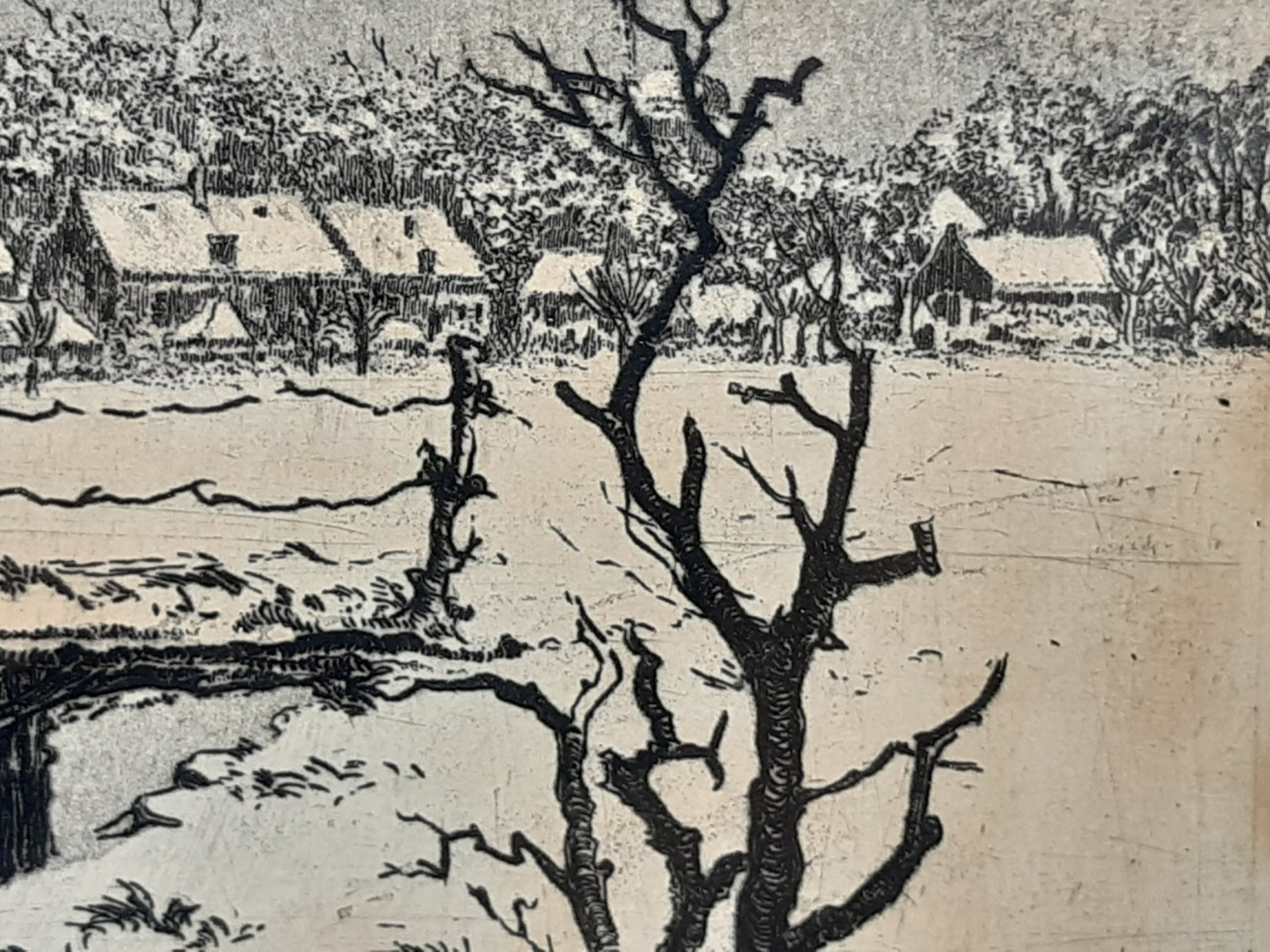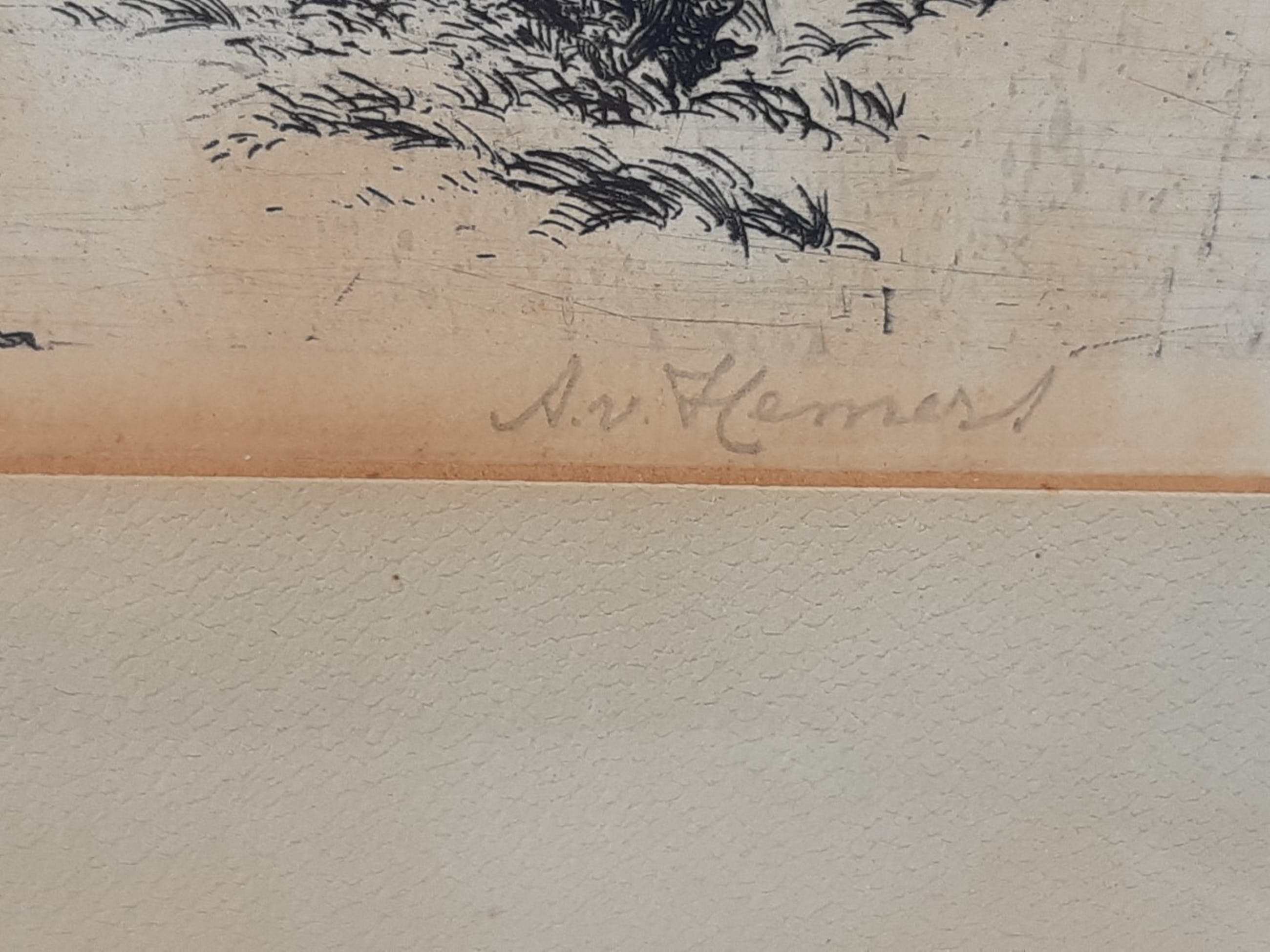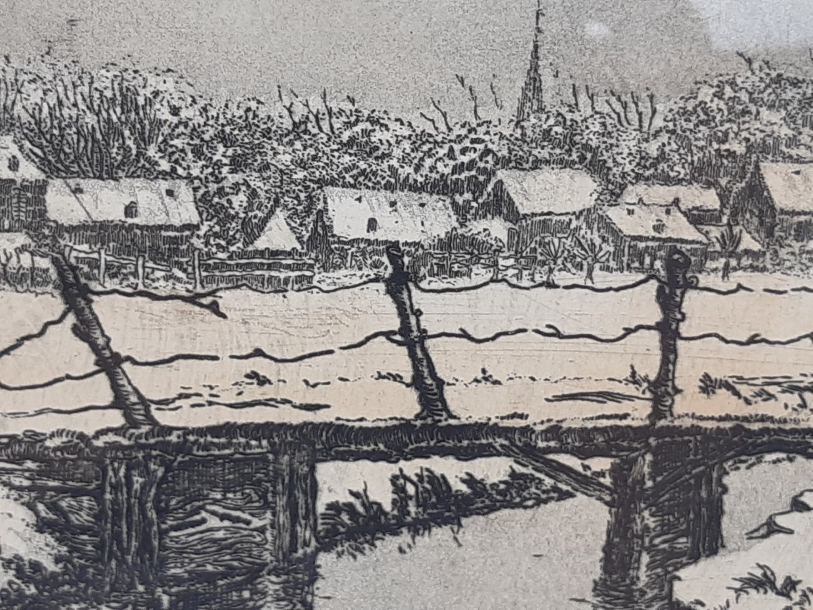 De kleuren in de ets zijn door de tand des tijds vervaagd. Het papier van de ets en van het passe-partout is aan de (binnen)randen ‘vergeeld’. De lijst heeft slijtplekjes en kleine beschadigingen aan het fineer. Zie ook de foto’s. | |||
