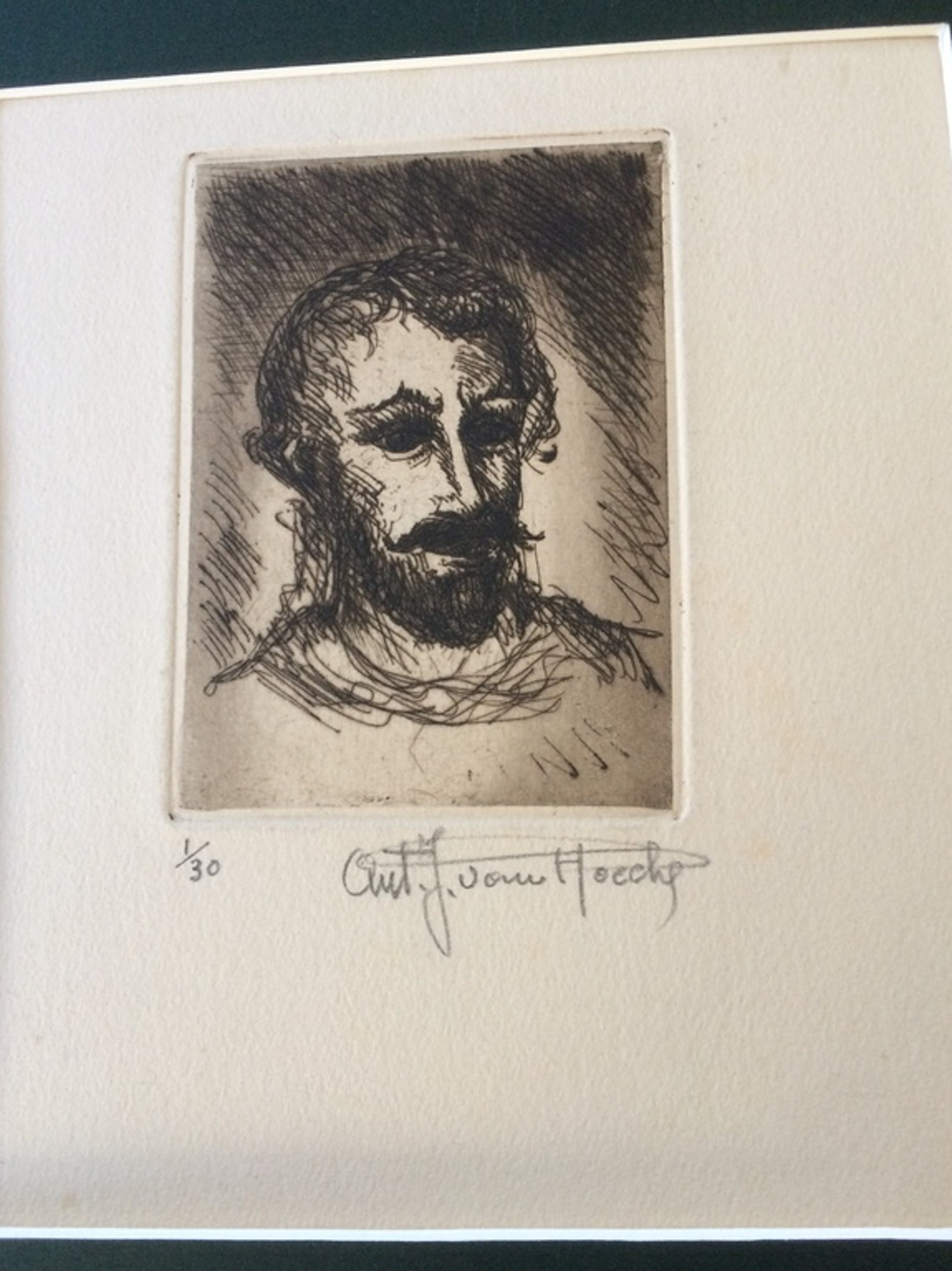 Antoon Jules van Hoecke ( Gent 1899 - Sint-Niklaas 1991) was gerenommeerd Vlaams schilder, aquarellist en etser. Behoorde tot de zgn. Gentse school,; volgde in Gent de Kunstacademie. In zwart passe-partout. Het werk is in goede conditie.
