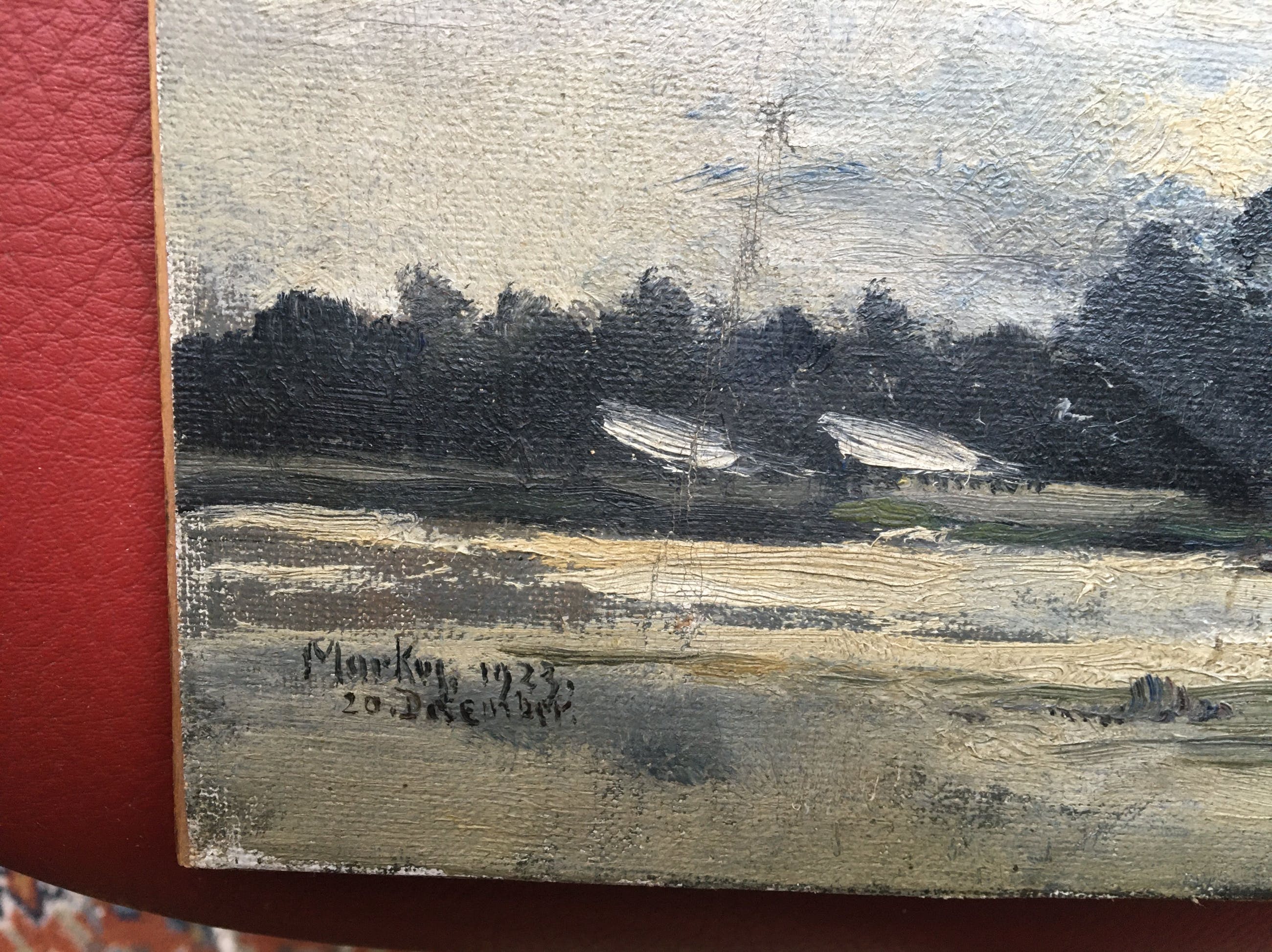 Het doek heeft ooit n vouw gehad, links van het midden. Door het maroufleren is dat vrij goed hersteld maar niet onzichtbaar geworden.Verdere conditie goed. Vernis niet vergeeld.