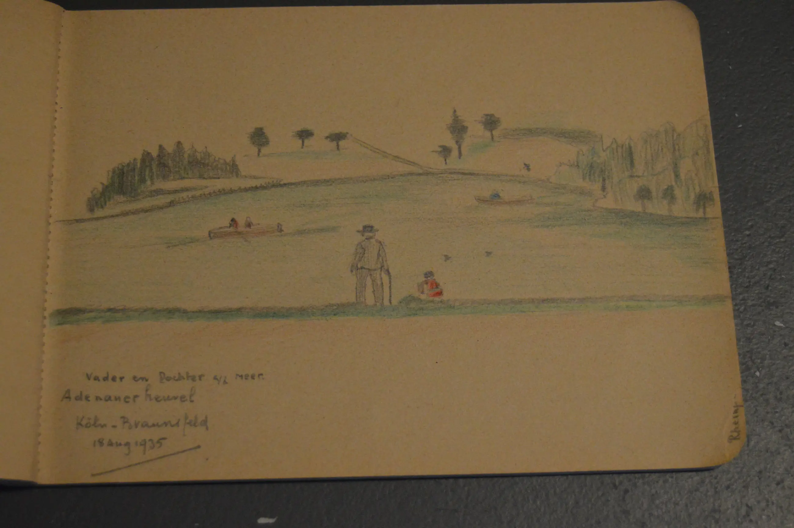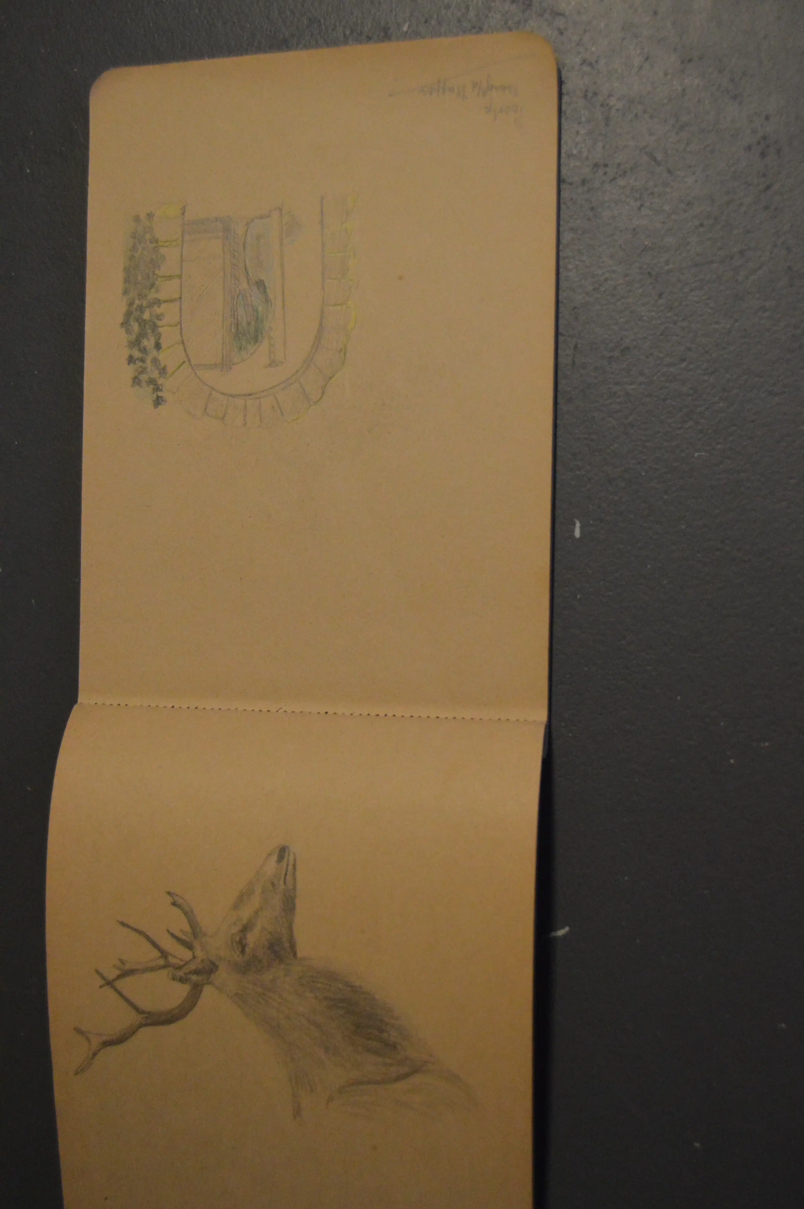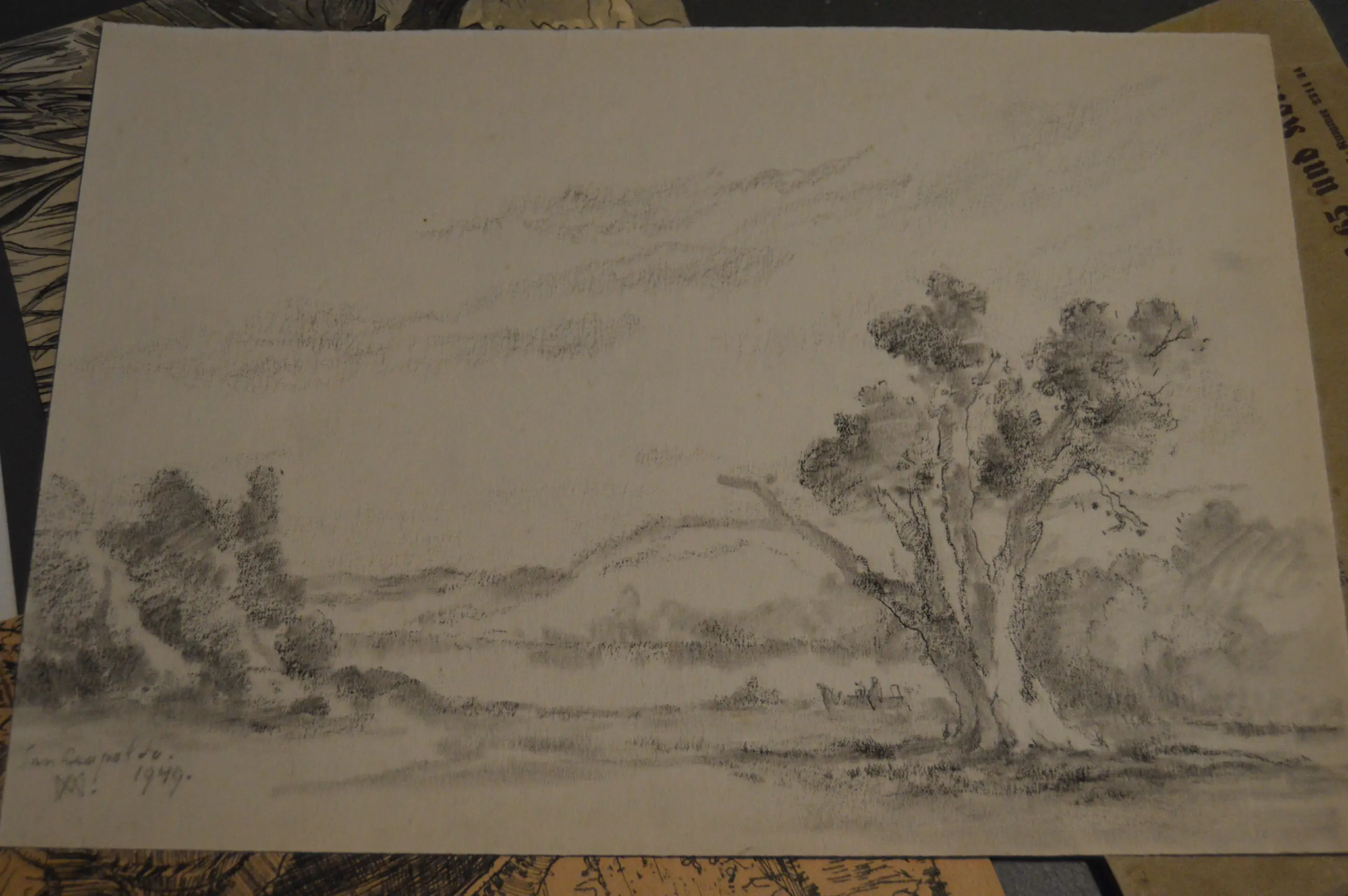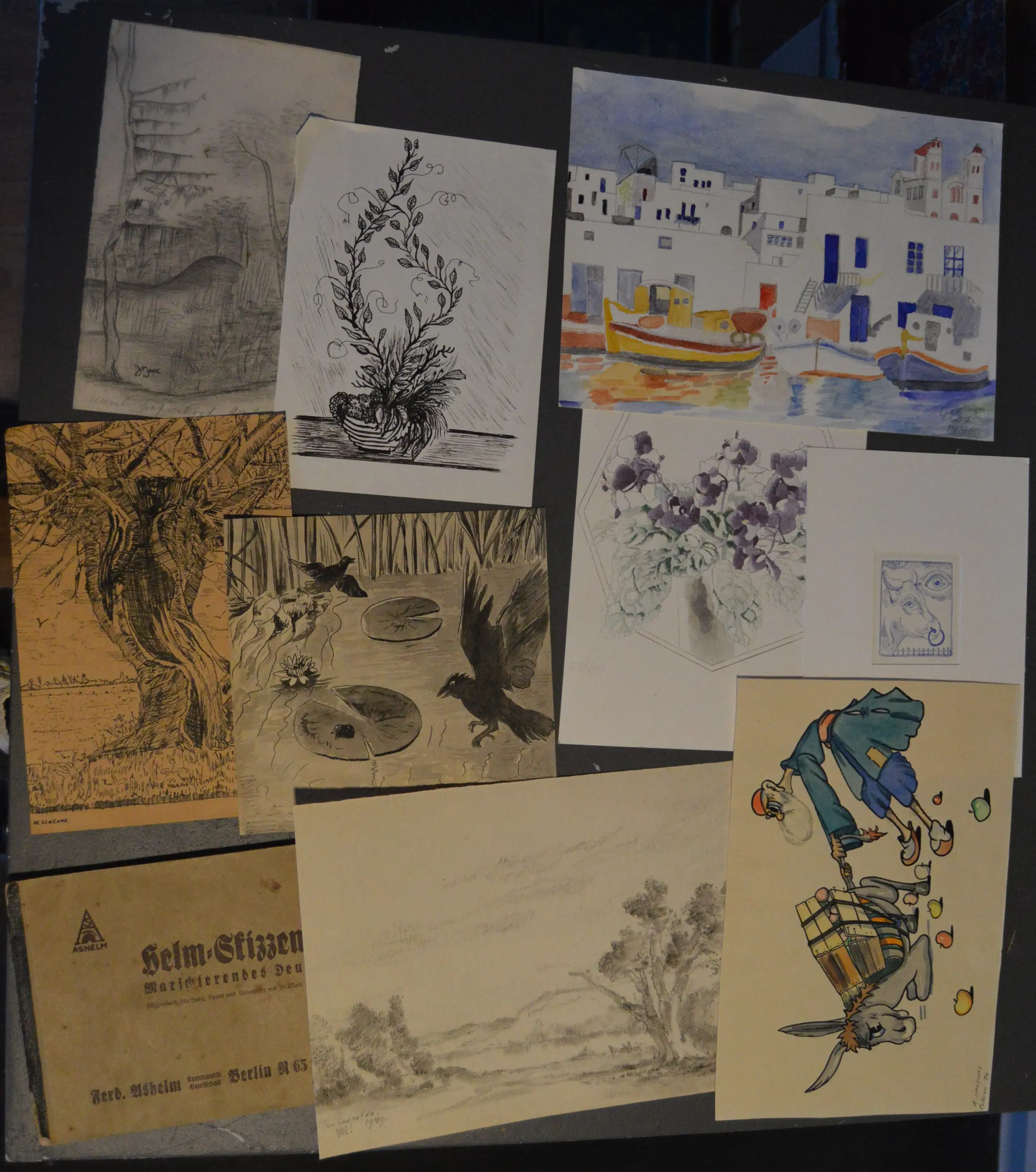 9 {ingekleurde} tekeningen en een schetsboek uit ca 1930. vnl gesigneerde werken. Helaas meest onduidelijk. Landschap Markus potlood, 29 x 20 cm. water met vogels. Anssems, inkt en waterverf.18 x 18 cm. De eenzame. Potlood. 22 x 15 cm. Plantenbakje. 20 x 15 cm. Heuvel papierkorf. 1926. Potlood. 22 x 14 cm. Mediterraan, ingekleurde tekening. Ploon 1999. 28 x 20 cm. Ezel ingekleurd. inkt. 27 x 19 cm. Koe, ingekleurde ets. Yvonnen 1985. 6 x 5 cm Vaas met bloemen. litho. 25 x 18cm. Schetsboekje met 16 pagina's schetsen en tekeningen. Meest gedateerd en beschreven