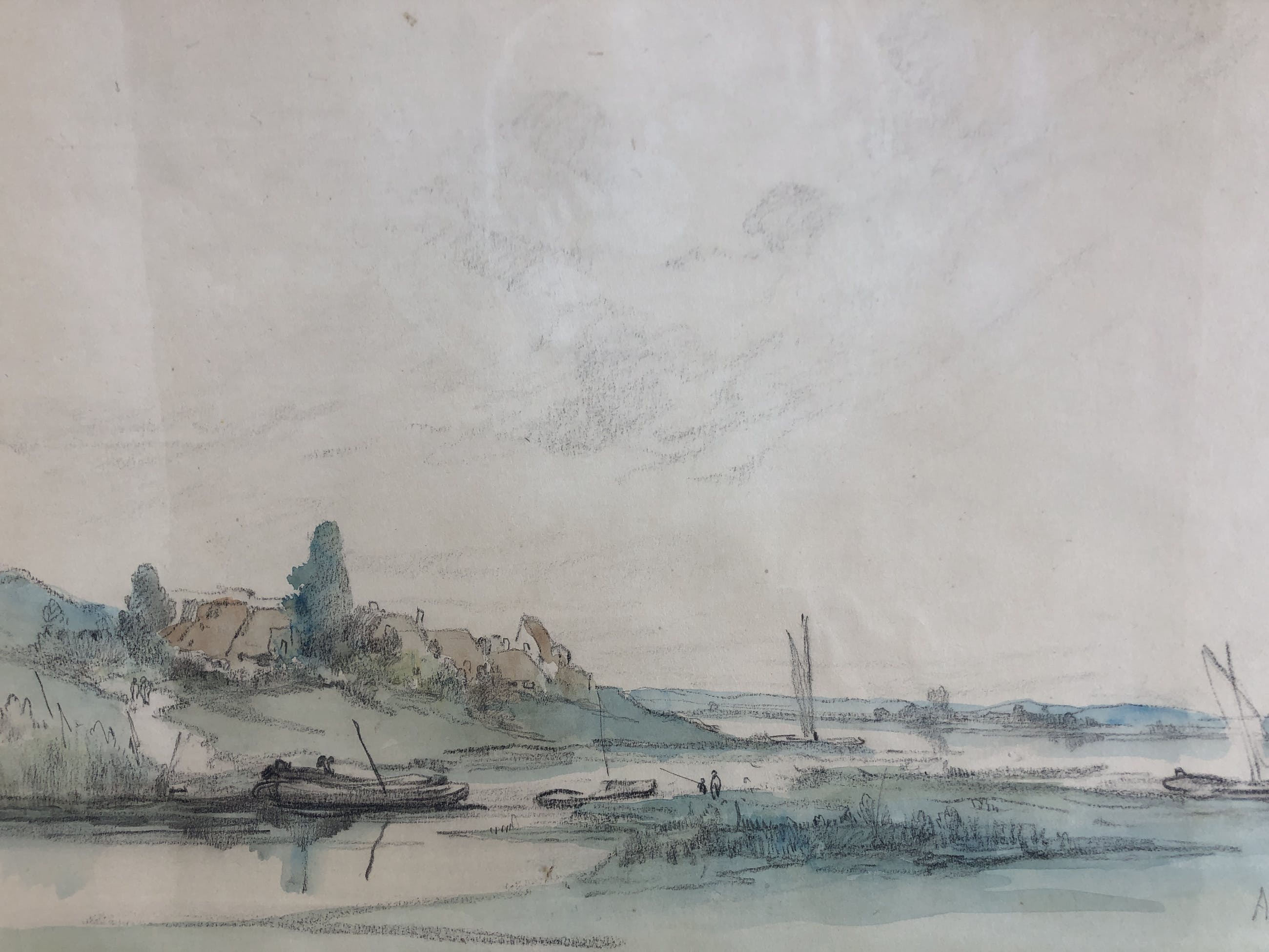 De aquarel met krijt tekening is wat vergeeld. De ouderdom is in papier getrokken. Vandaar de lage instap prijs.