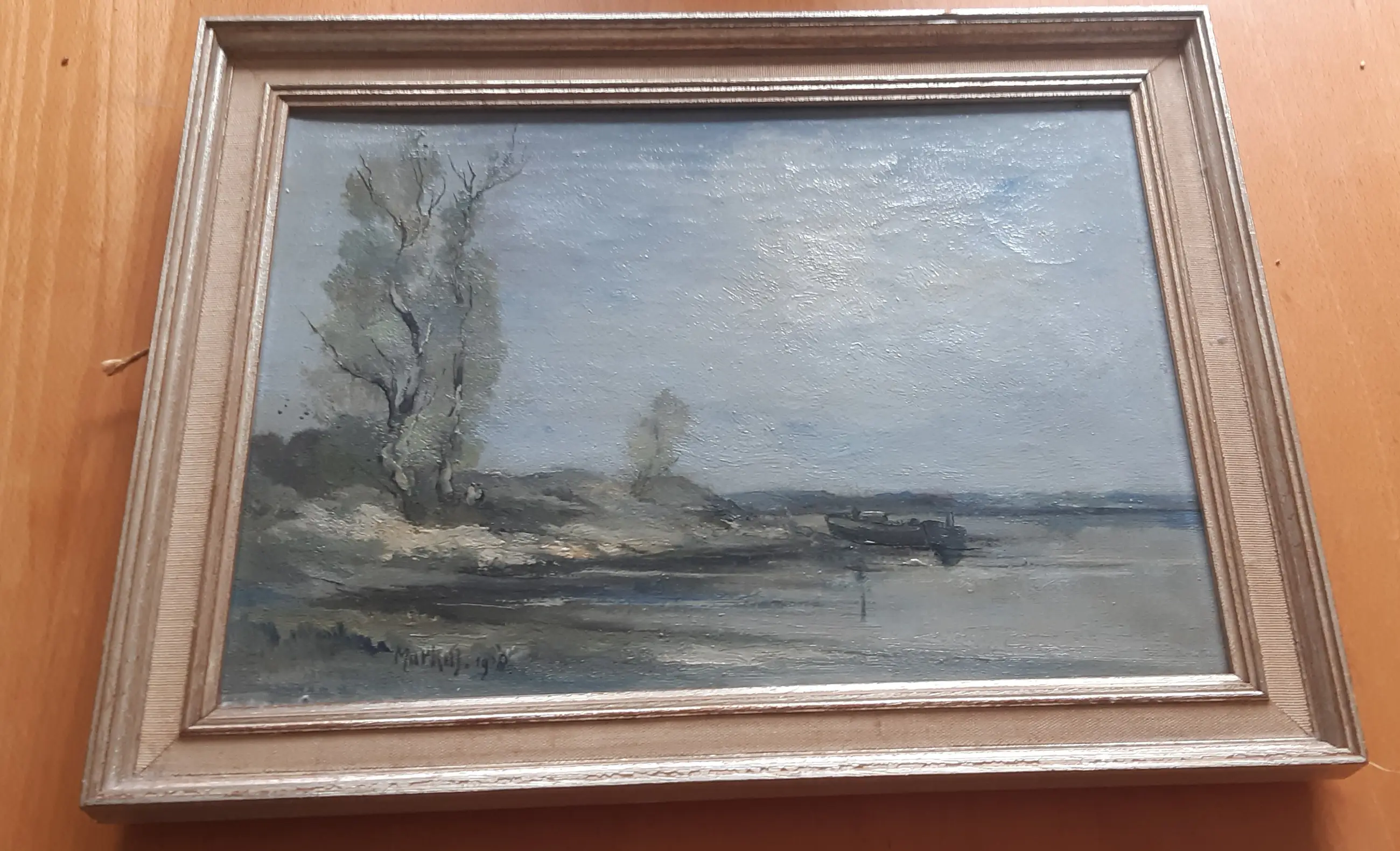 Landschap met olieverf geschilderd, een oever met een boot aangemeerd in blauwe en wat grijsgroene tinten.