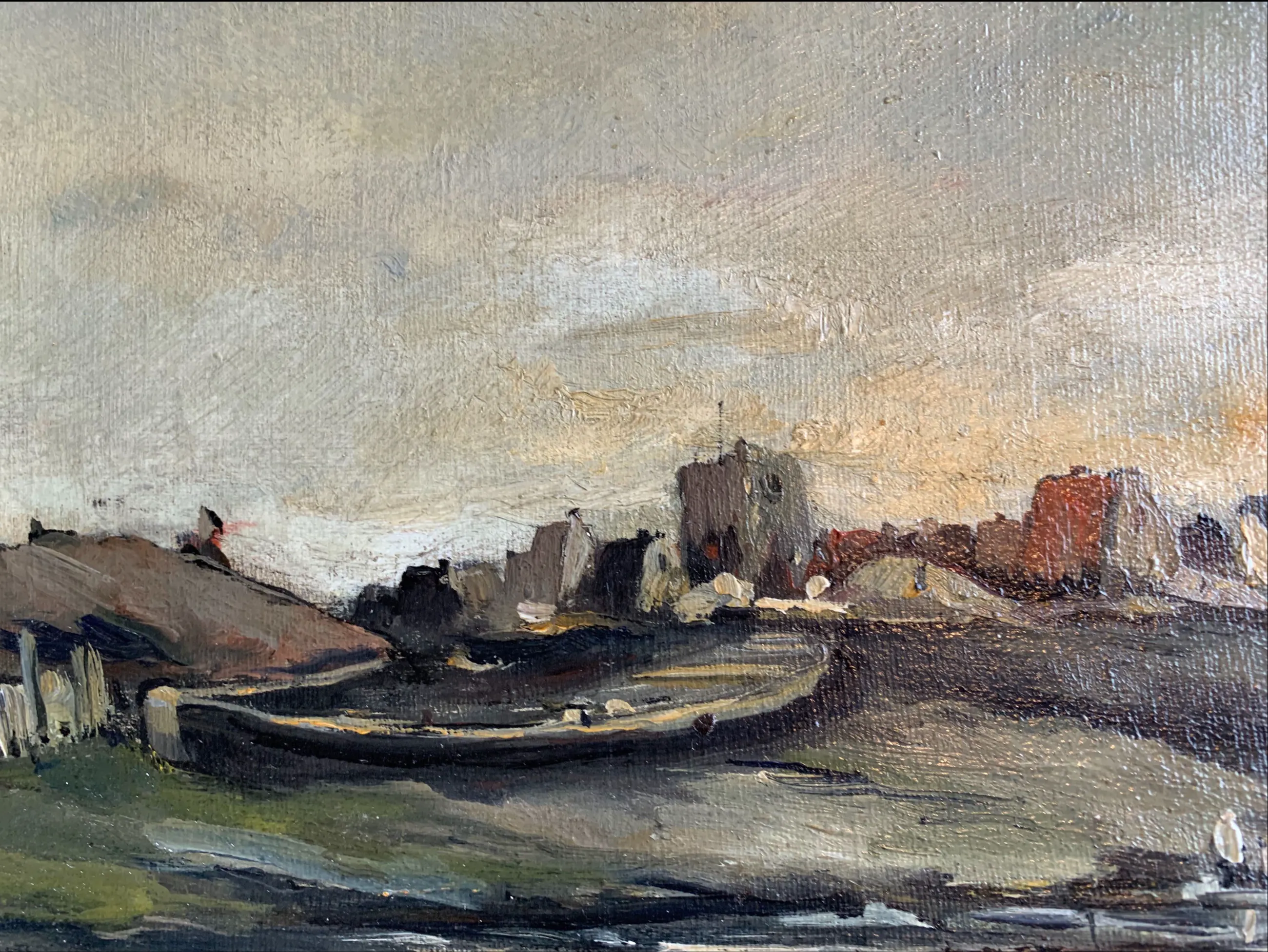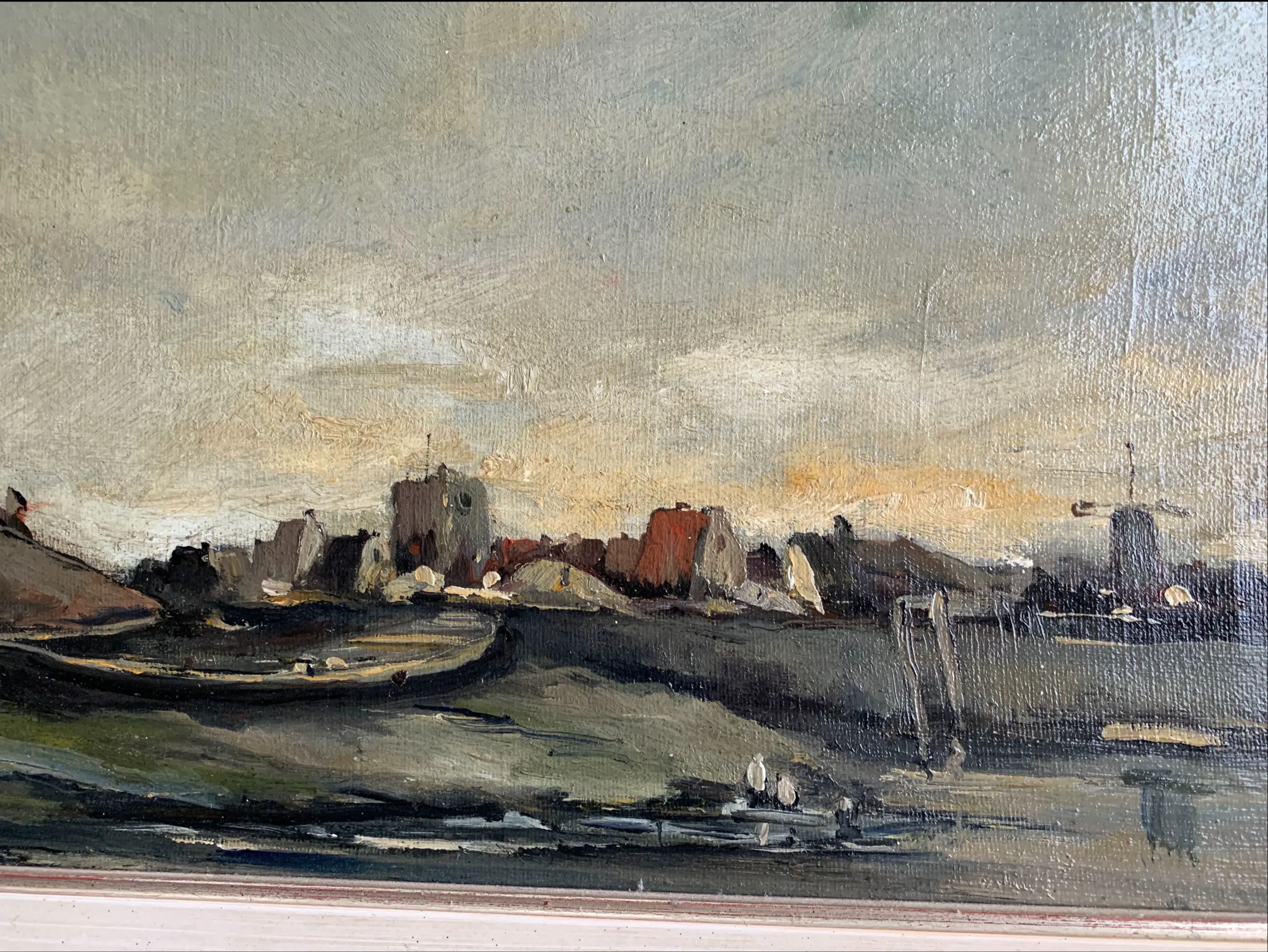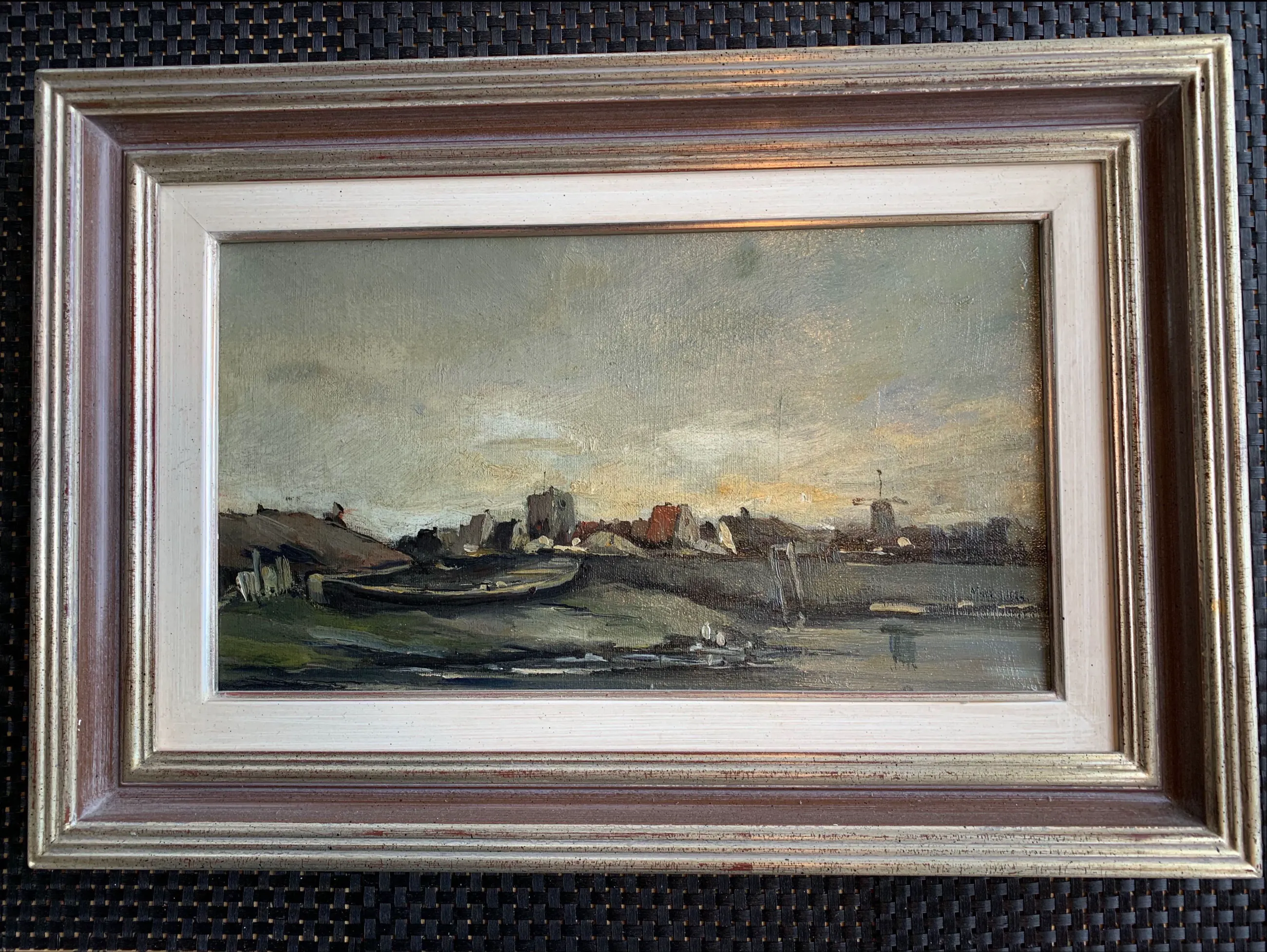 Hij schilderde onder invloed van de ‘Barbizonners’ ondermeer landschappen met boerderijen en riviergezichten, zoals ook in dit werk te zien is. Voorstellend een rivier-landschap met scheepshelling en stadje op de achtergrond met molen en kerktoren.