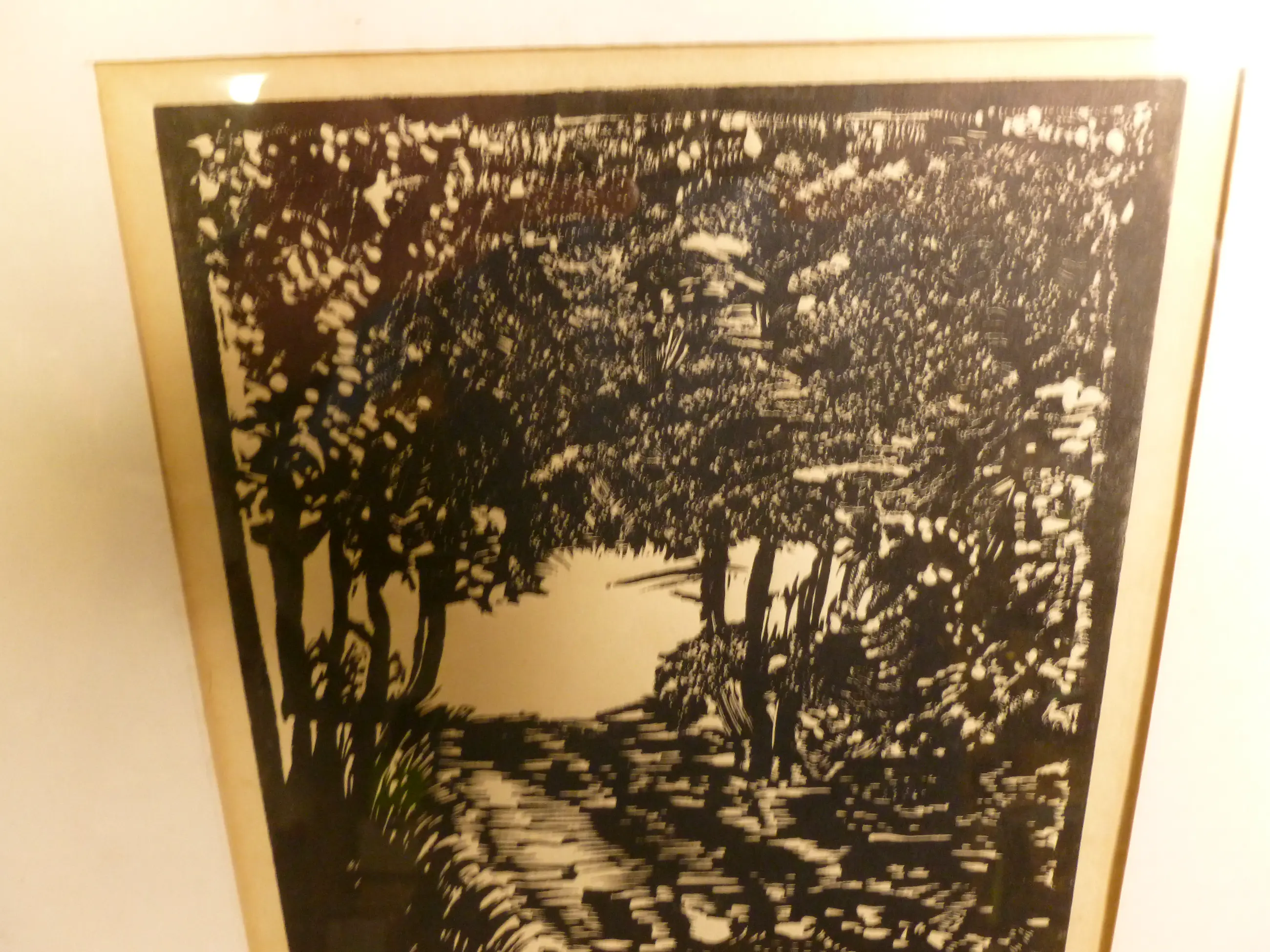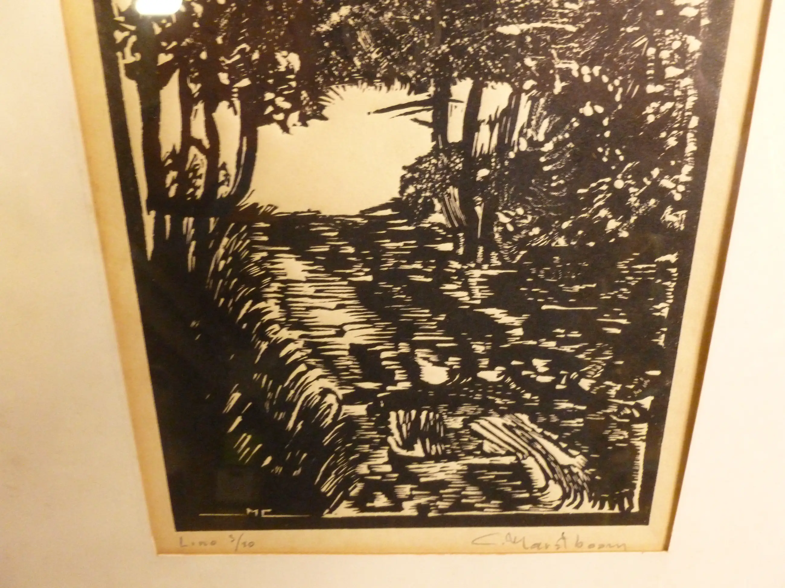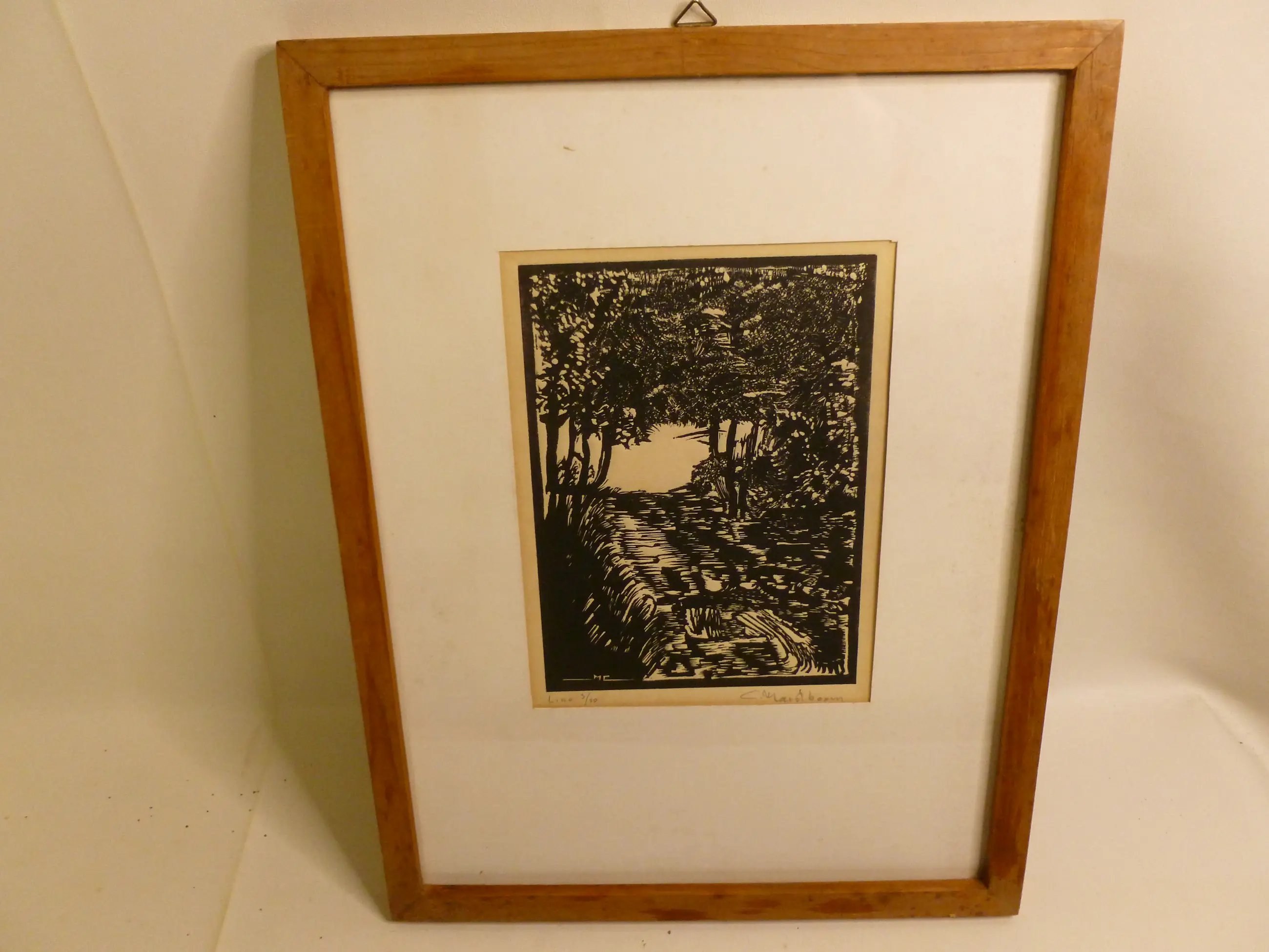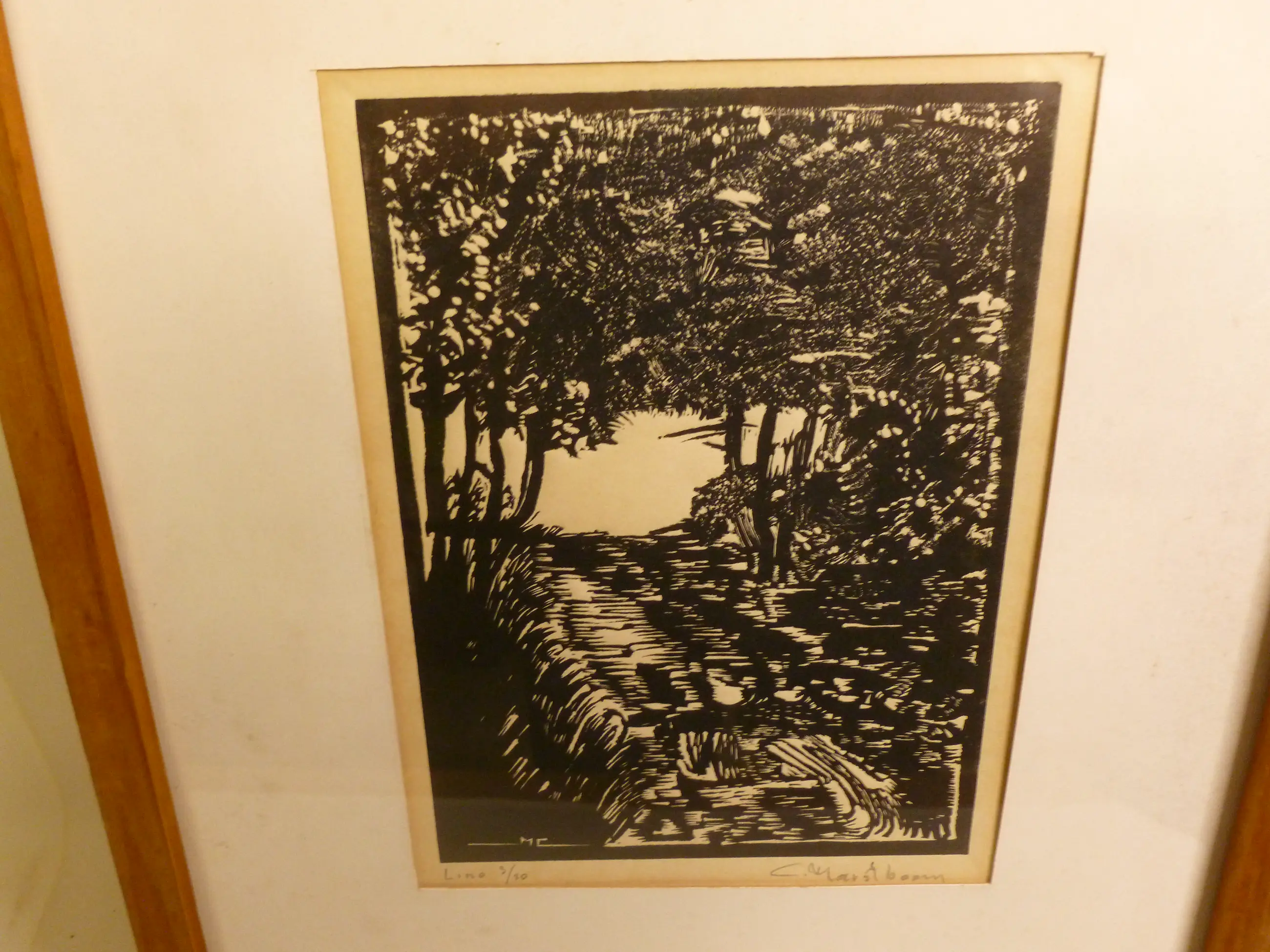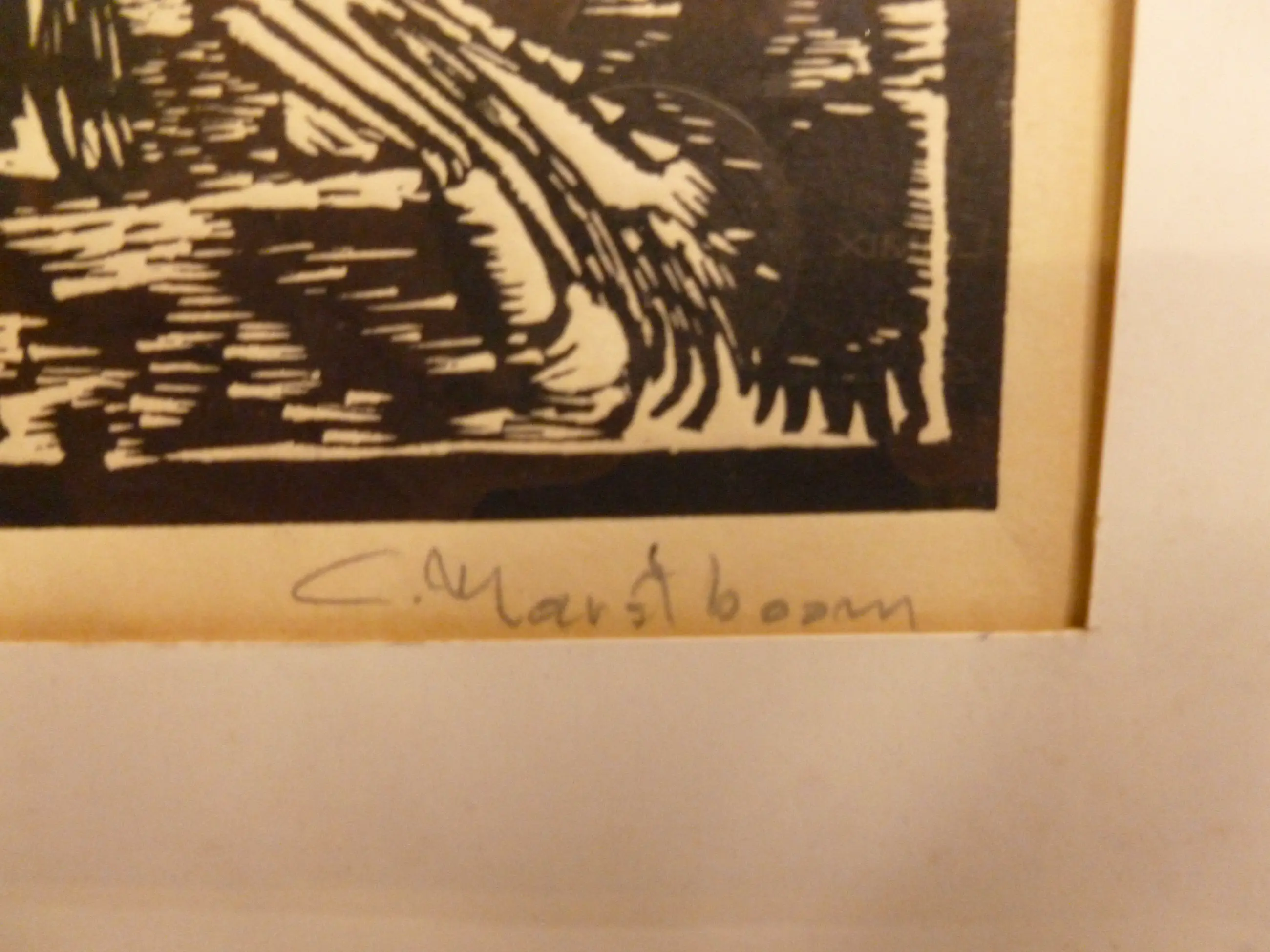 Deze linosnede van Marstboom zit nog in de originele kader en heeft volgende afmetingen:Werk 16,5 op 22 cm en kader 32,5 op 42,5 cm.