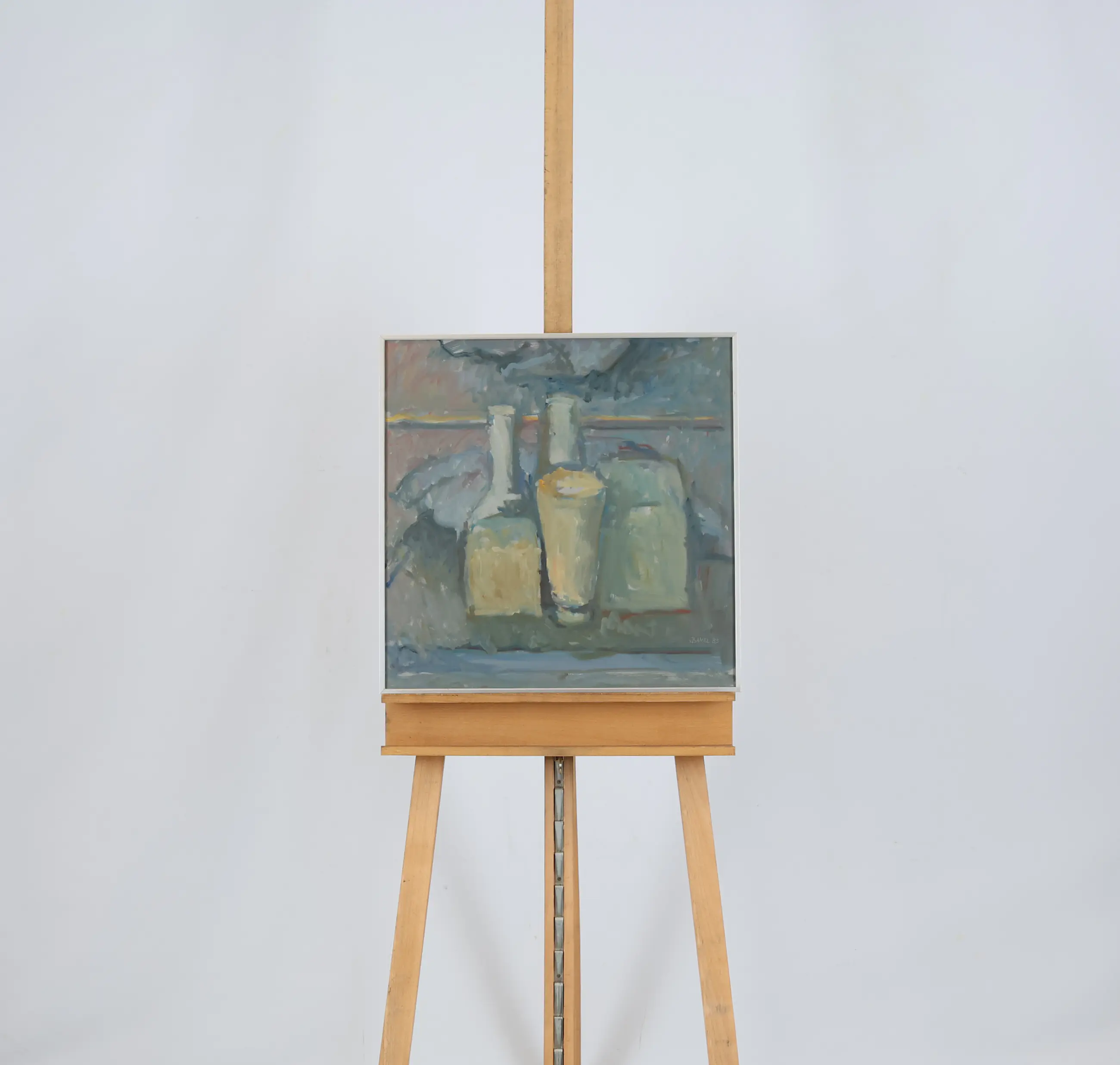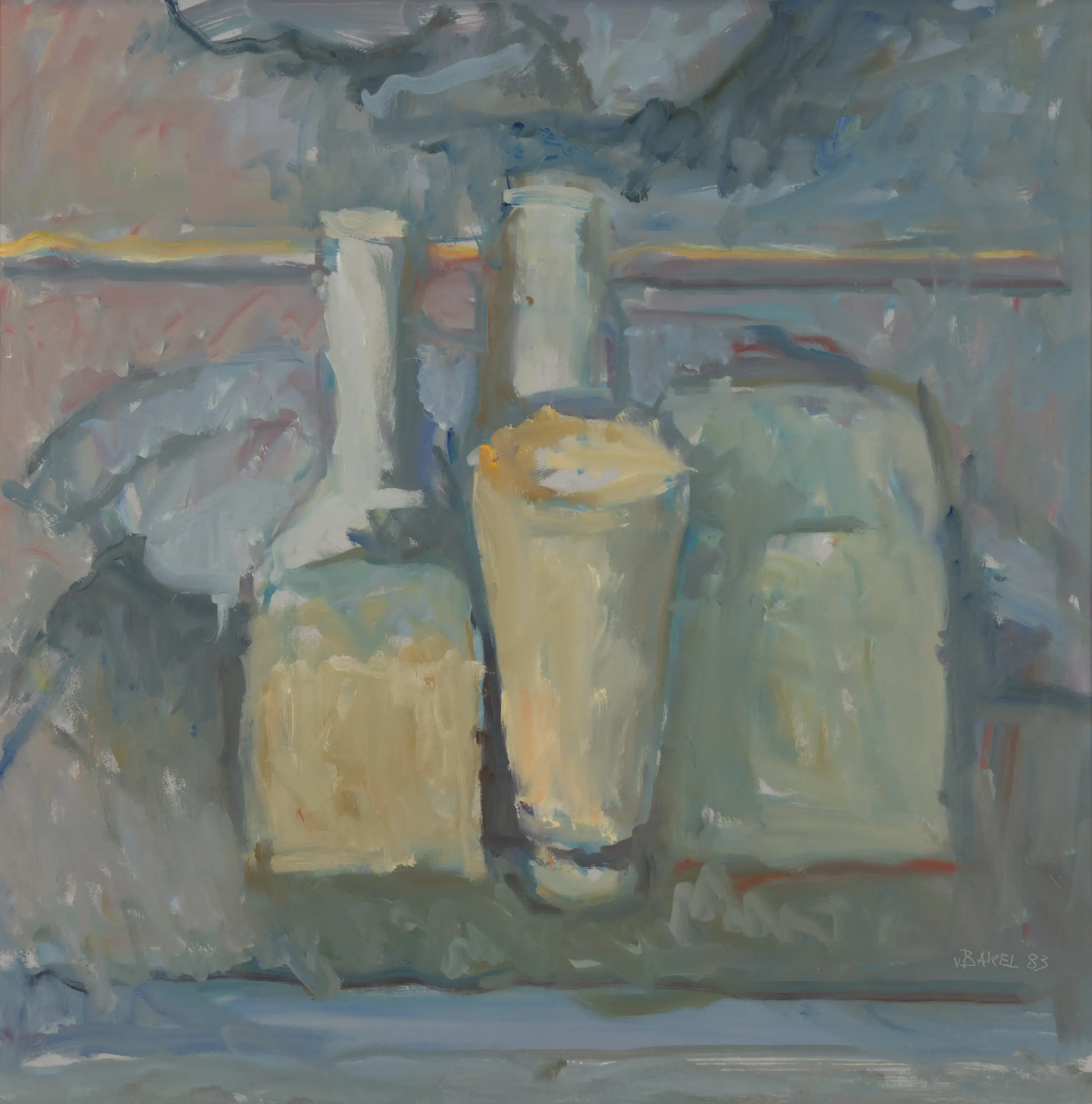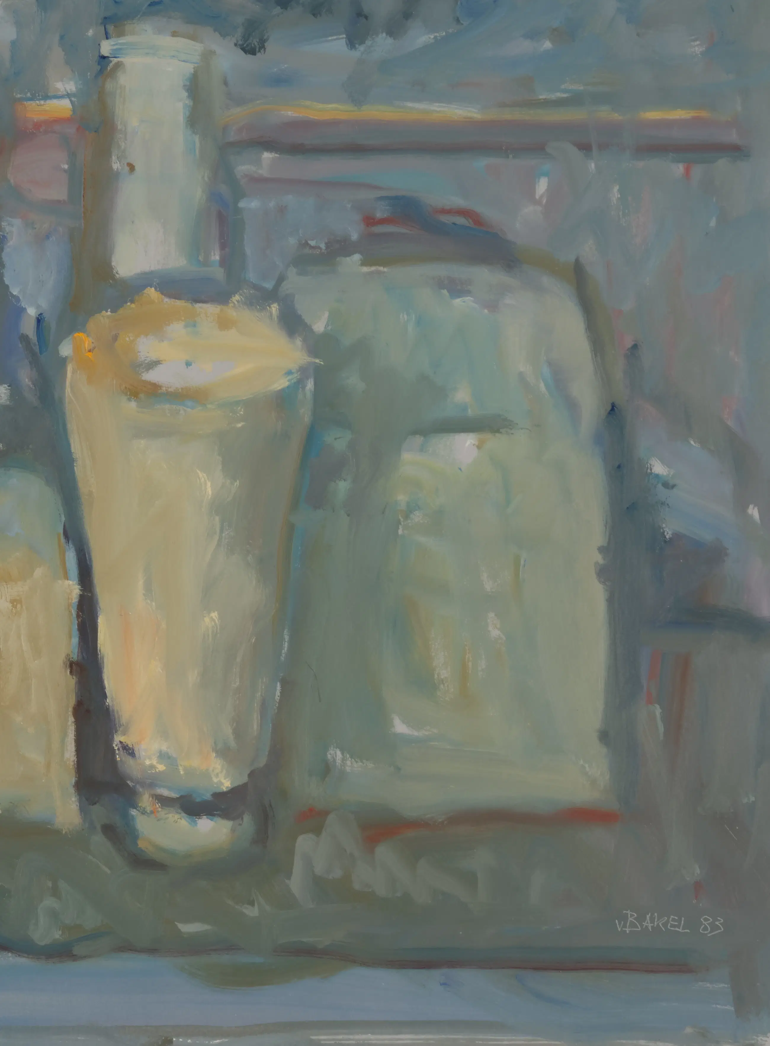 In dit schilderij staat het spel tussen vorm en kleur centraal. De contouren van flessen en potten lossen bijna op in een netwerk van brede, dynamische penseelstreken. Het werk is geen exacte weergave van een stilleven, maar een vertaling van licht, ruimte en sfeer.