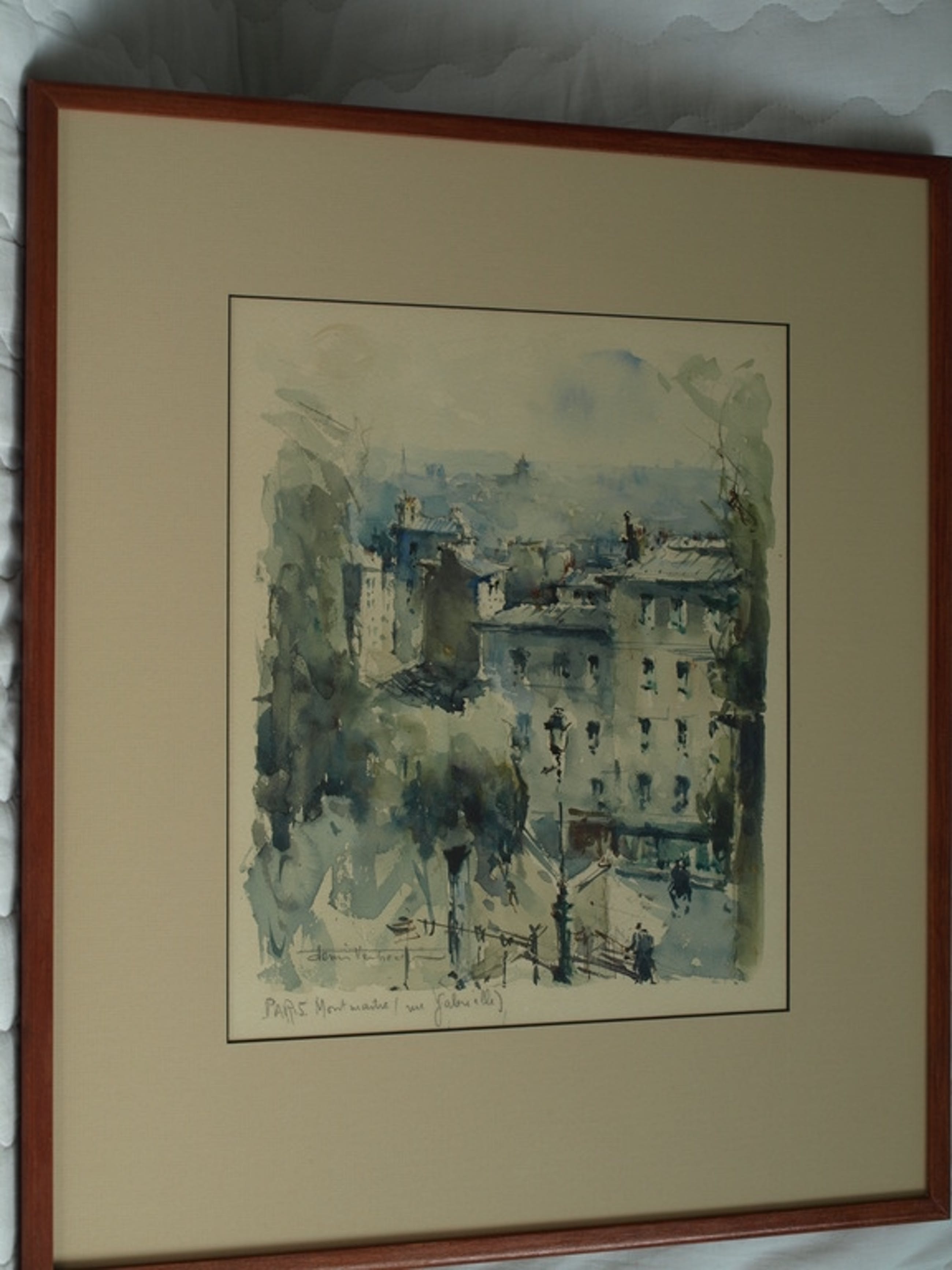 Een bijzonder mooie en sfeervolle impressionistische aquarel van de rue Gabrielle in de wijk Montmartre in Parijs.