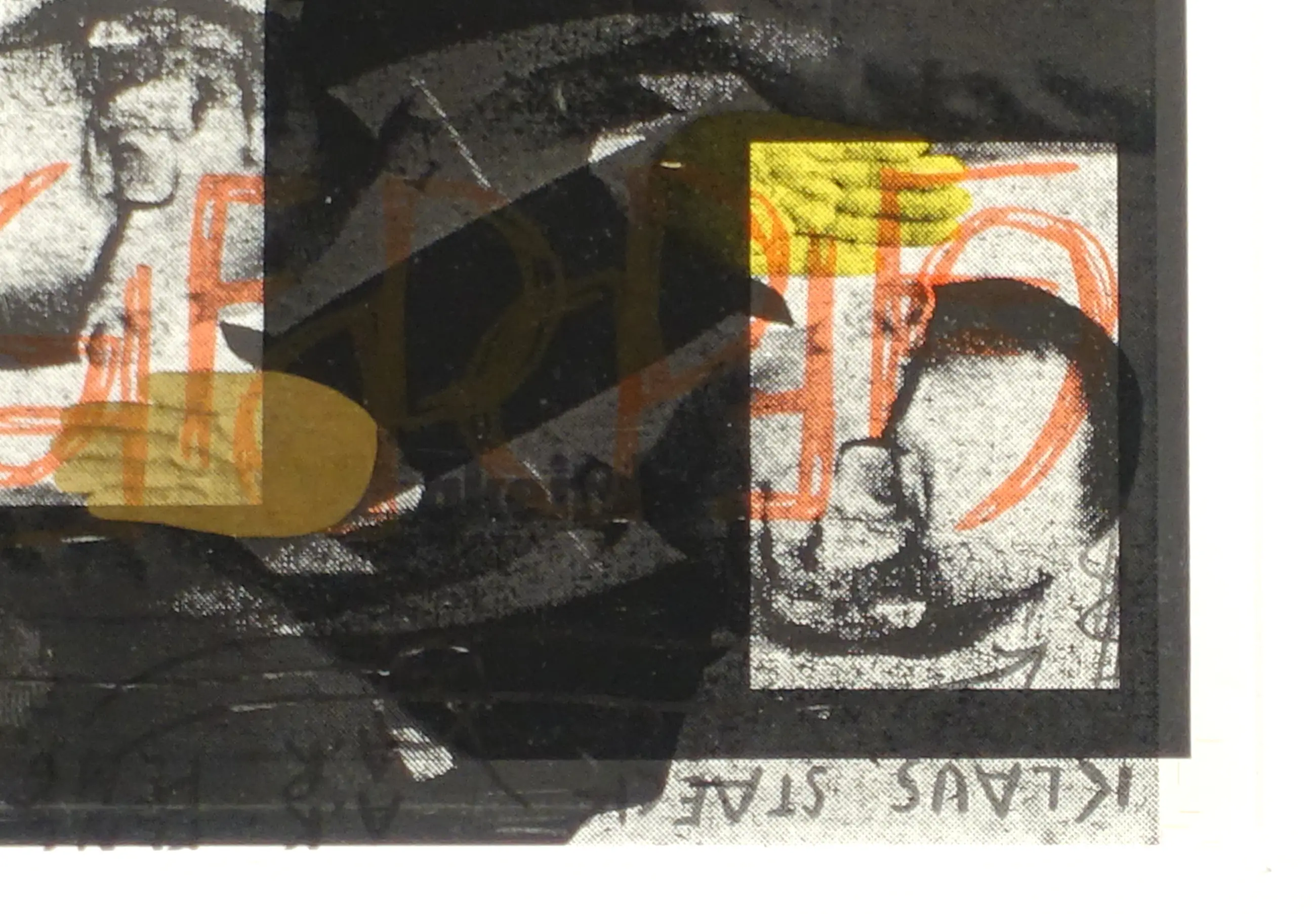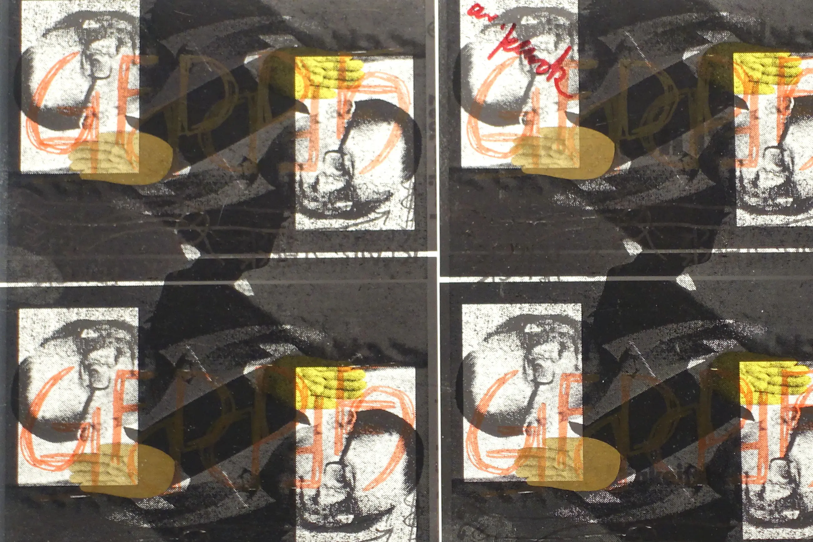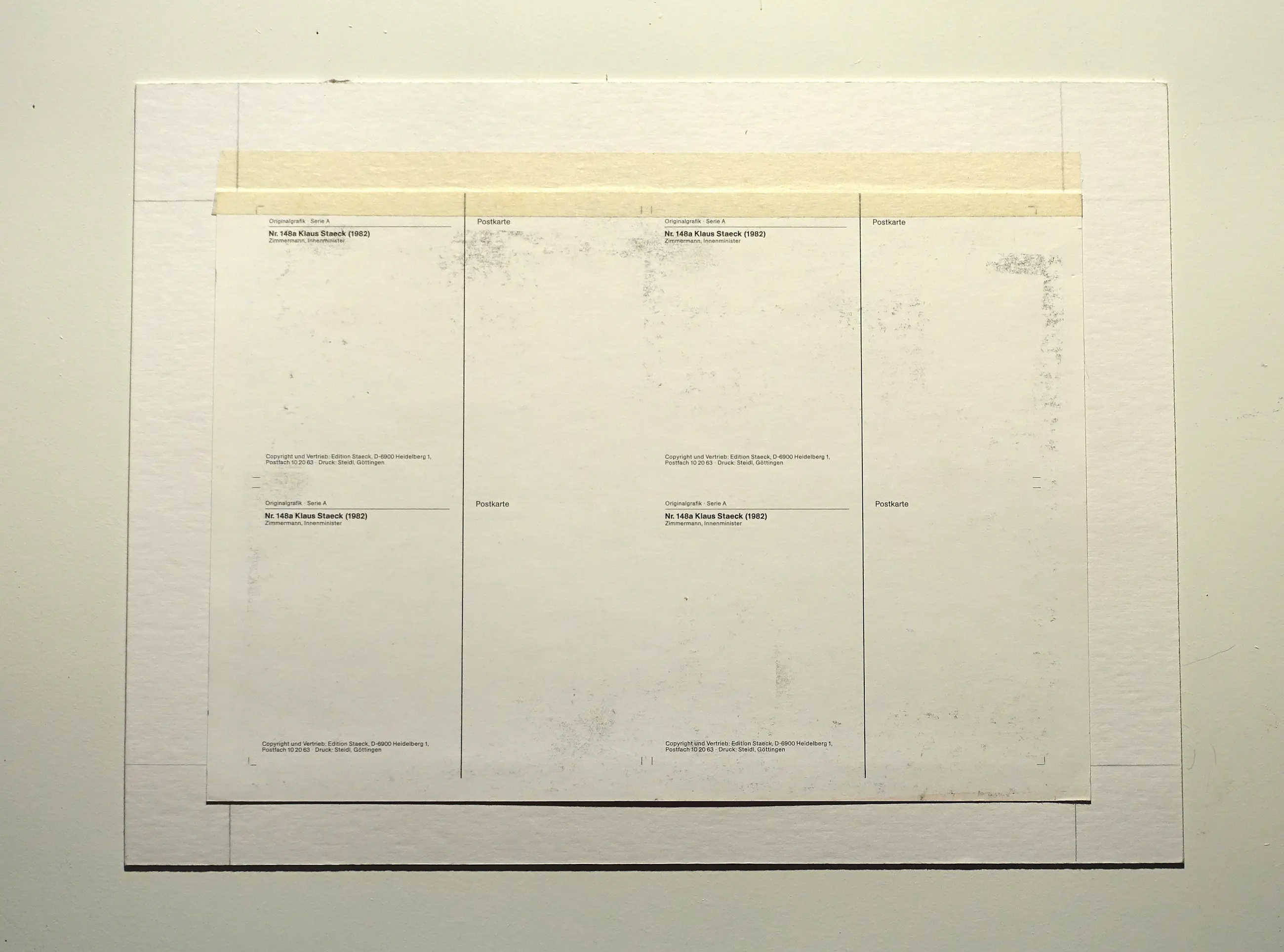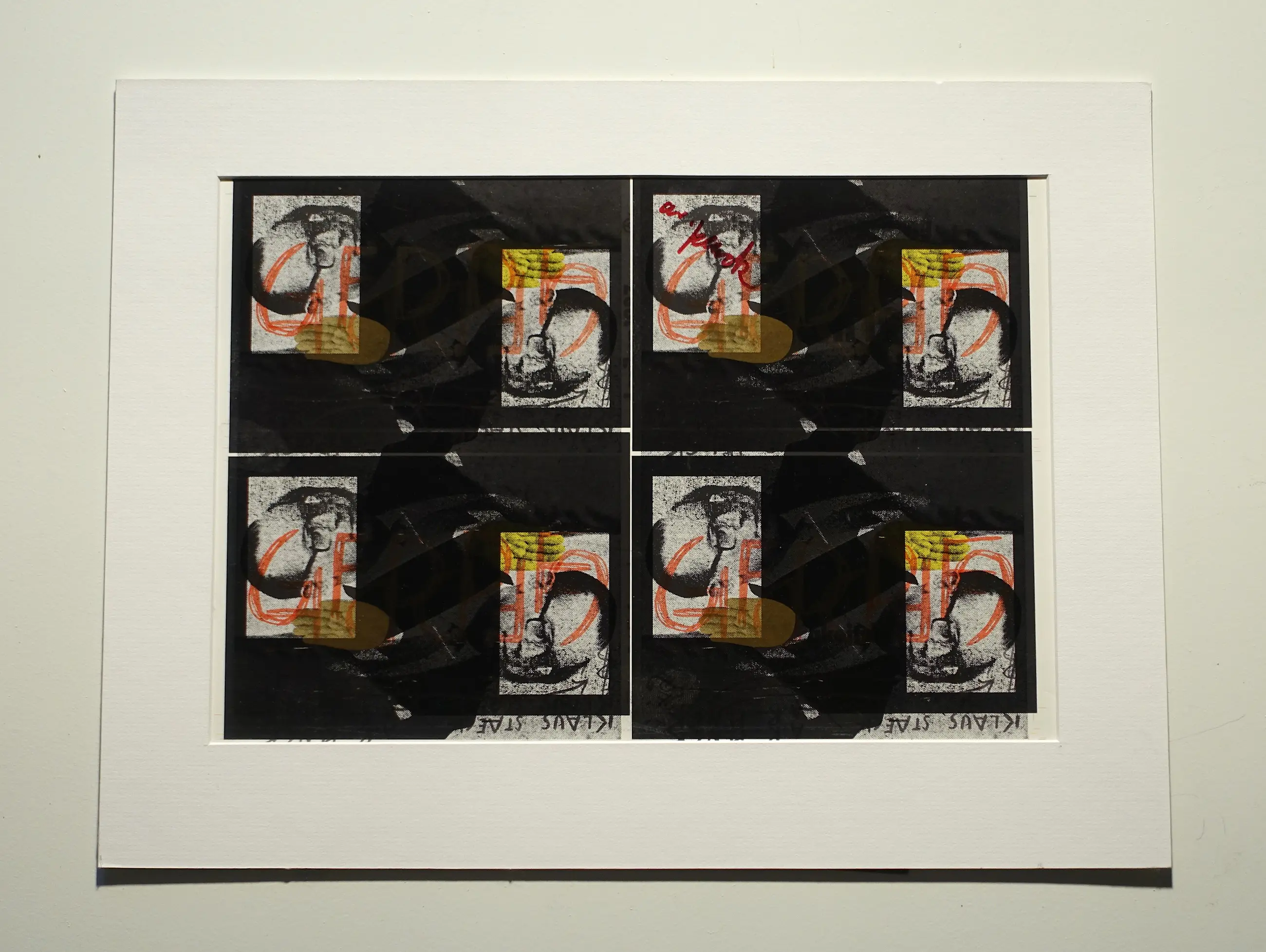 AR Penck overschilderde het gedrukte citaat en maakte vermoedelijk een fotokopie van de gehele collage met de vier ansichtkaarten, die hij met rode verf signeerde.
