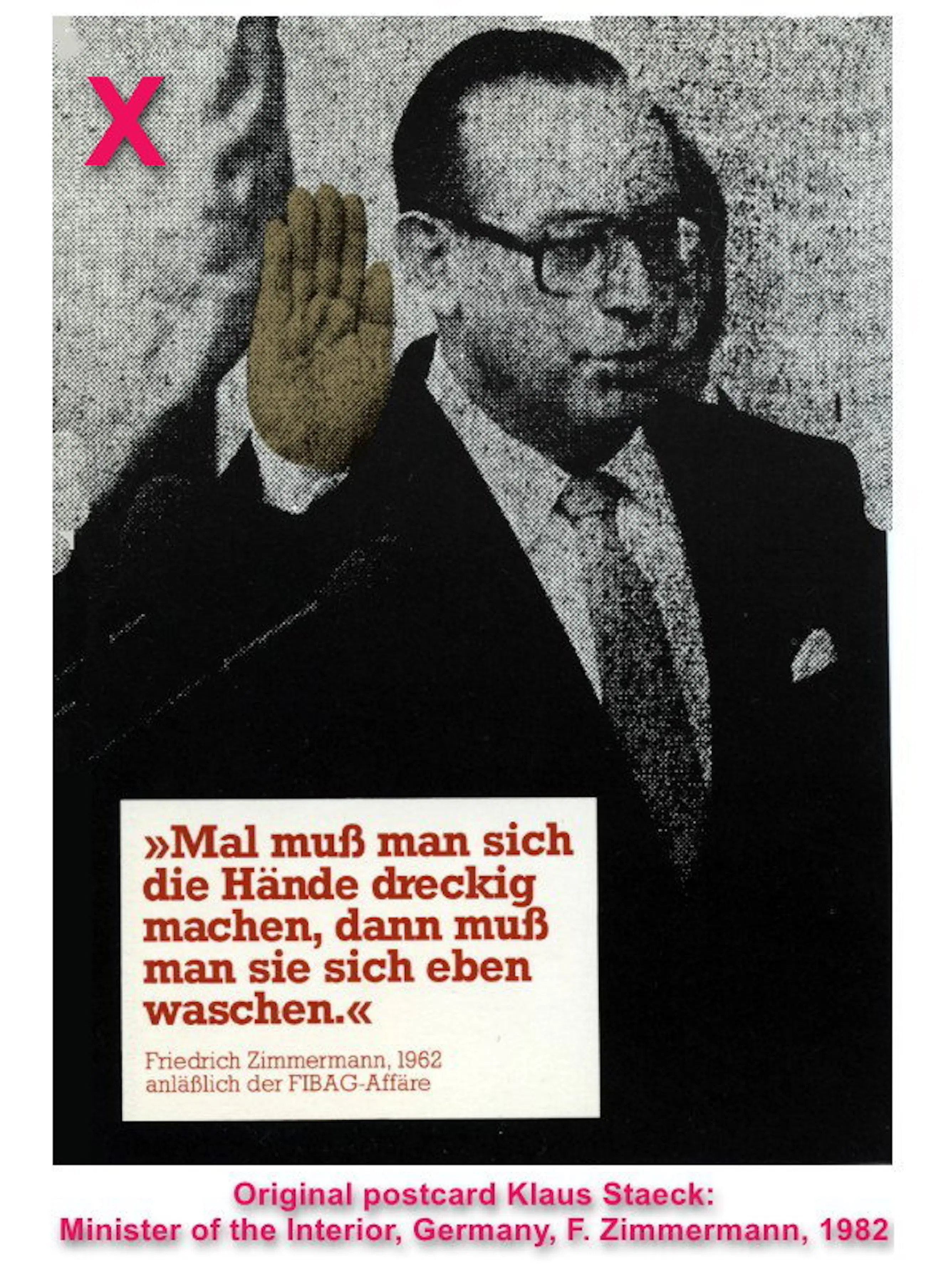 Dit is een collage van vier ansichtkaarten. (Een afbeelding van de ansichtkaart die AR Penck gebruikte, is te zien op afbeelding X). De ansichtkaarten zijn van de satiricus Klaus Staeck (nr. 148a / 1982). Ze tonen de toenmalige Duitse minister van Binnenlandse Zaken, Friedrich Zimmermann (1982-1989). Het citaat op de ansichtkaart luidt: "Soms moet je je handen vuil maken, dan moet je ze gewoon wassen." De bruine, opgeheven hand verwijst naar het Derde Rijk.