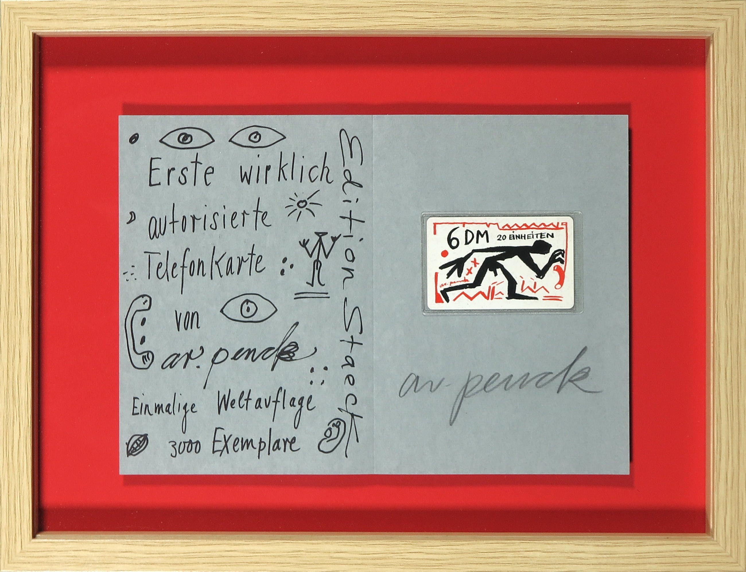 Handgesigneerde zeefdruk op vergé papier met een ongeopende 6 DM telefoonkaart. Uitgegeven in een oplage van 3000 exemplaren, echter zijn er maar weinig met de hand gesigneerd. Uitgegeven door Edition Staeck.