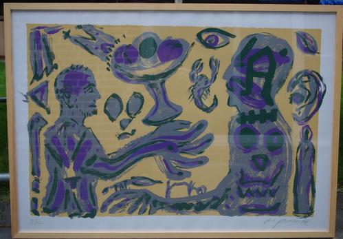 großformatige Litho, handsigniert, nummeriert 2/2, ca. 70 x 100 cm, in schlichtem Holzrahmen, sehr guter Zustand produktionsbedingt ist der äußere weiße Rand etwas wellig, was keine qualitative Einschränkung ist. Diese Grafik hat eine gute und dokumentierte Provenienz (Galerie) und ist keine der zahllosen e.a.-Arbeiten, die vielerorts angeboten werden.