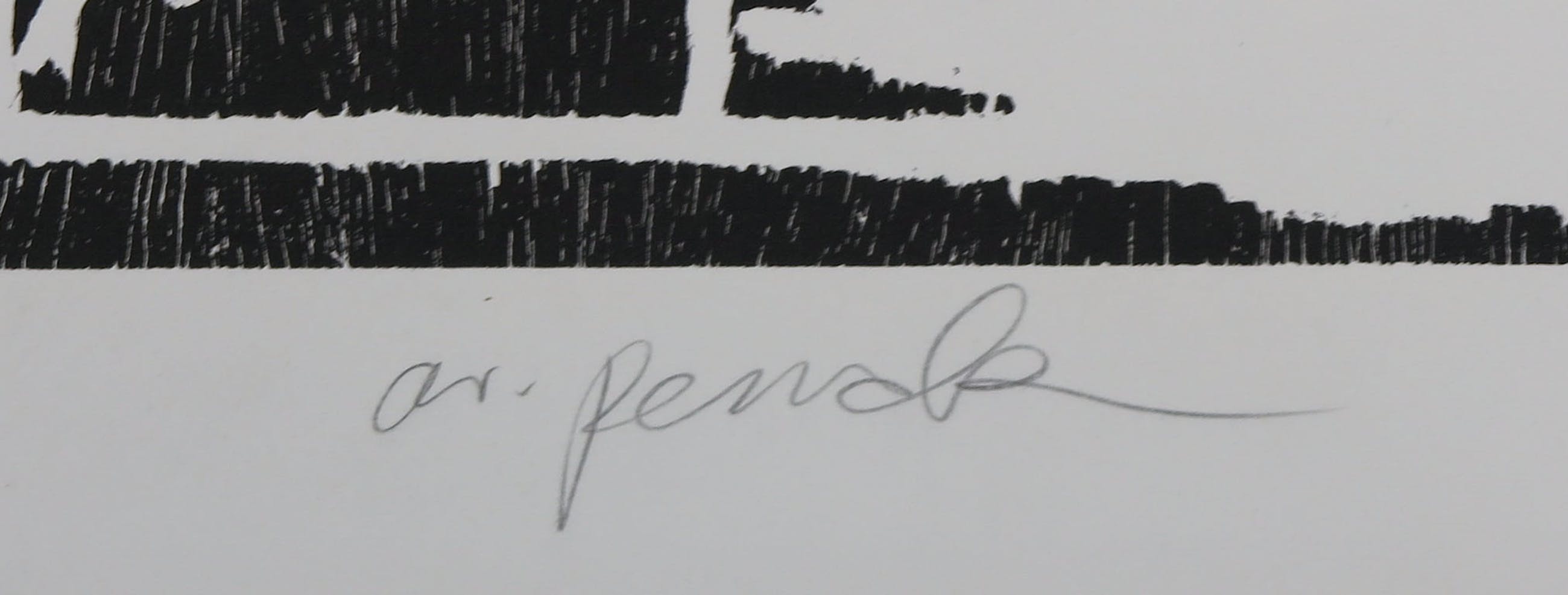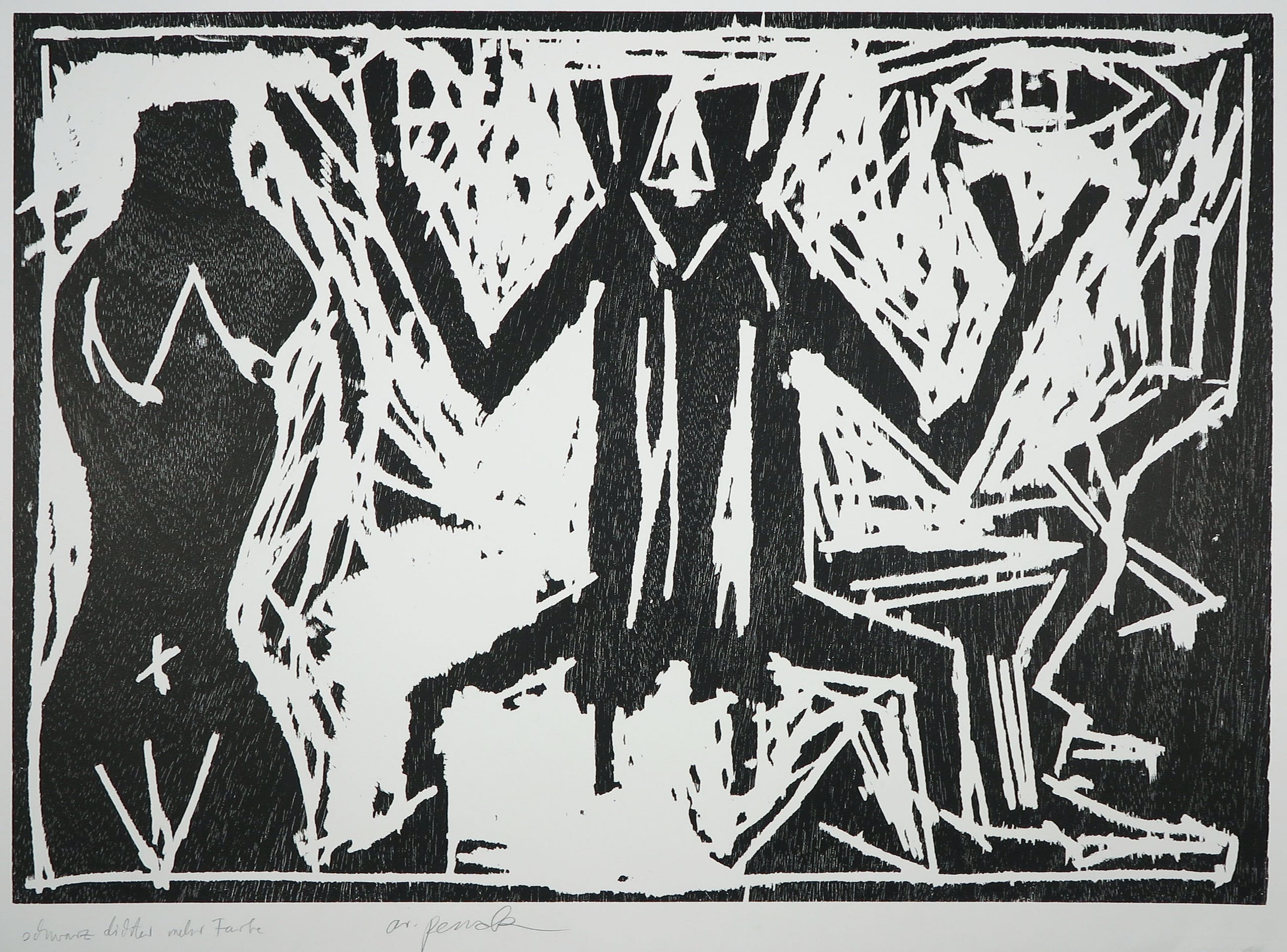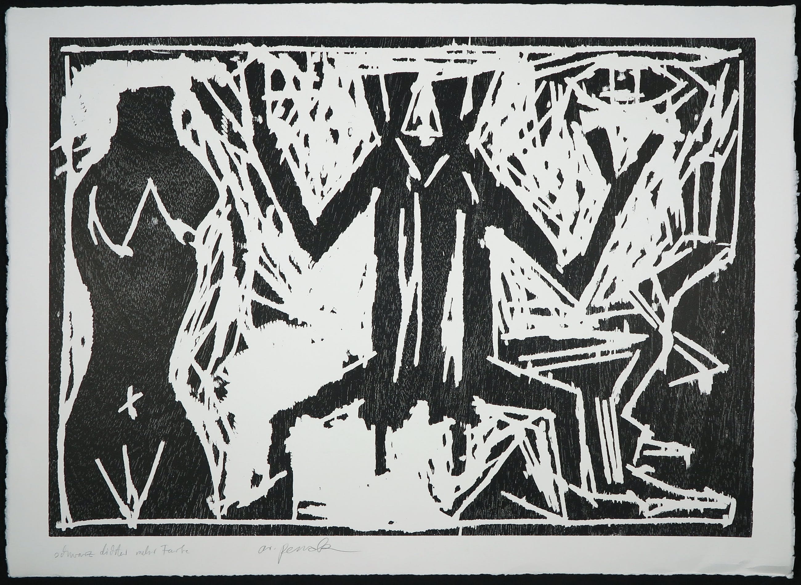 Zeldzame houtsnede van A.R. Penck, uitgegeven in een oplage van vijf stuks. Linksonder een notitie: Schwarz dichtet merh Far...