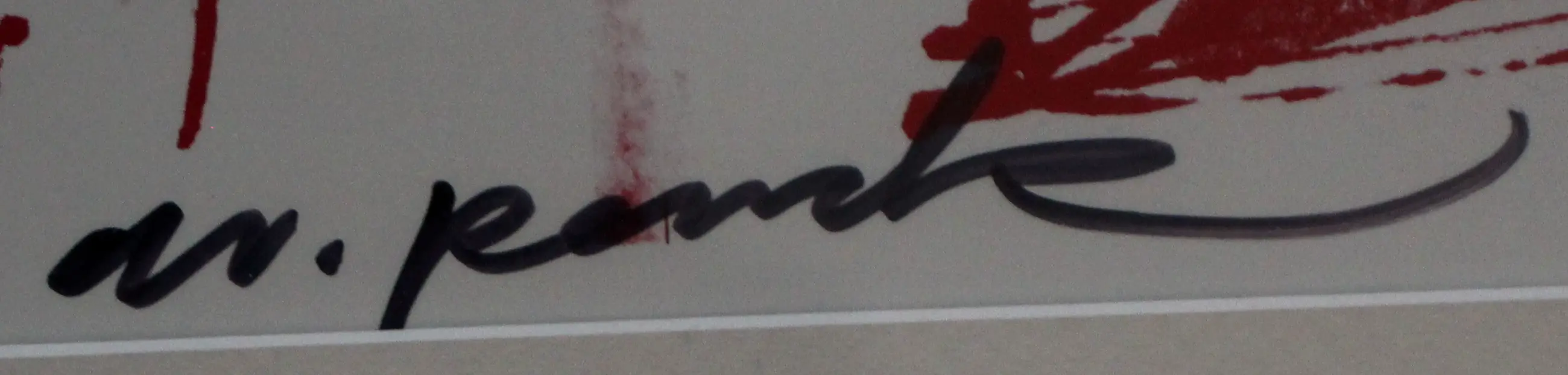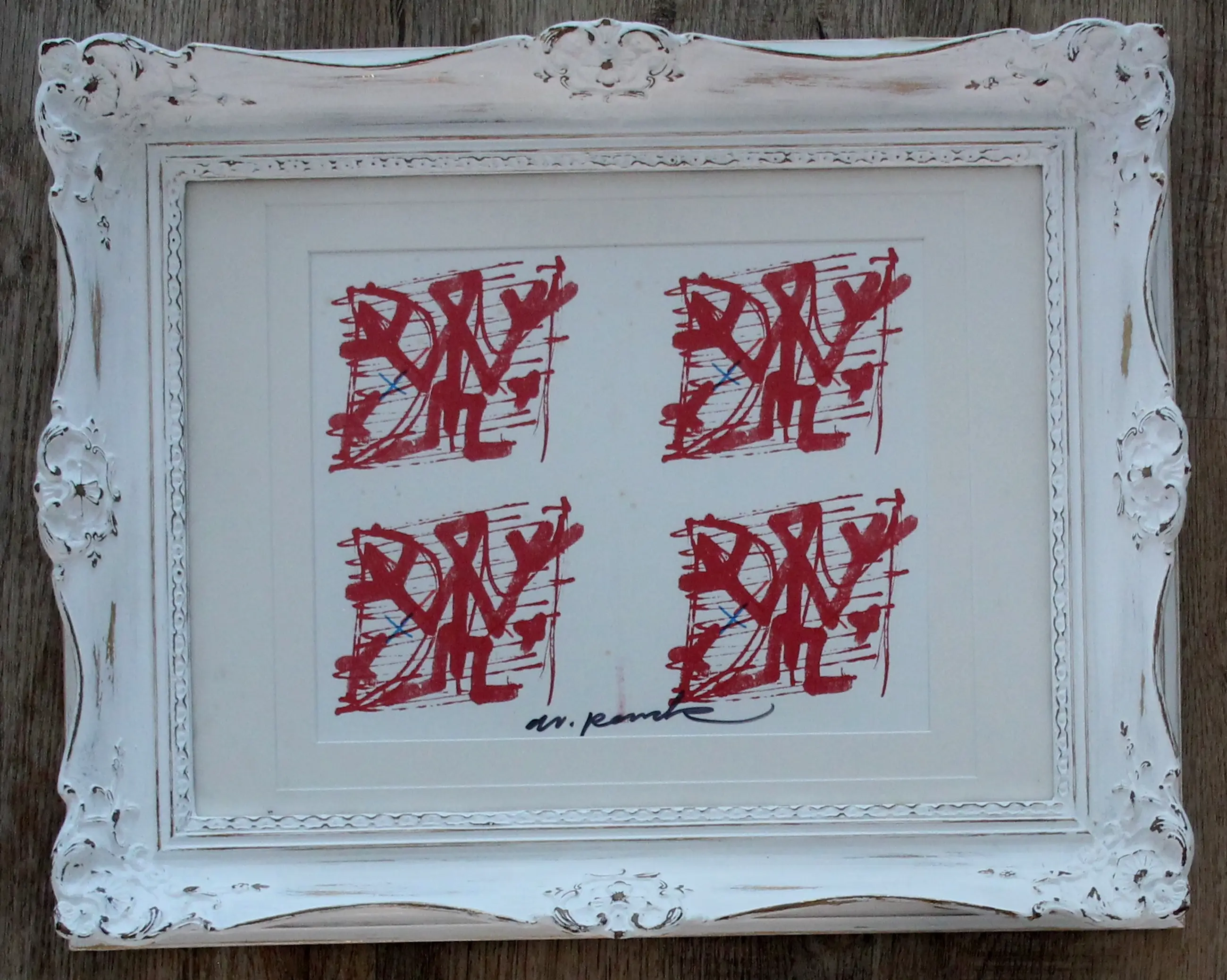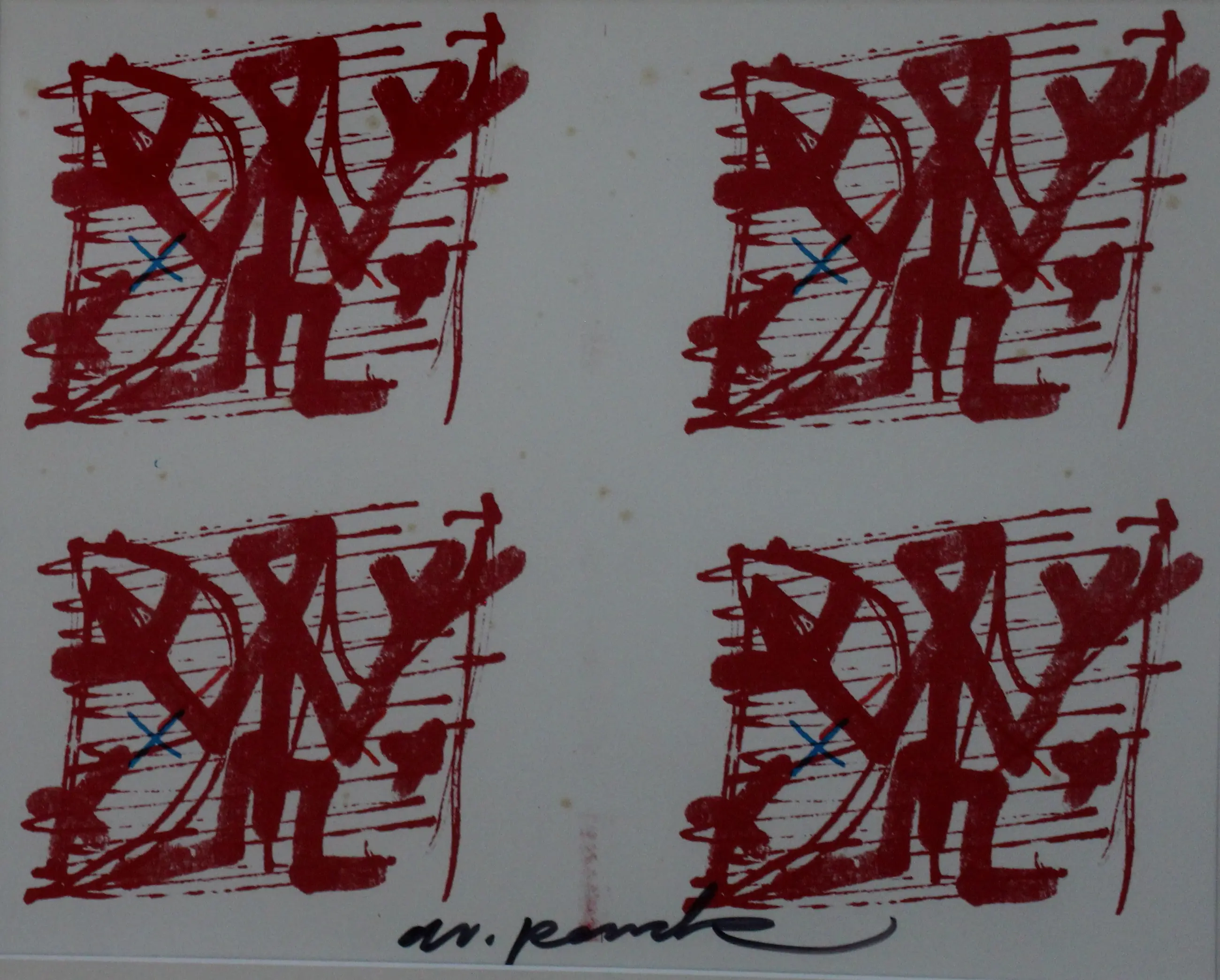 Offset litho op papier van A.R. Penck(Ralf Winkler). Titel: Unbekannte Gesellschaft. Afmetingen incl lijst: H41 x b51cm. Afmetingen voorstelling: H22.5 x b28cm. Het werk is midden onder gesigneerd
