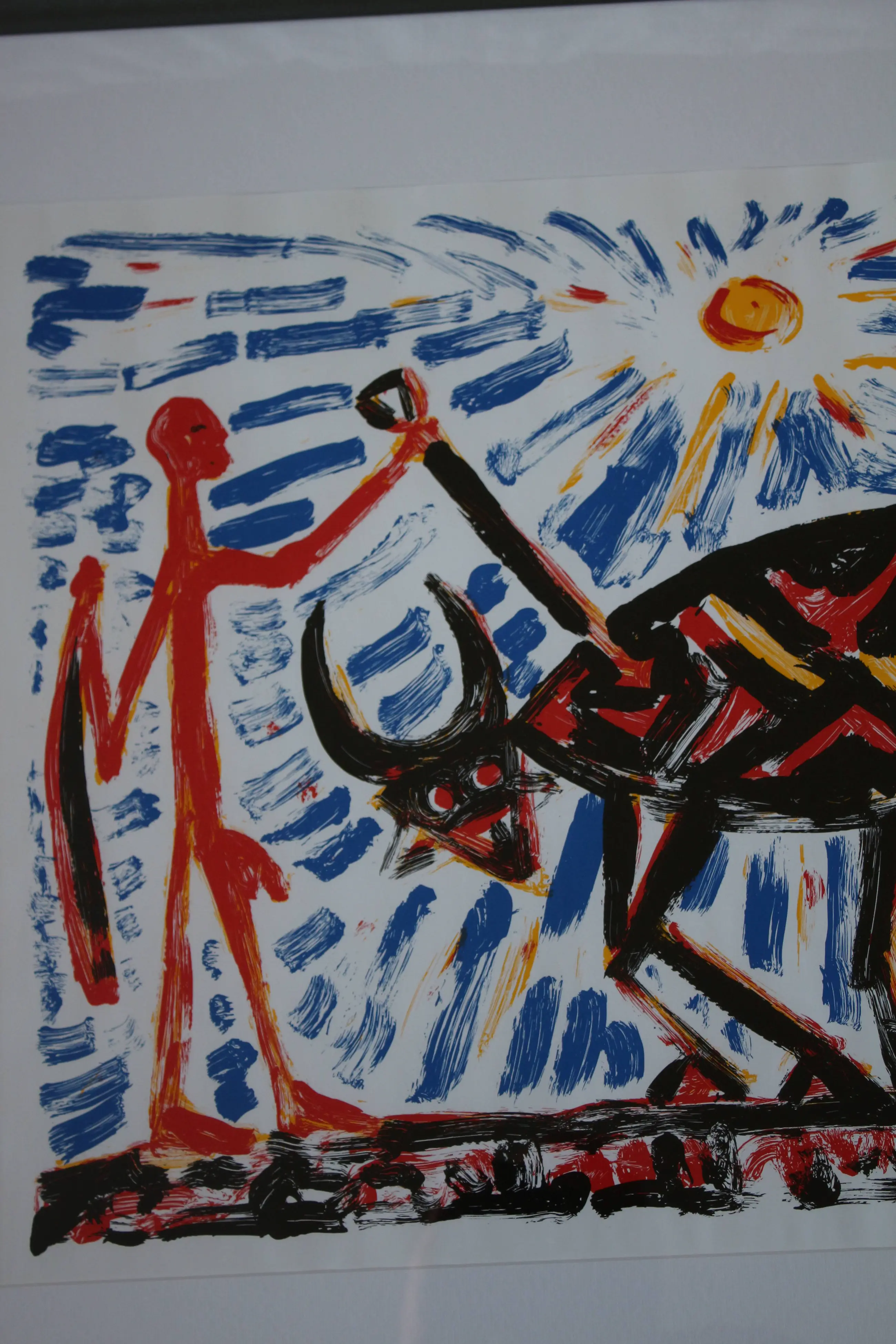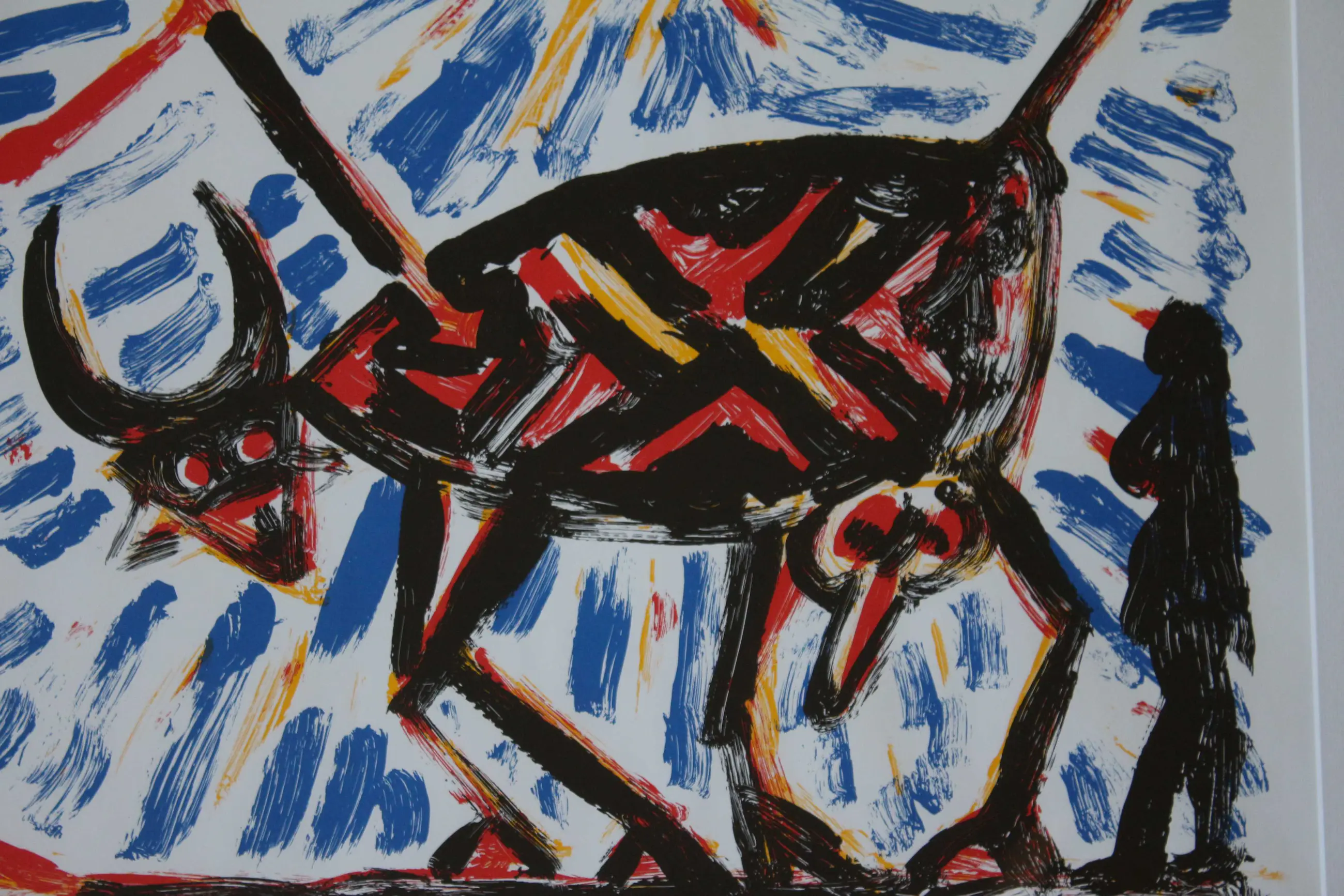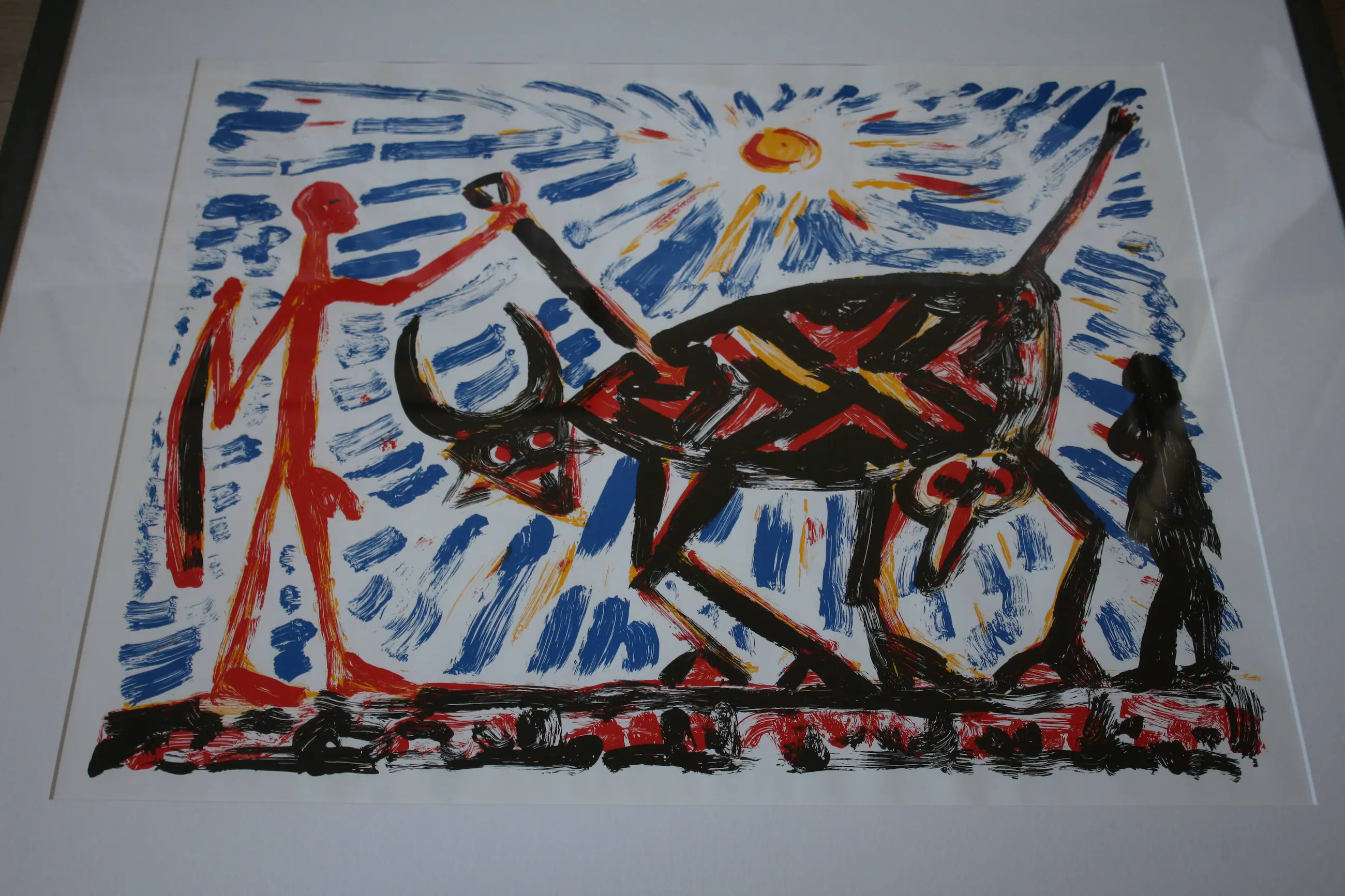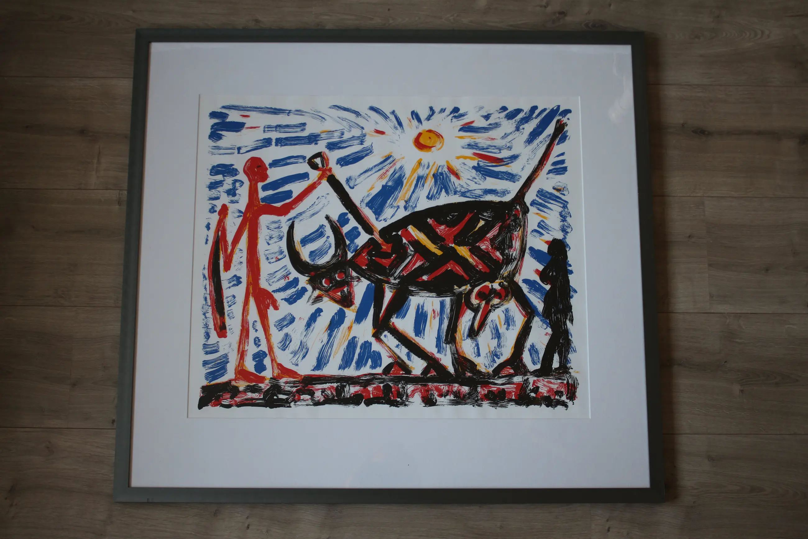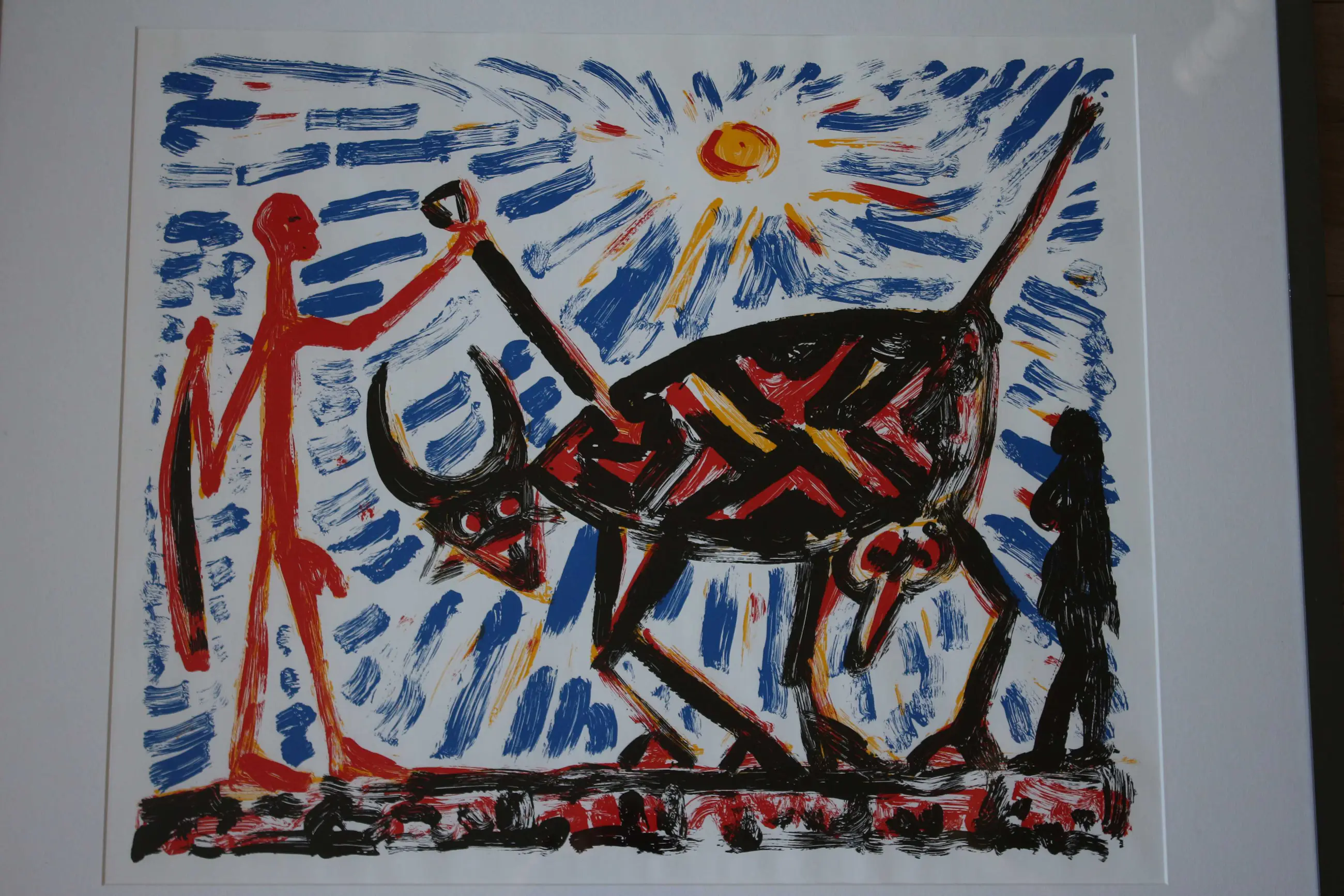 Het werk is niet gesigneerd. Het is volgens mij geen offset, maar ik durf het niet als zeefdruk aan te bieden. Het is een unieke mogelijkheid om in het bezit te komen van een schaars werk van Penck.