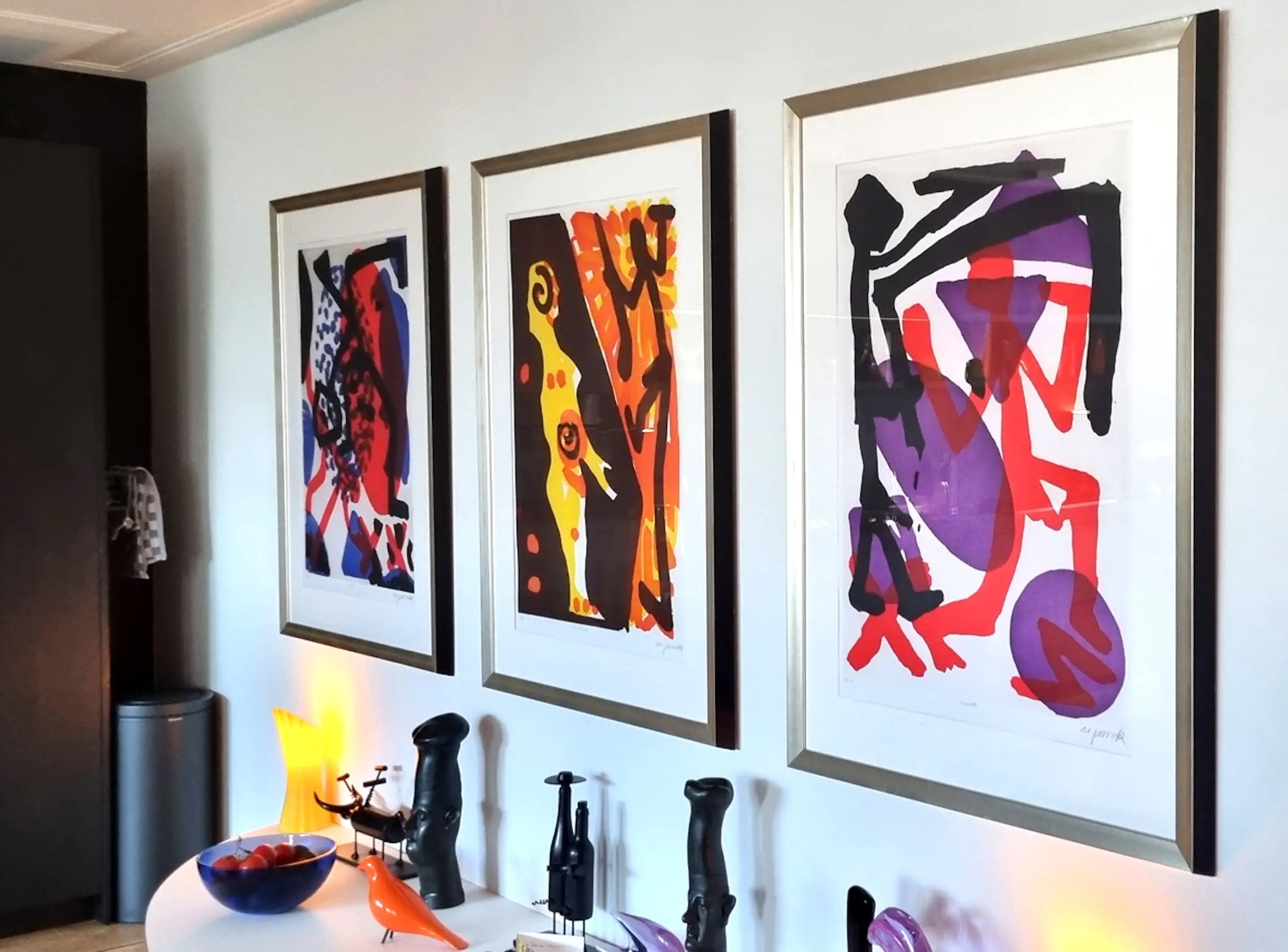 Lot van 3. Herkomst Sotheby's. Zijn ingelijst in houten lijsten van 4cm breed en 4cm dik. Normaal glas. Zijkant zwart en voorkant zilver. Zijn in prima conditie, professioneel ingelijst, zonder kreukels. Mogelijk opgeplakt. Een paar nauwelijks zichtbare beschadigingen aan de voorkant van de lijsten. Vallen niet op door de lichte structuur van het zilver. Degelijk ophangsysteem met 2 haken, die noodzakelijk zijn vanwege het gewicht van de lijsten. Dit werk wordt alleen als set van 3 aangeboden. Alle 3 nr. 40/50