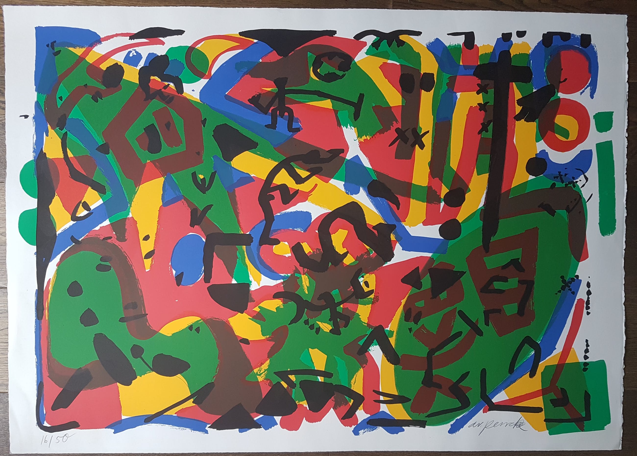 Prachtige kleurrijke en expressieve zeefdruk van A.R. Penck, handgesigneerd en genummerd en in goede conditie.