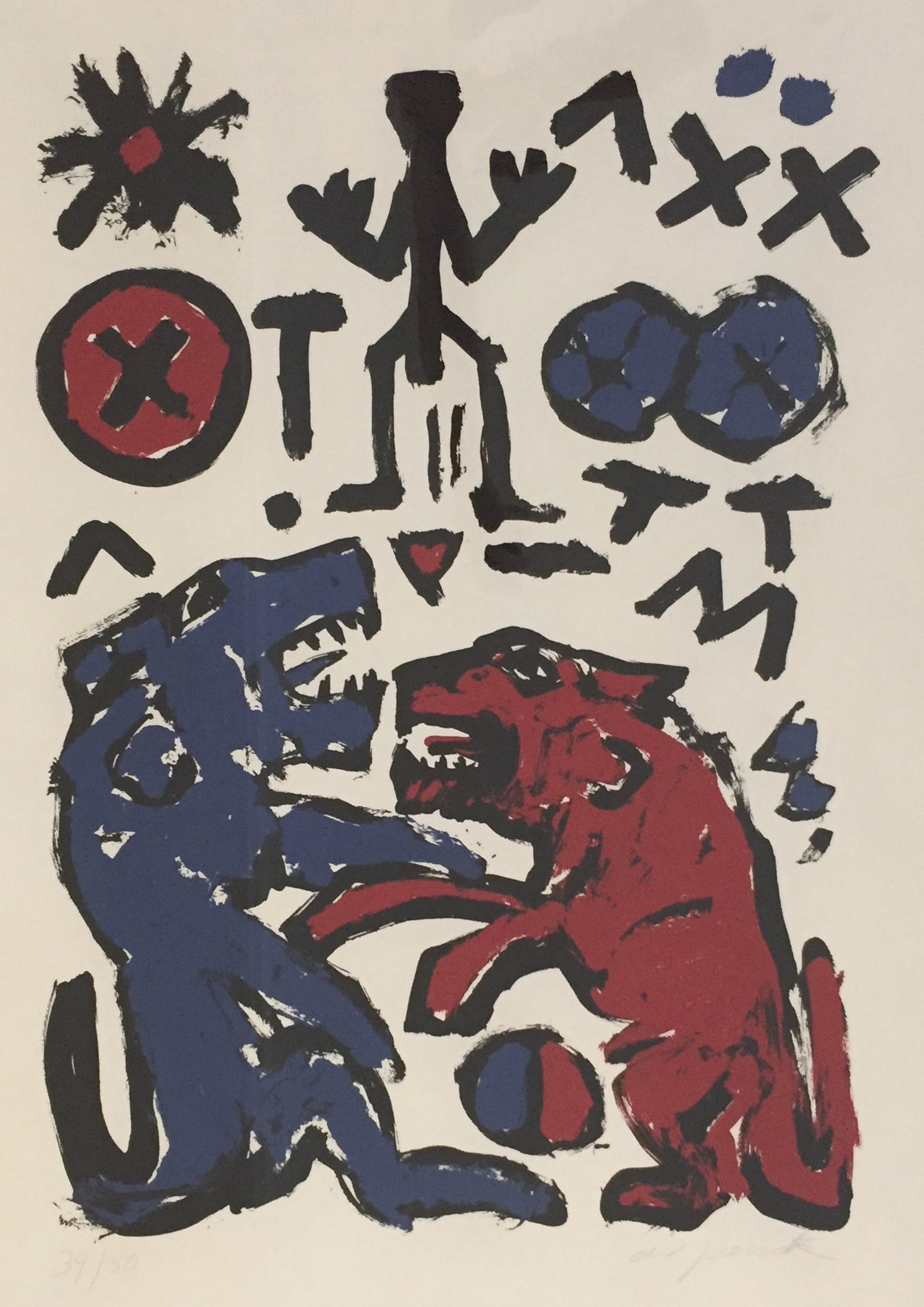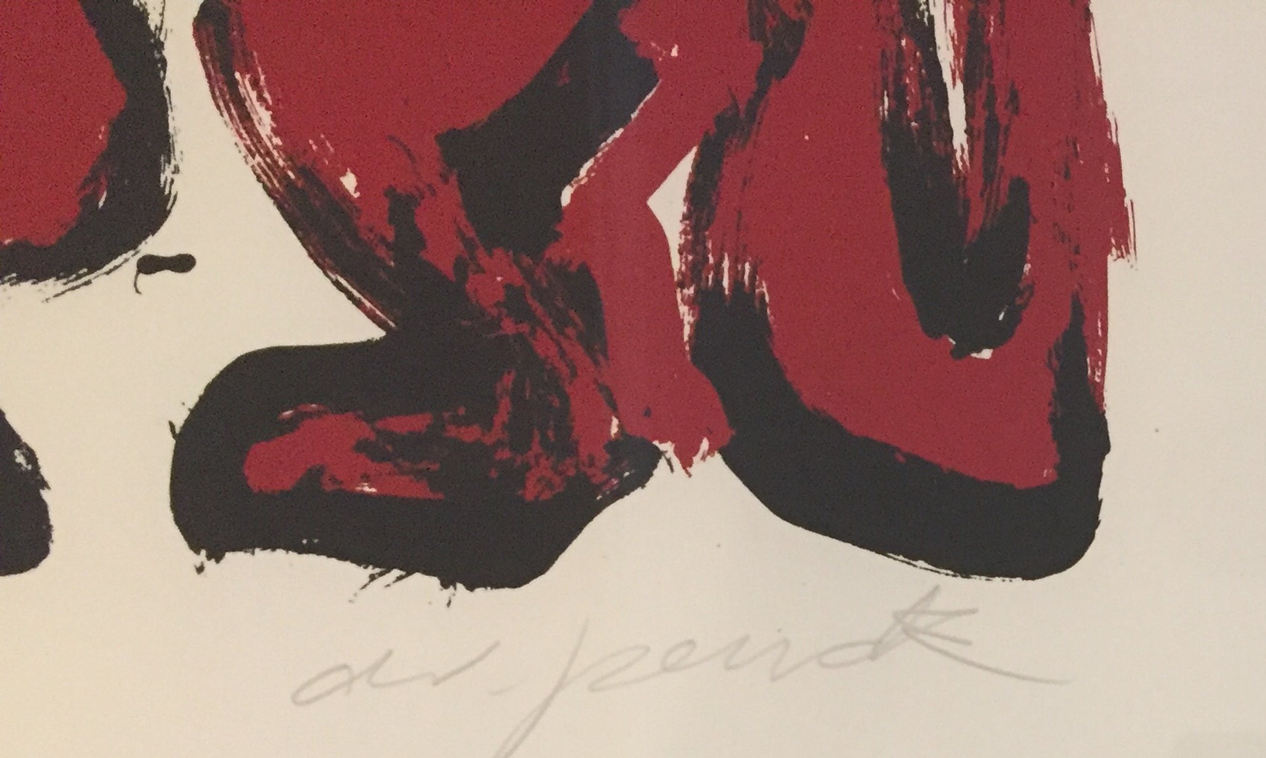 Zeer bijzondere en grote litho van de hand van A.R. Penck (Ralf Winkler). Gedrukt in een relatief kleine oplage van slechts 50 stuks. Dit betreft exemplaar nummer 34. Door de kunstenaar met potlood gesigneerd en genummerd.
