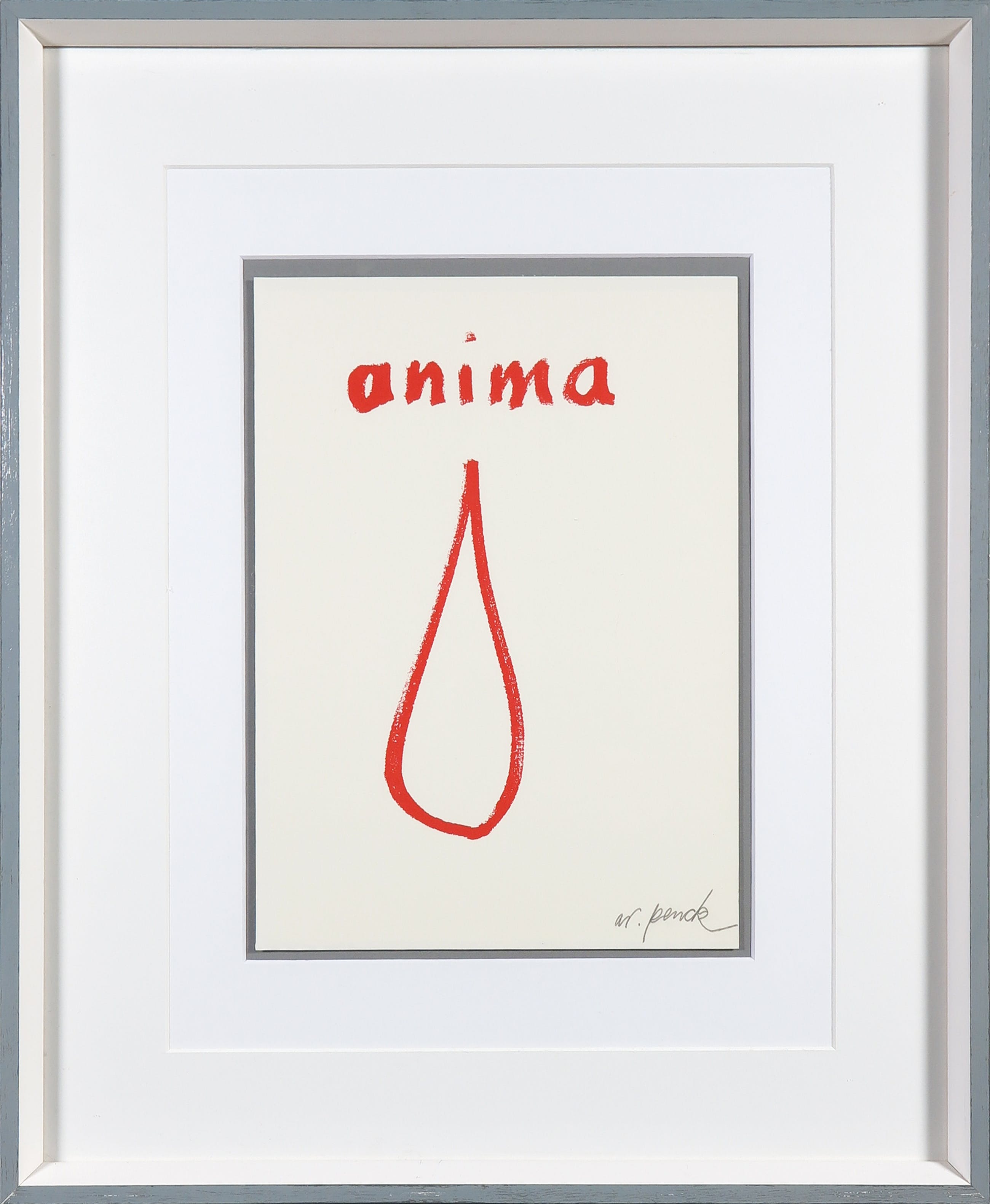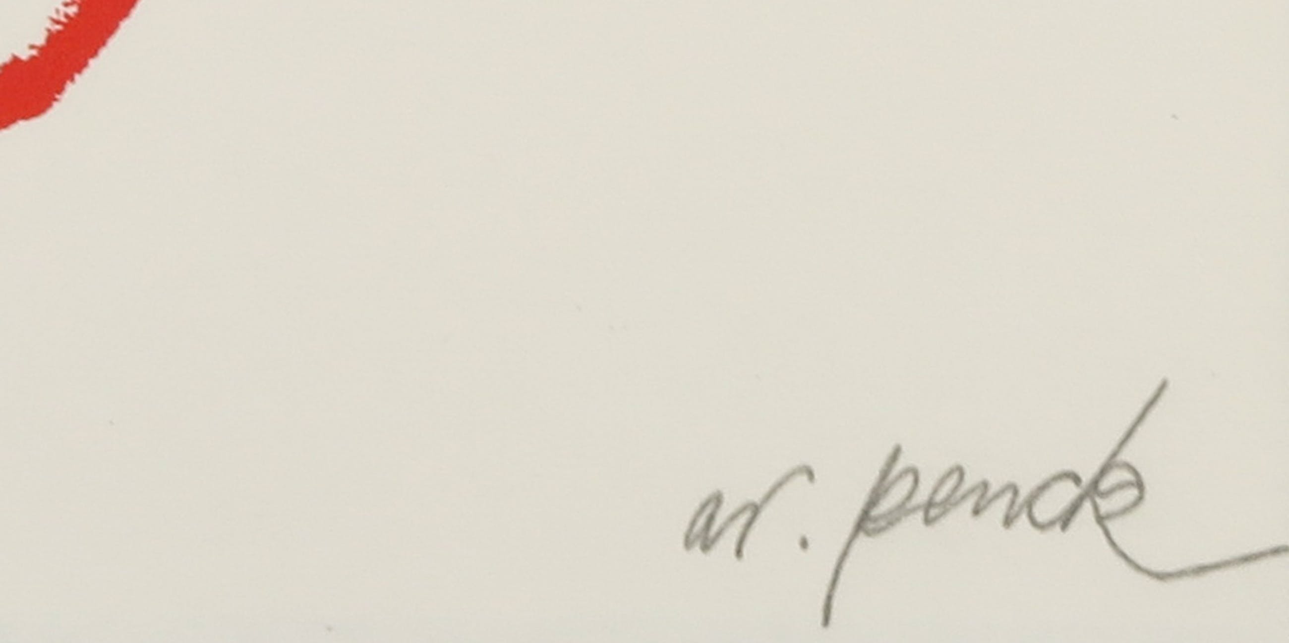 Netjes ingelijste litho, handgesigneerd door Penck. Ingelijst in wit en grijs gelakte houten lijst met dubbel passe-partout.
