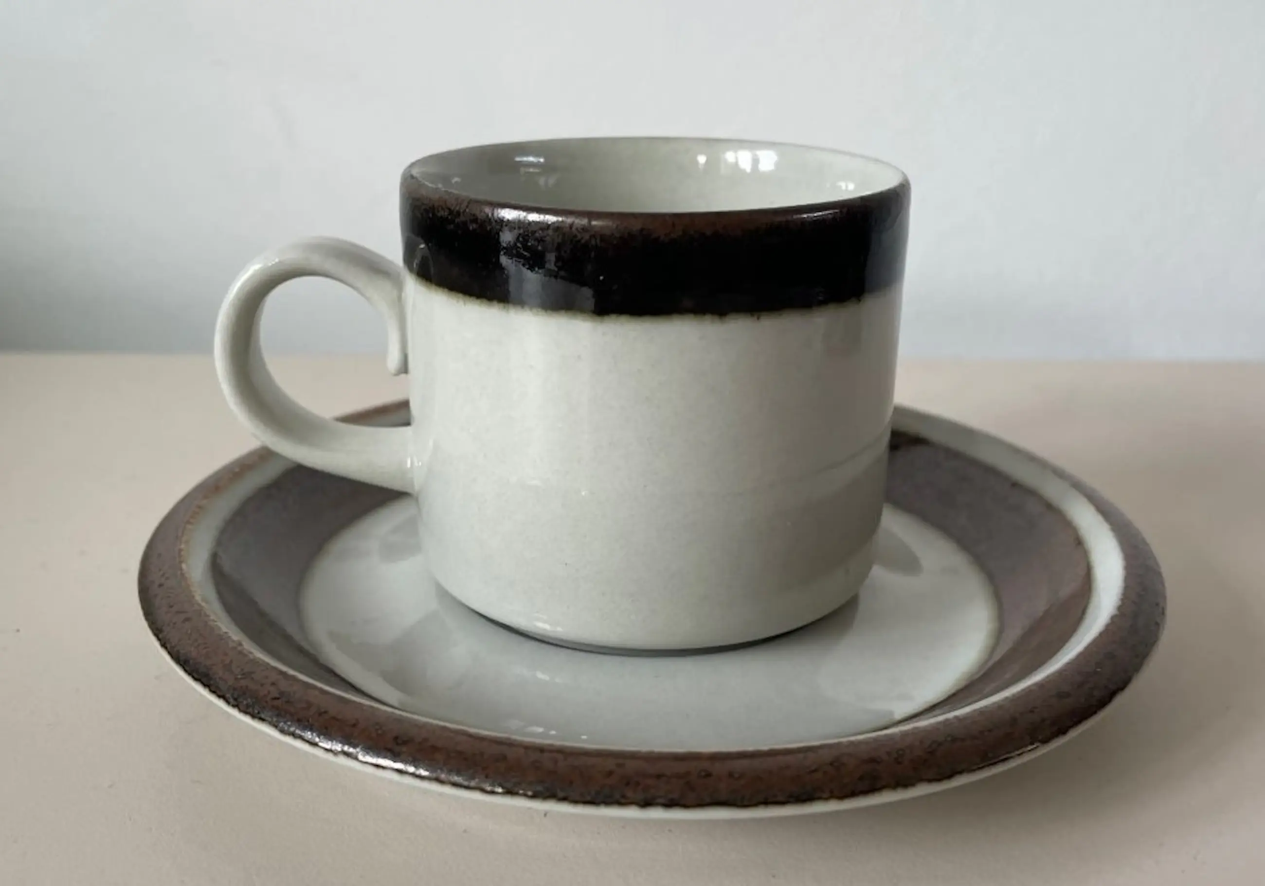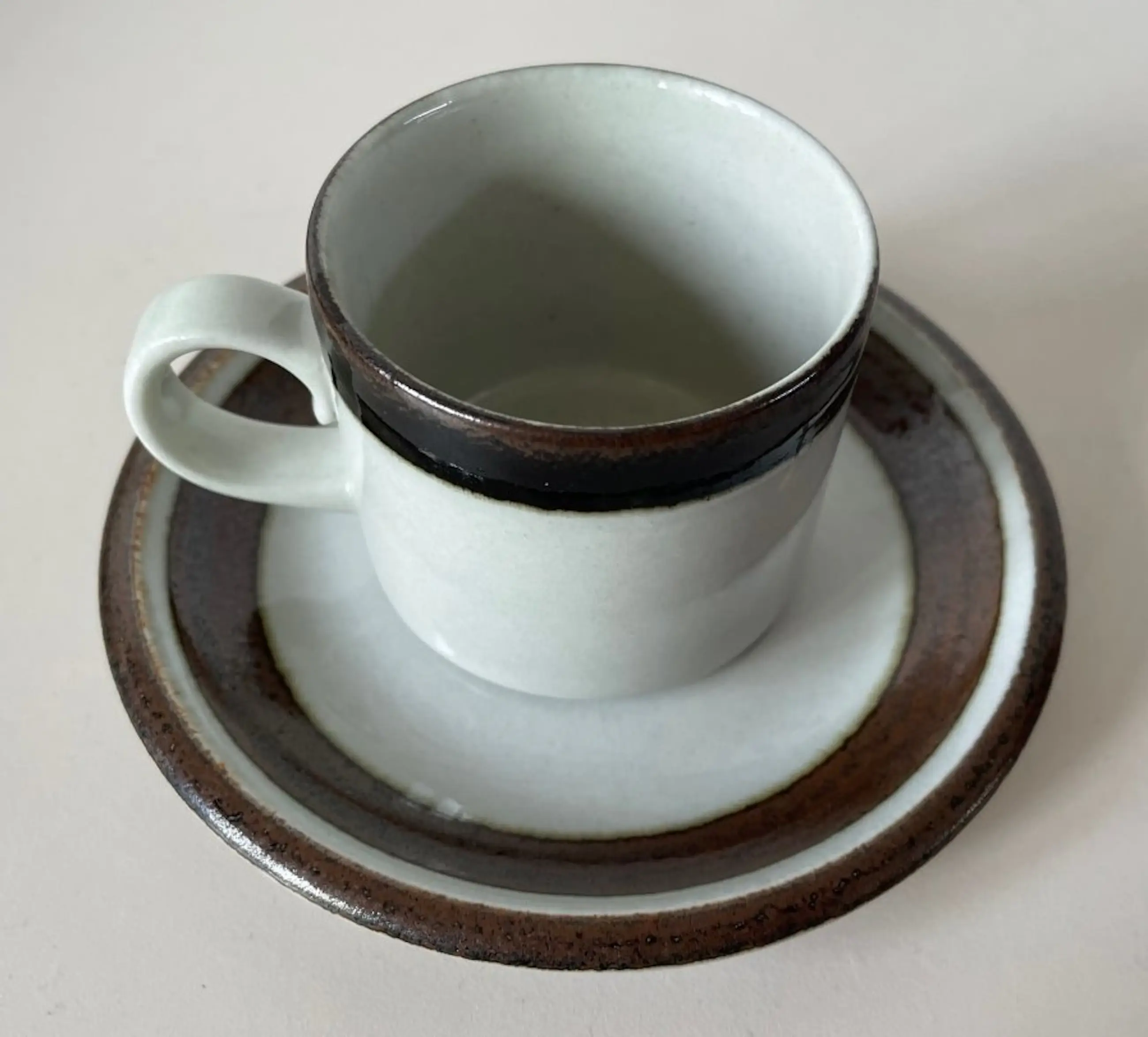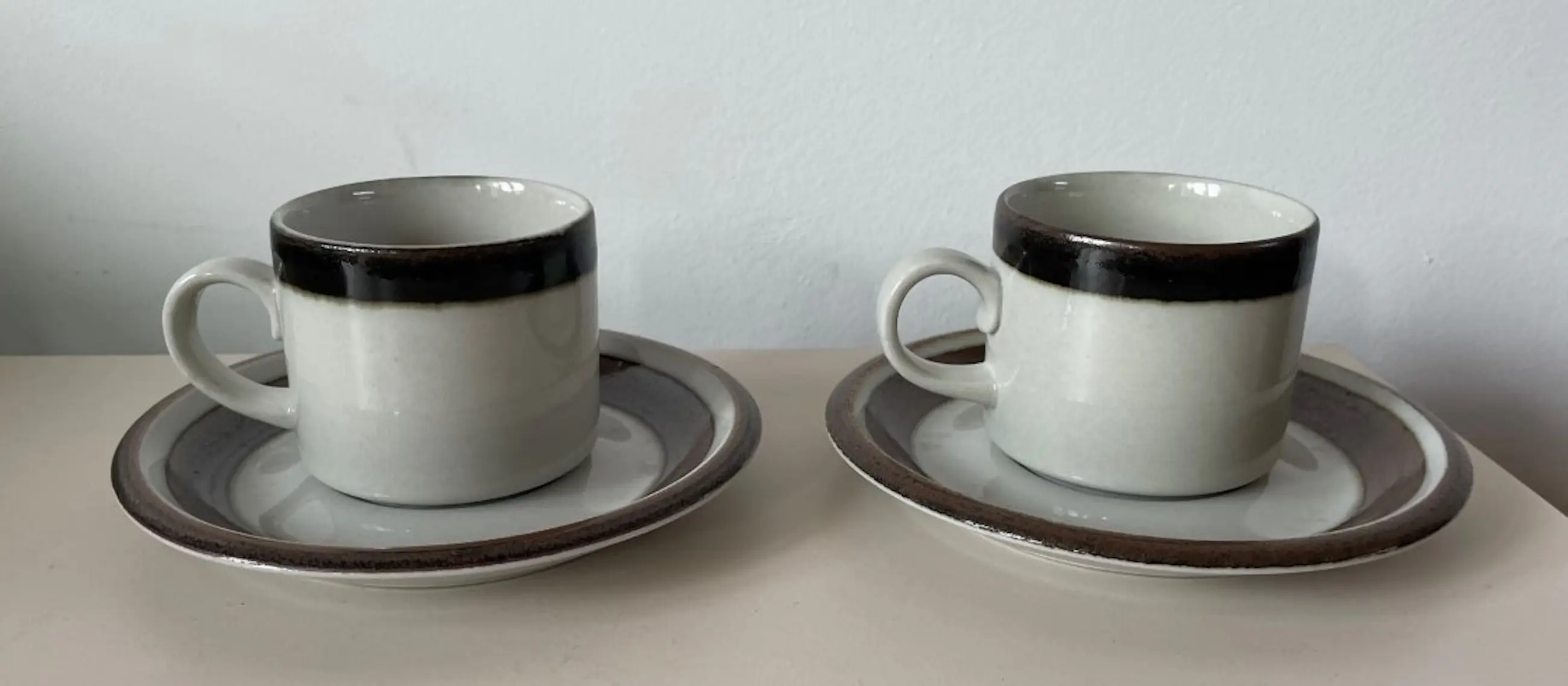 Twee kop- en schotels servies Karelia van Arabia Finland - ontwerp Anja Jaatinen-Winquist. In prima onbeschadigde conditie. Gemerkt aan de onderkant.