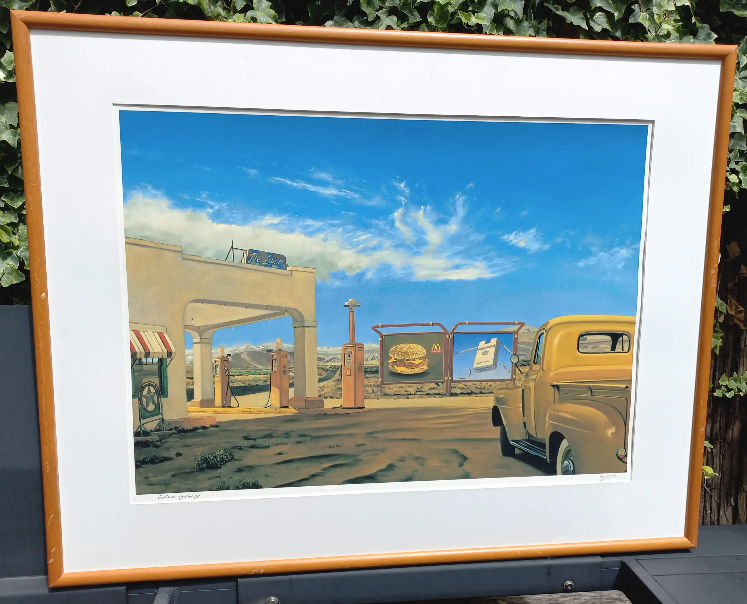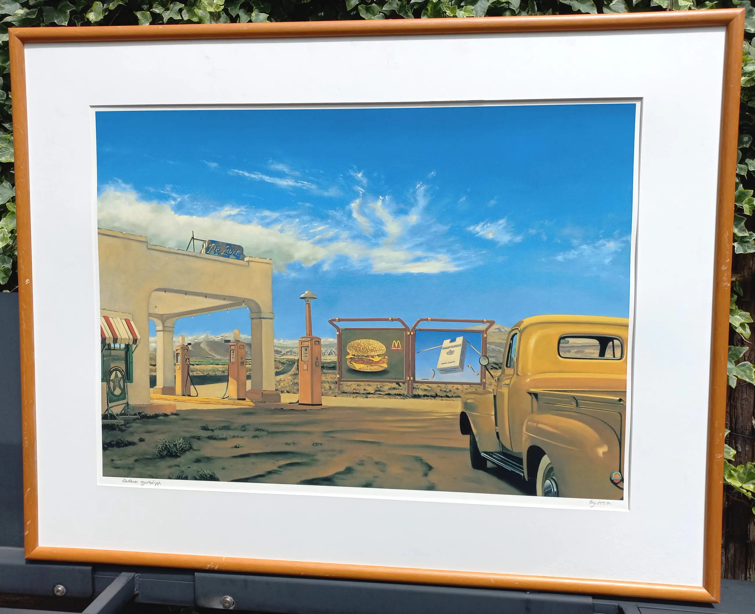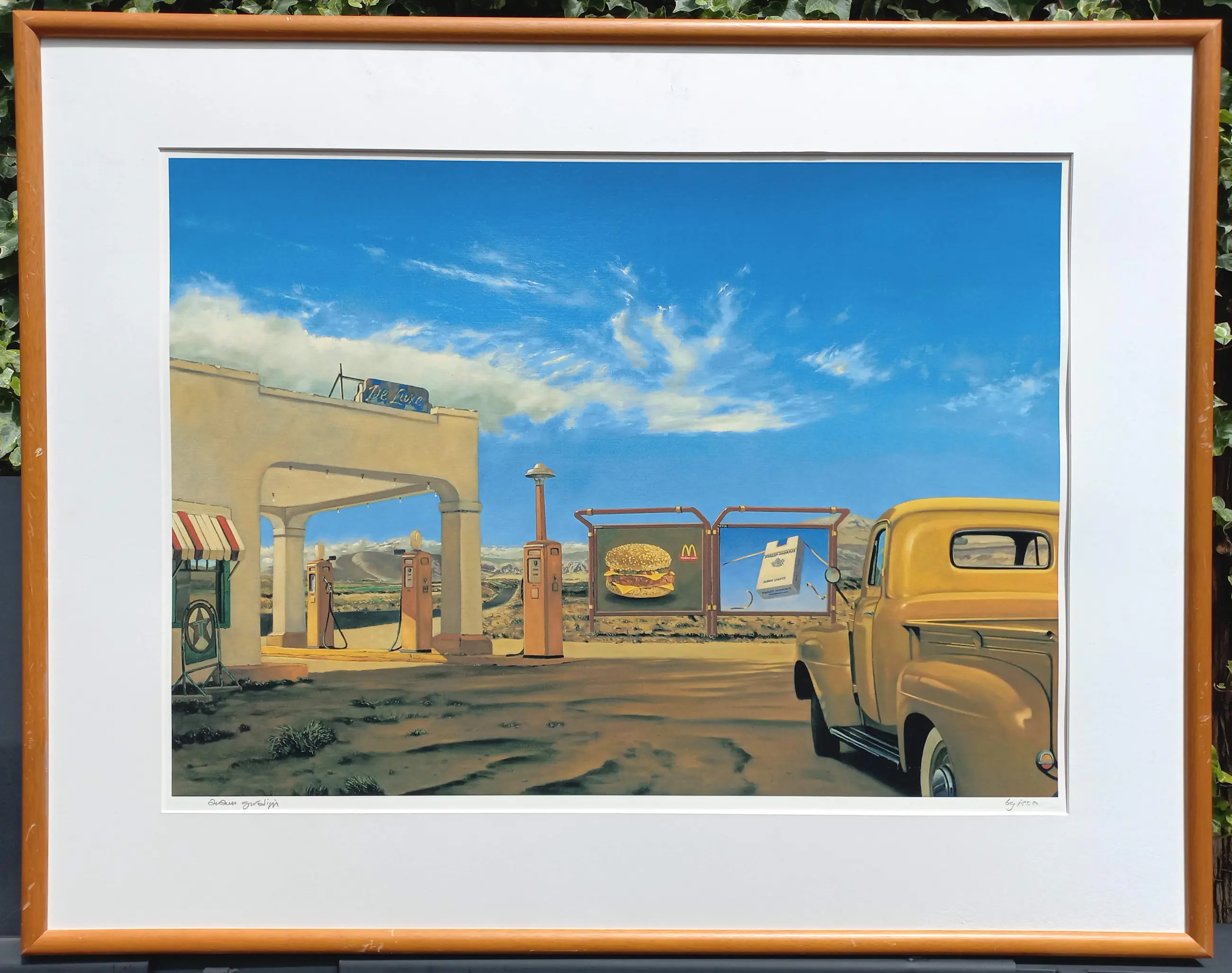 Karakteristieke Americana van Araun Gordijn, een benzinestation met een pick-up truck ergens in New Mexico of daaromtrent. Zeefdruk op papier, met potlood gesigneerd en genummerd (69/150). In nette houten lijst en met zuurvrij passe-partout. In goede conditie.
