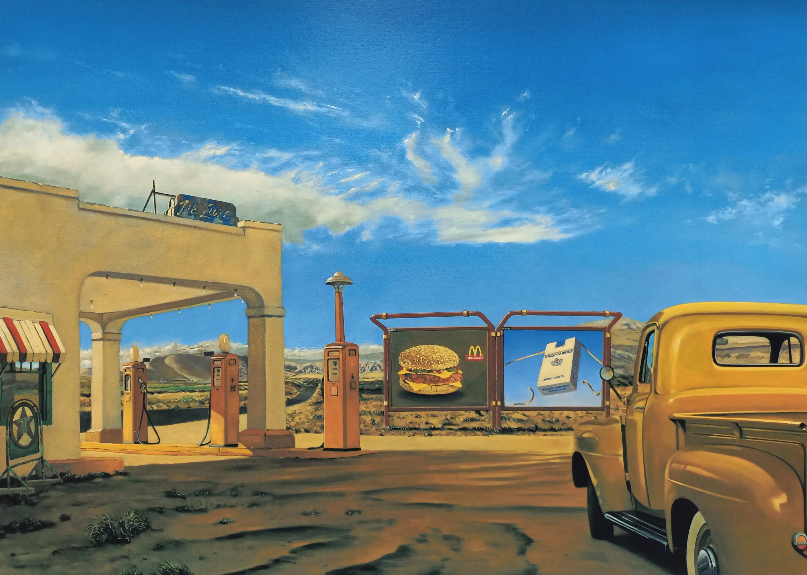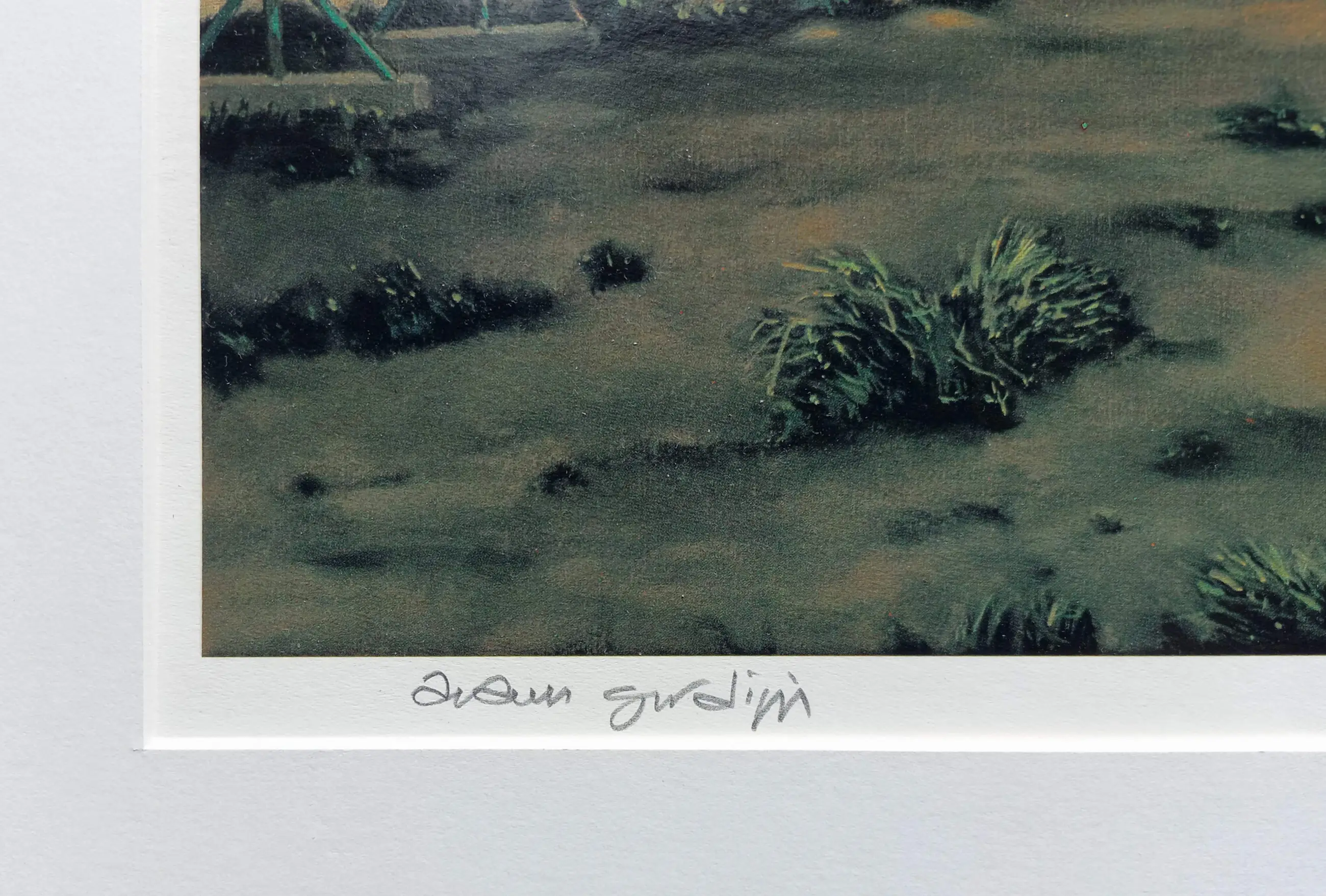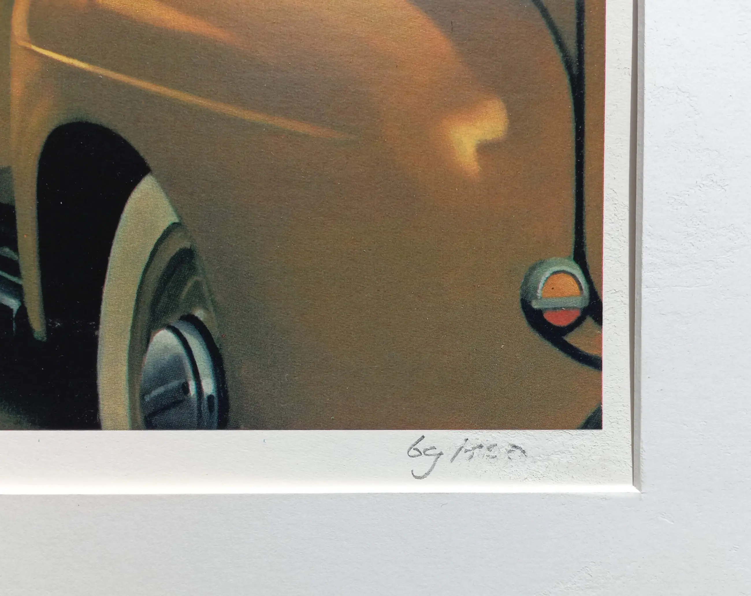 Karakteristieke Americana van Araun Gordijn, een benzinestation met een pick-up truck ergens in New Mexico of daaromtrent. Zeefdruk op papier, met potlood gesigneerd en genummerd (69/150). In nette houten lijst en met zuurvrij passe-partout. In goede conditie.