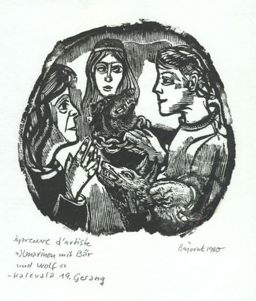 Archibald Bajorat - 19.Gesang, Ilmarinen mit Bär und Wolf, Holzschnitt 1980