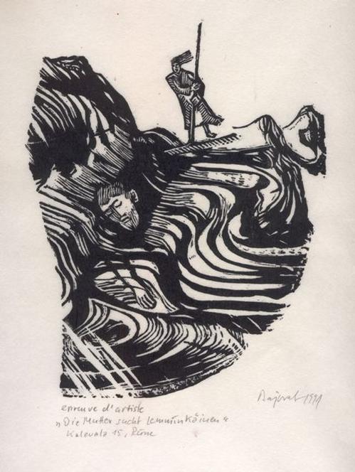 Archibald Bajorat - Kalevala 15.Gesang, Die Mutter sucht Lemminkäinen, Holzschnitt 1975