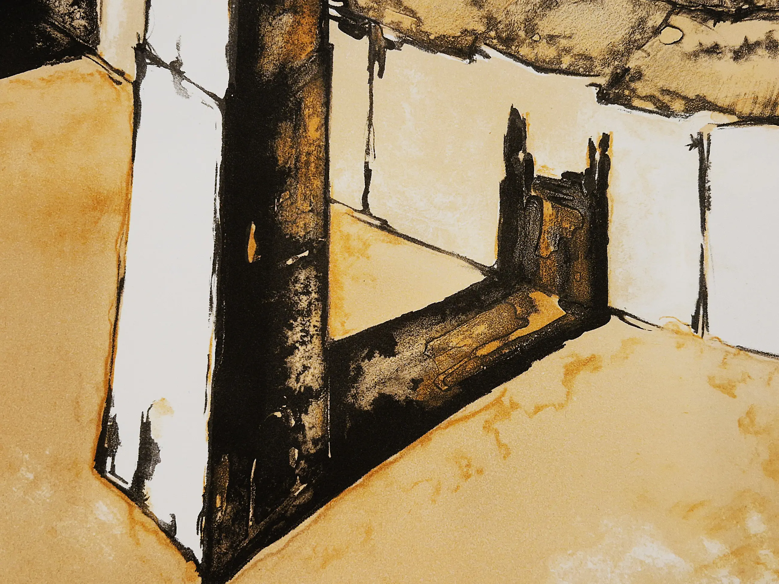 Ik ben graag buiten of denk mij buiten, waar ik noteer met camera en schetsboek. In het atelier onderzoek ik een mogelijk onderwerp in houtskool- en potloodschetsen, draaiend met standpunt en lichtbron, voordat het uitmondt in een litho, pastel of gemengde techniek.