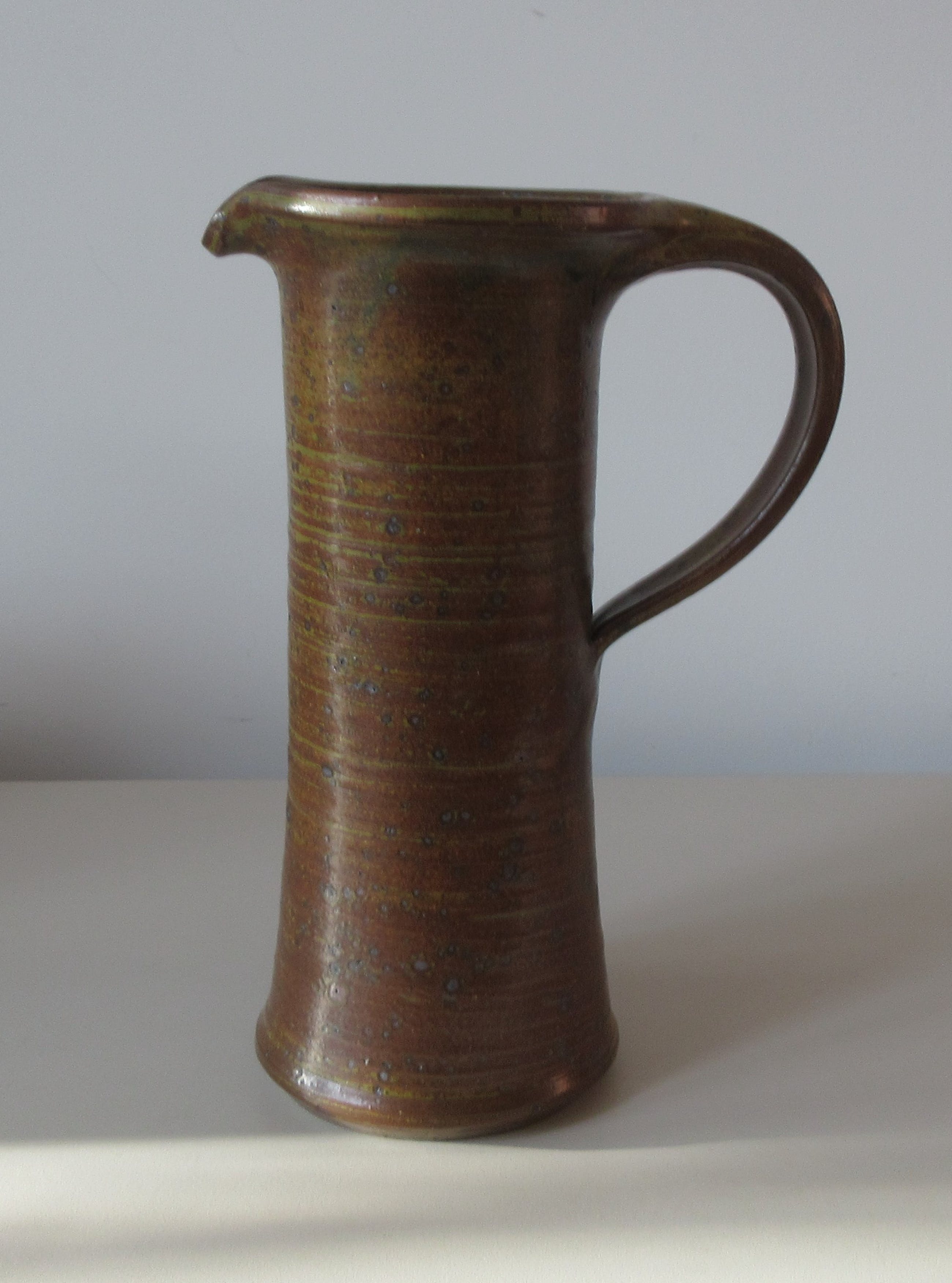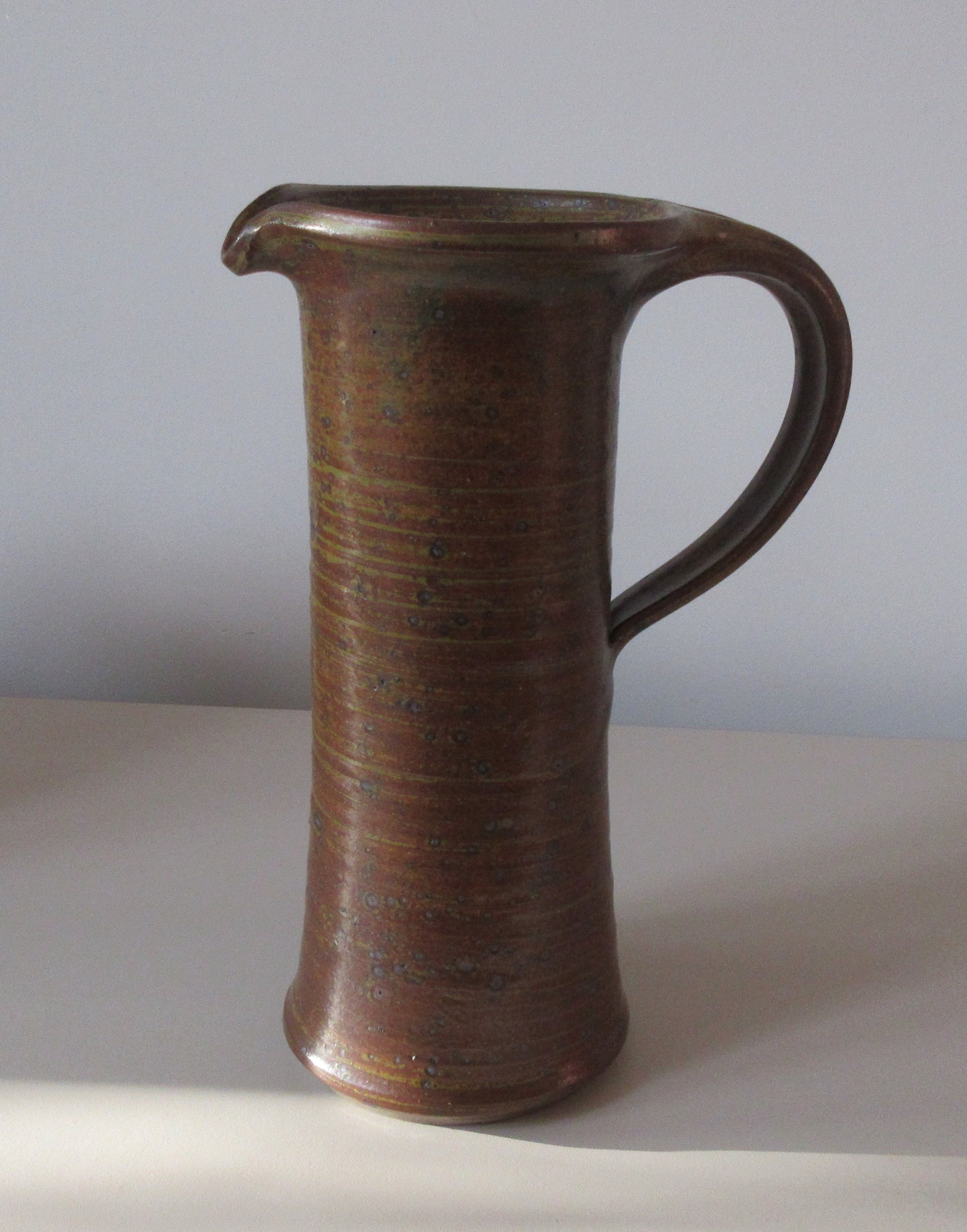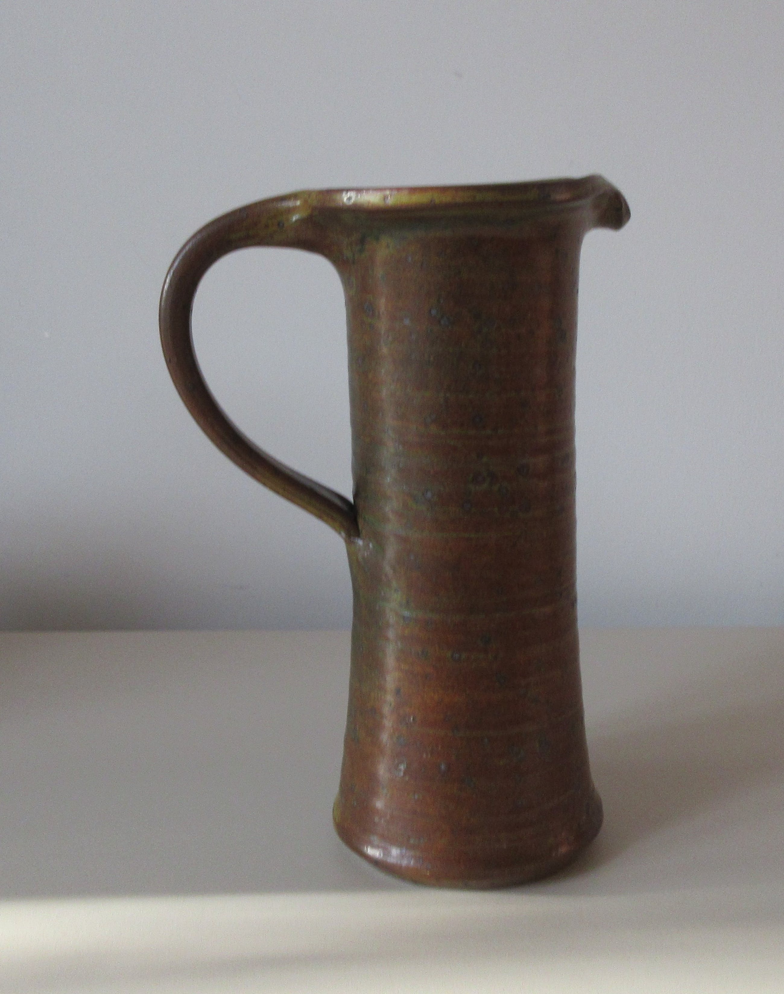 Steengoed kan met bruin groen mat glazuur gemaakt in eigen Atelier De Ringeloor door kunstenares Ardine Spitters. De kan is perfecte conditie en voorzien van ingedrukt merk.