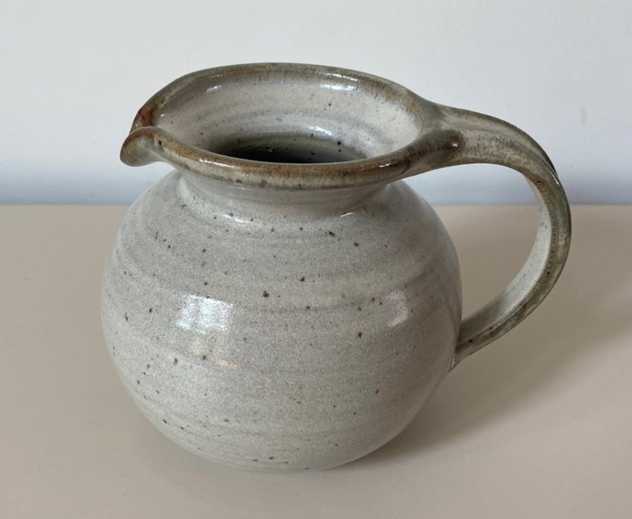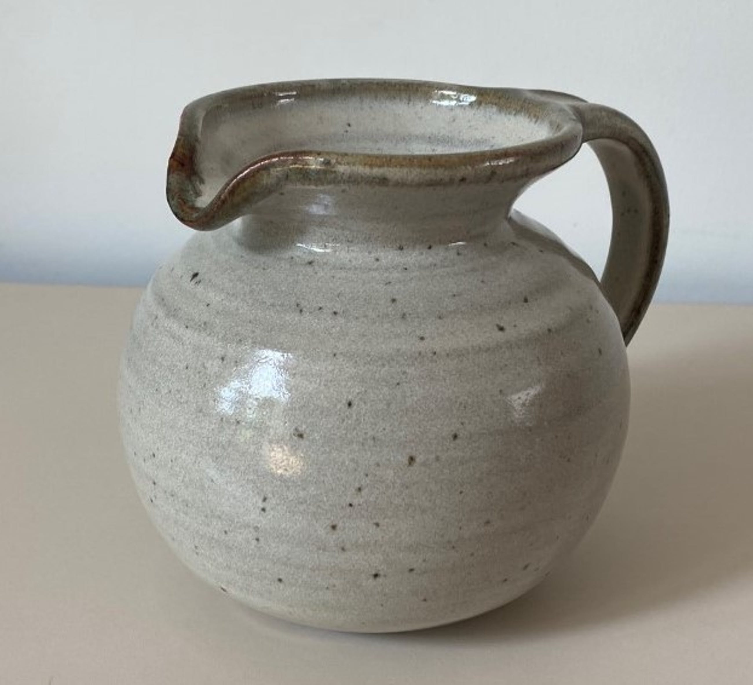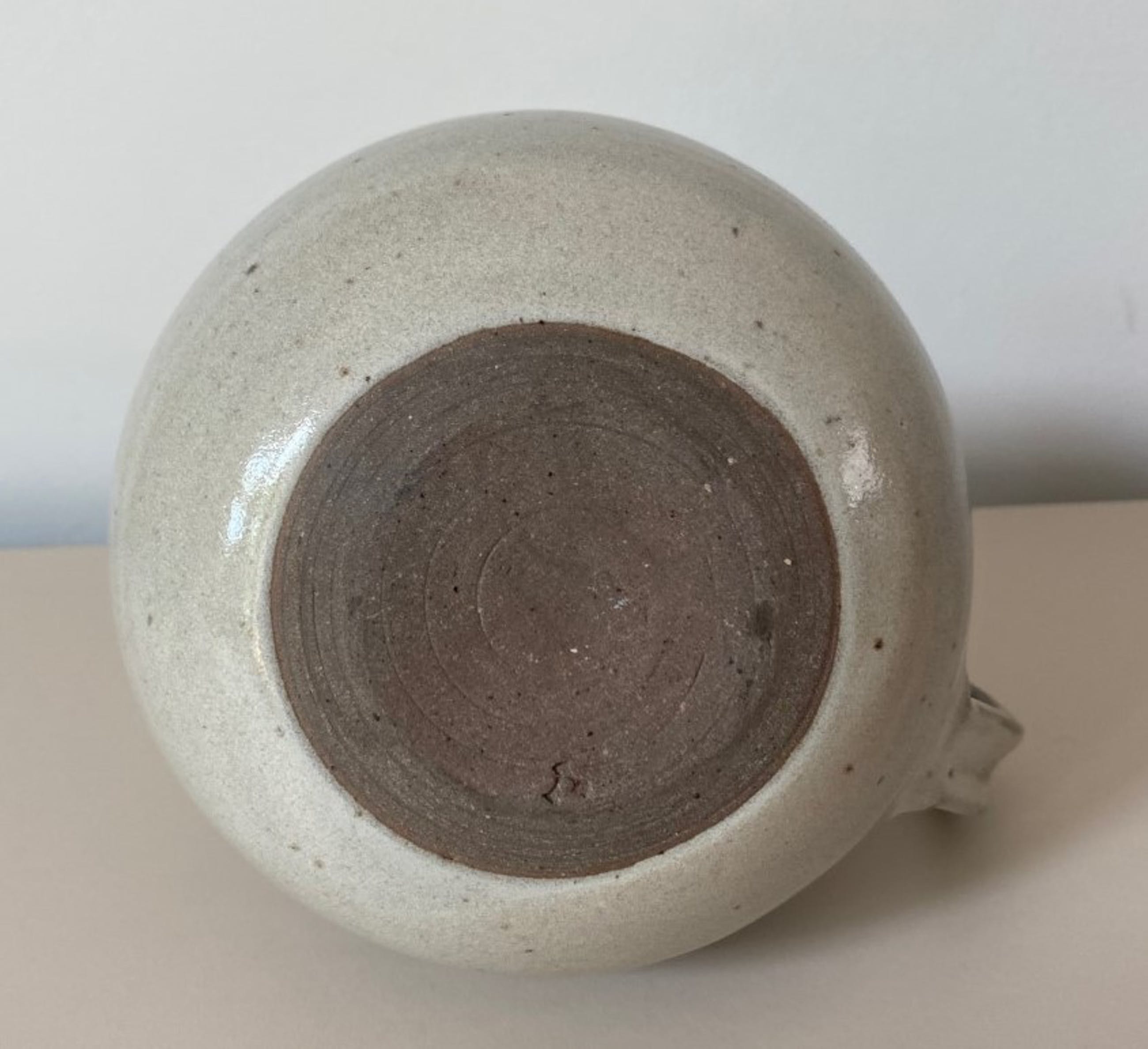 Steengoed waterkan met zandkleurig en bruin glanzend glazuur uitgevoerd door Ardine Spitters in eigen atelier. In prima onbeschadigde conditie, voorzien van monogram aan de onderzijde.