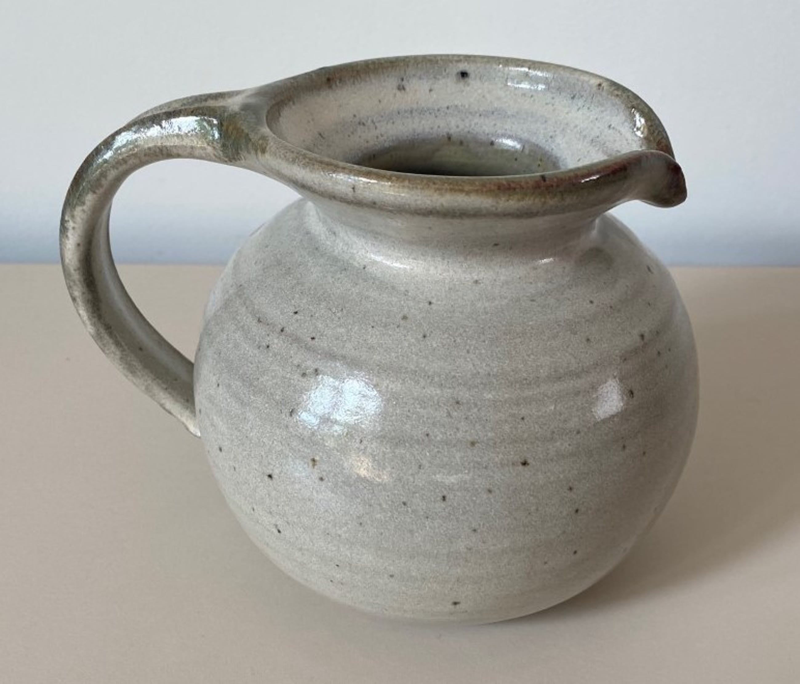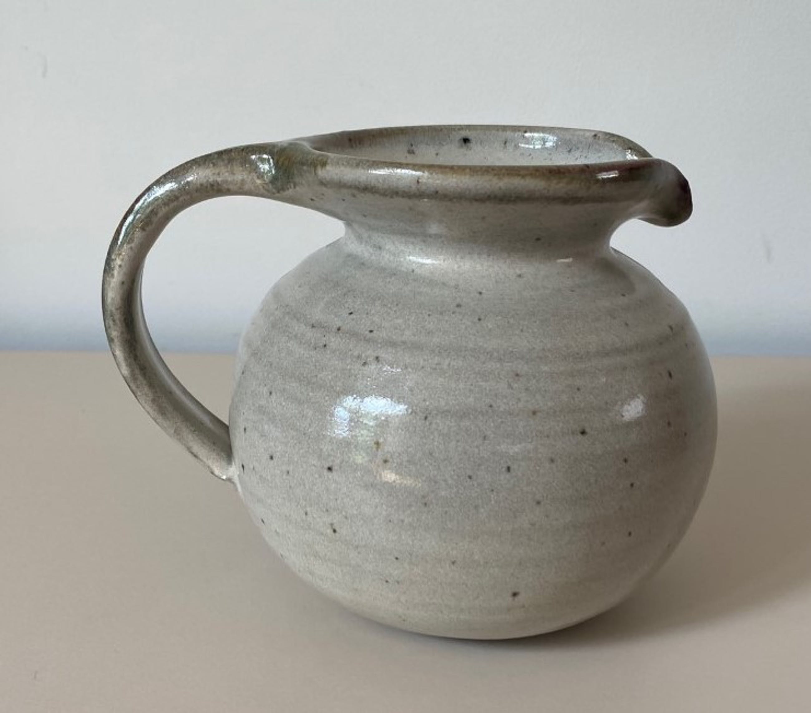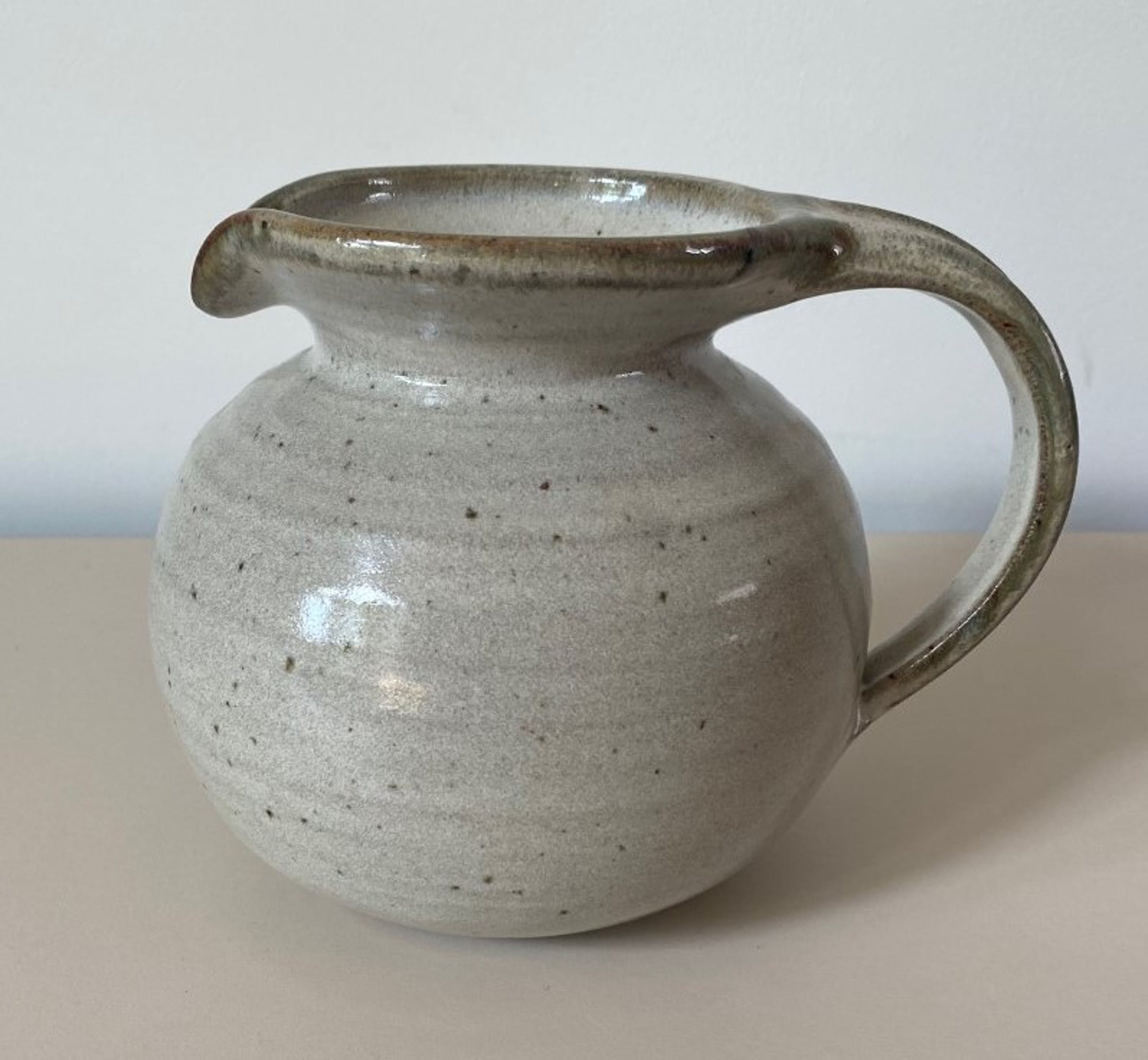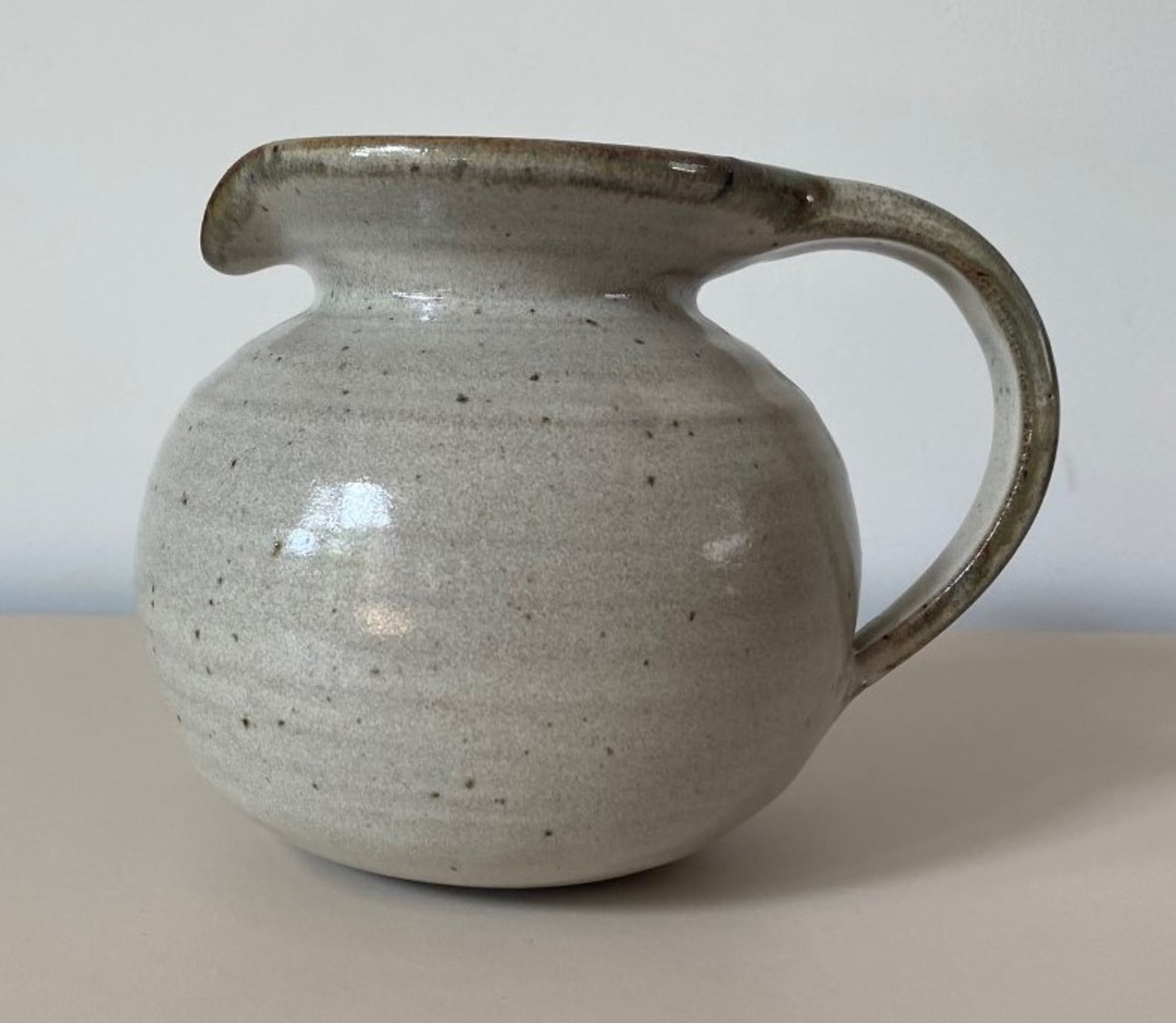 Steengoed waterkan met zandkleurig en bruin glanzend glazuur uitgevoerd door Ardine Spitters in eigen atelier. In prima onbeschadigde conditie, voorzien van monogram aan de onderzijde.