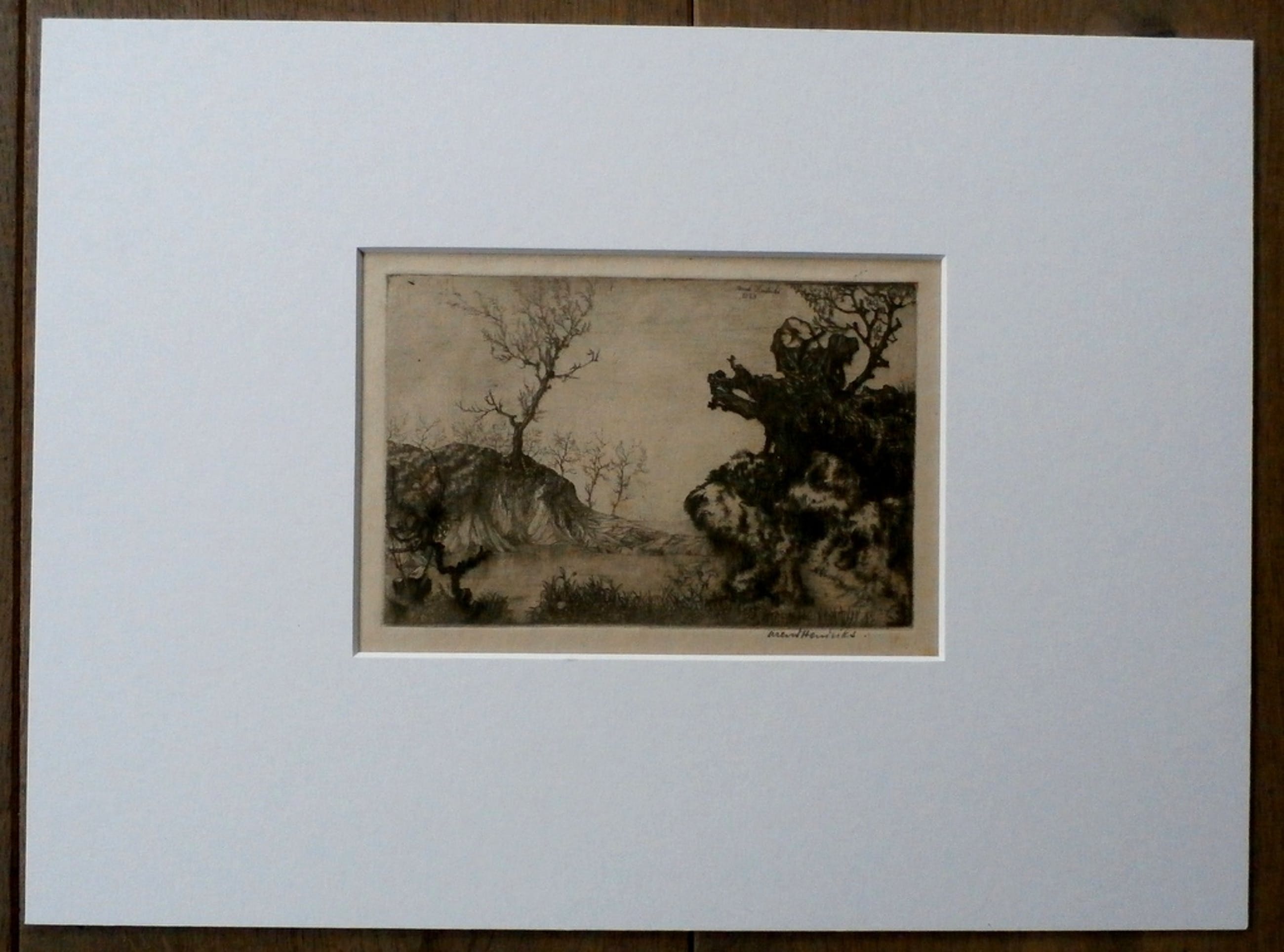 Ets van Arend Hendriks. Titel: landschap. De ets is rechtsonder met potlood gesigneerd en linksboven in de plaat. Jaar: 1923. . Afmetingen voorstelling: h11,7 x b17,5 cm. Afmetingen incl. passe-partout: h30 x b40 cm. De authenciteit van het, aangeboden, werk wordt voor 100% gegarandeerd. Een certificaat van echtheid kan, op aanvraag, worden meegestuurd