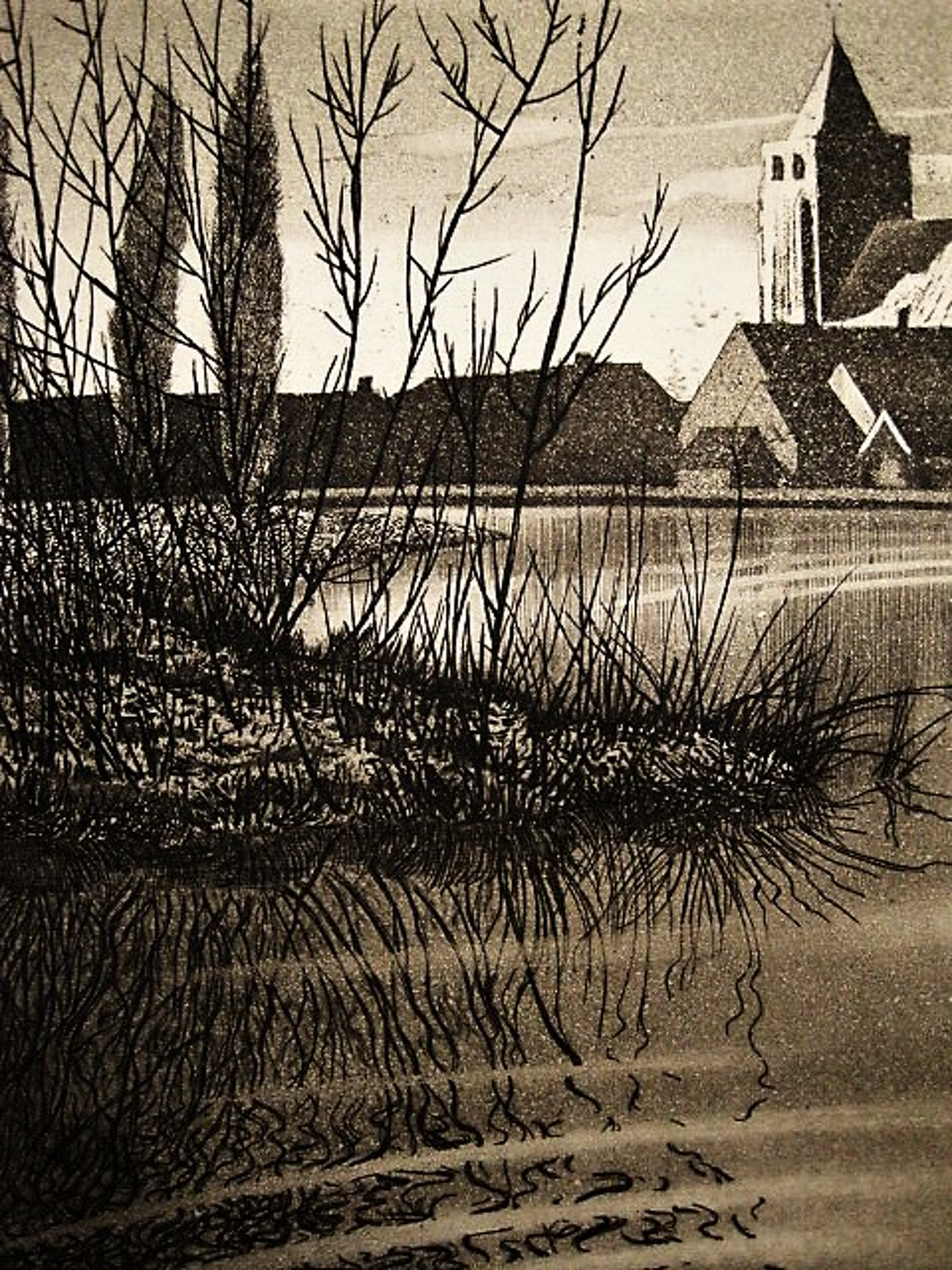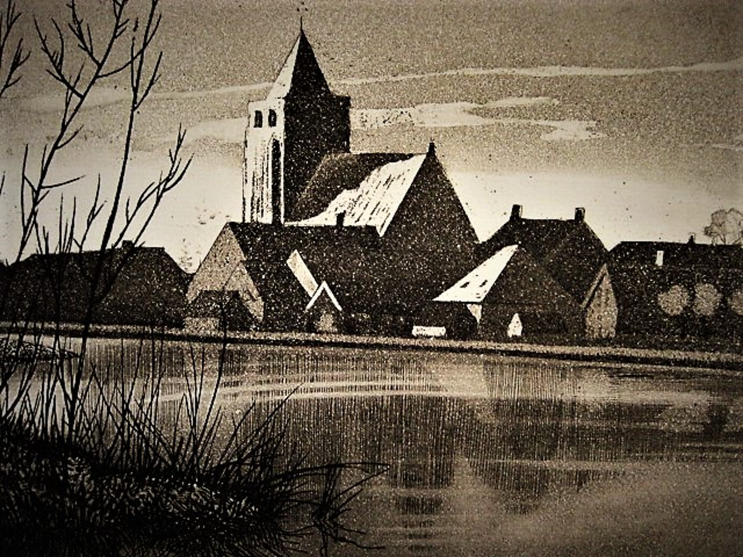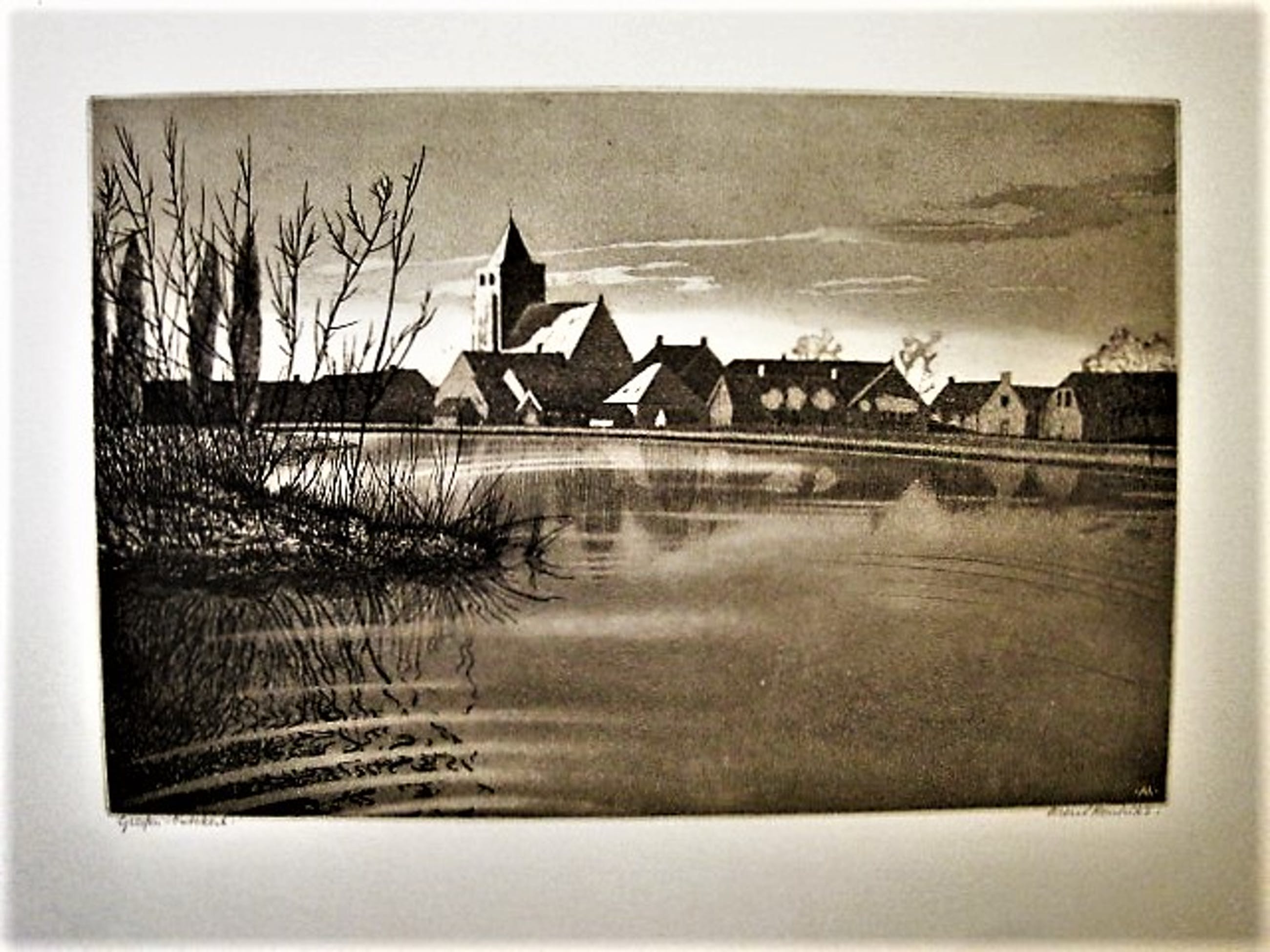 - Grote verstilde Ets op papier "Ochtend bij Ouderkerk a/d Amstel" . Gesigneerd met potlood r.o., getiteld l.o. en tevens signatuur/ monogram in de plaat r.o.