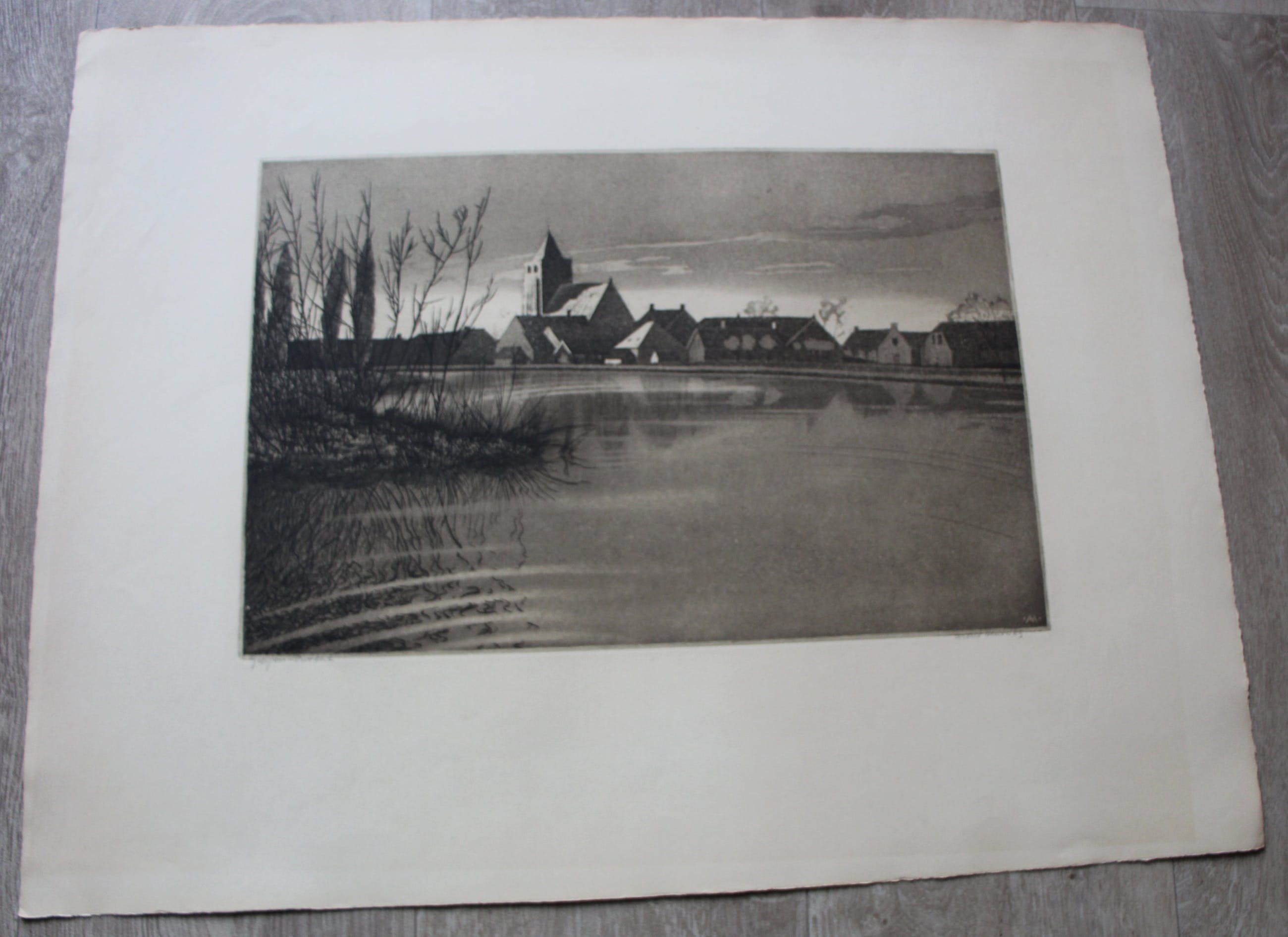 Ets/Aquatint van Arend Hendriks. Titel: Giessen-Oudekerk. Afmeting blad: H50 cm x b66 cm. Afmetingen voorstelling: H28.5 x B43 cm. Het werk is rechts onderaan, met potlood, gesigneerd door de kunstenaar. De authenticiteit van het, aangeboden werk, wordt voor 100% gegarandeerd. Een certificaat van echtheid kan, op aanvraag, worden meegestuurd. Het werk is in goede staat. Het werk heeft ingelijst gezeten, want is verkleurd binnen de randen van het oude passepartout. Goed ingelijst met nieuw passepartout valt dit niet meer op.