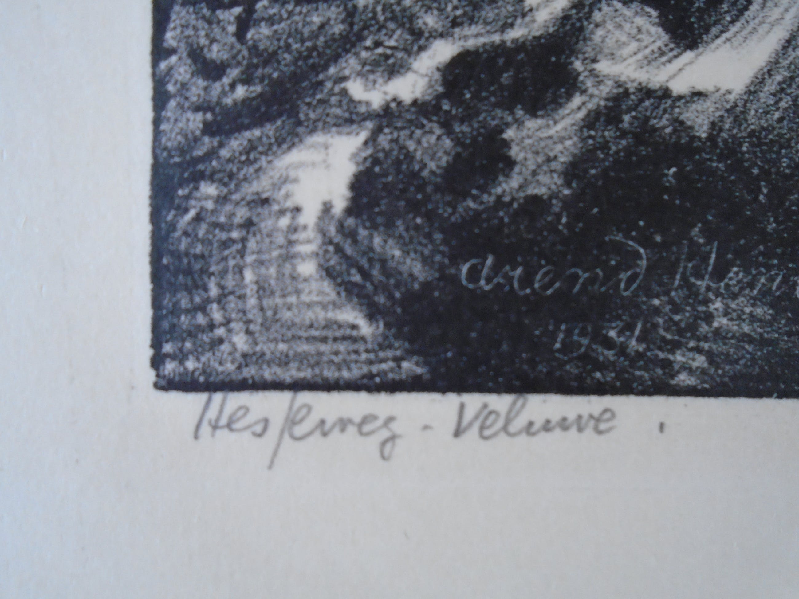 Mooie grote litho uit 1931.Potlood gesigneerd rechtsonder.Getiteld linksonder.In de steen gesigneerd en gedateerd linksonder.Beeldmaat 48 x 52 cm.Bladmaat 54 x 58 cm.Losbladig.