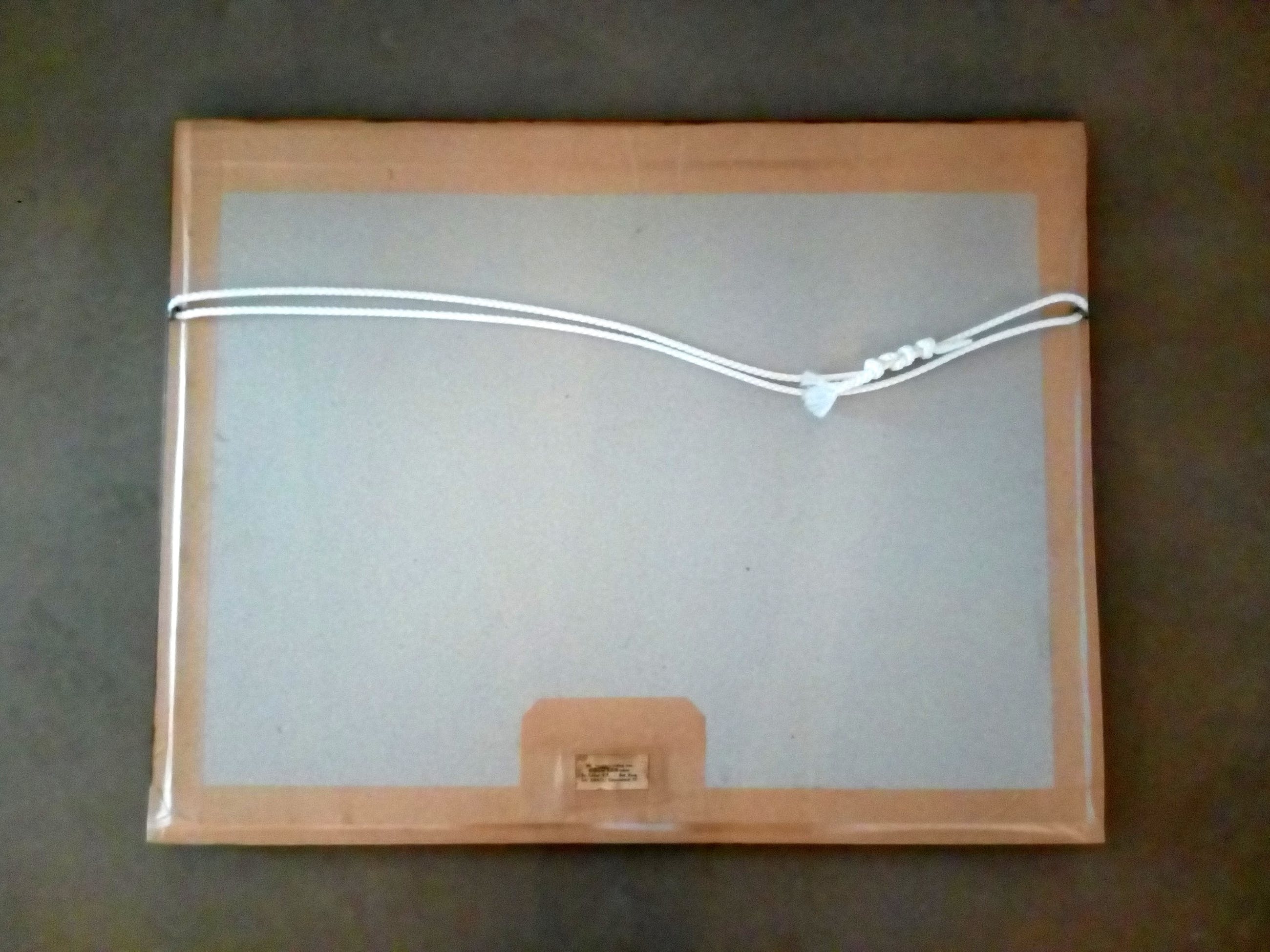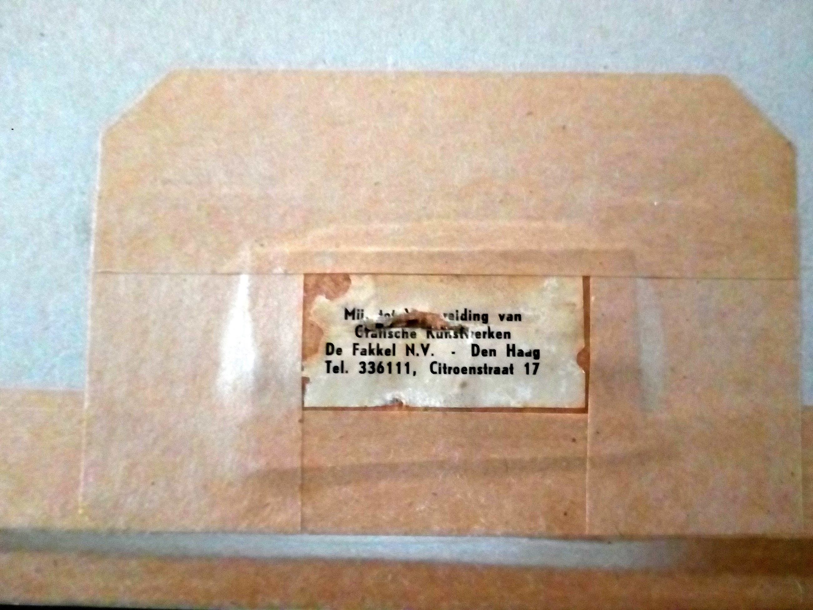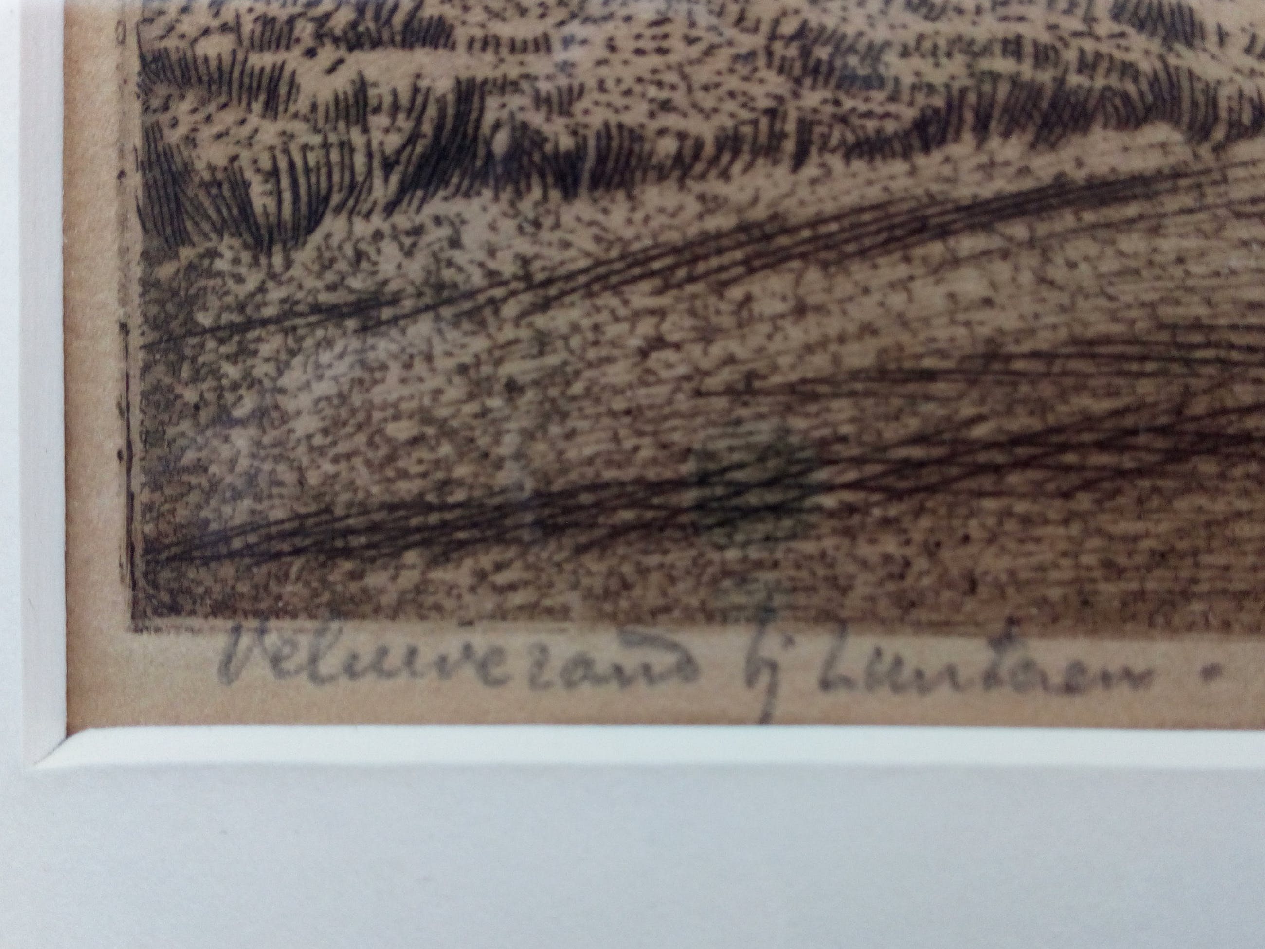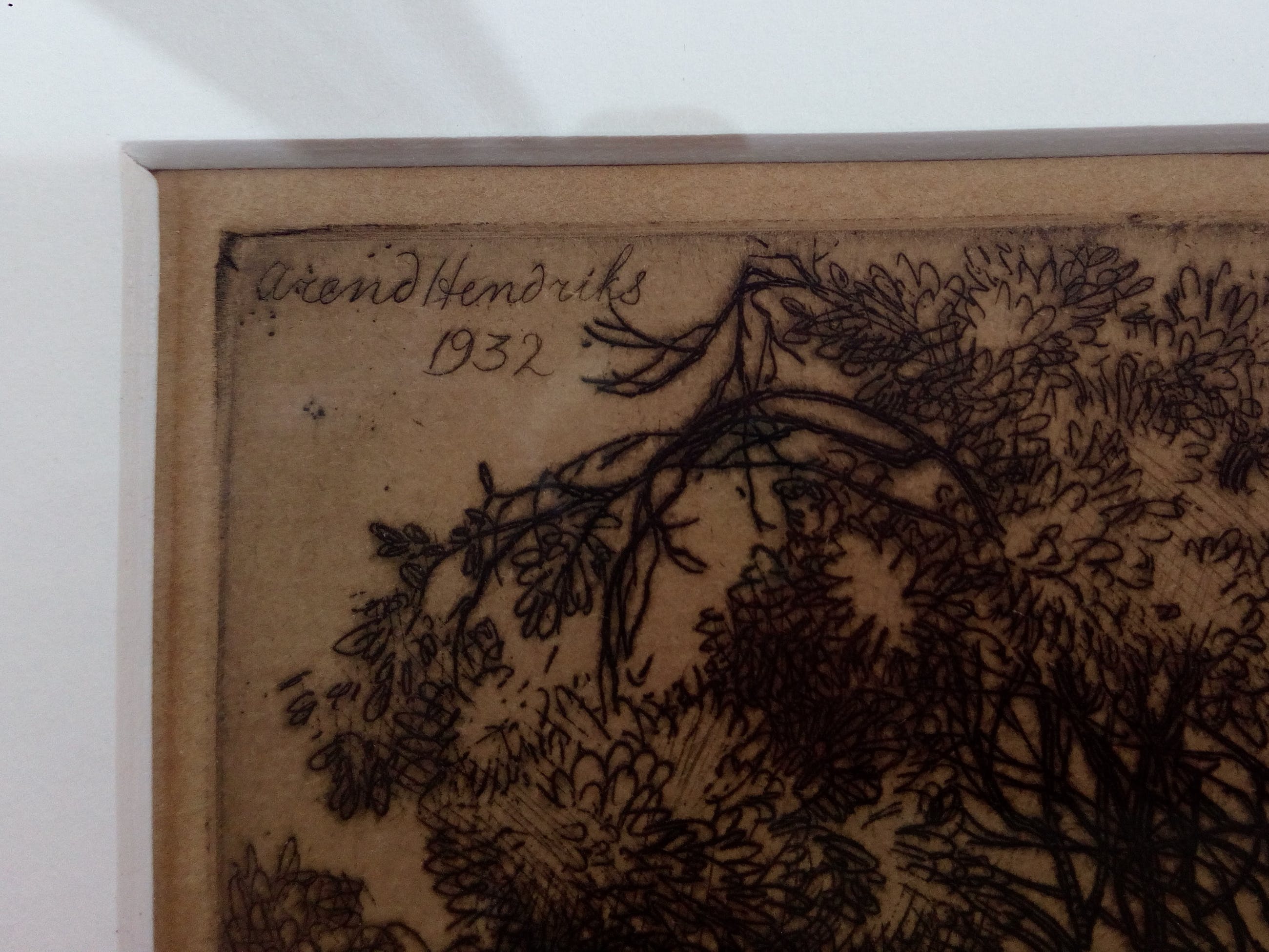 De ets is ingelijst en achter glas. Op de achterzijde zit een etiket met: