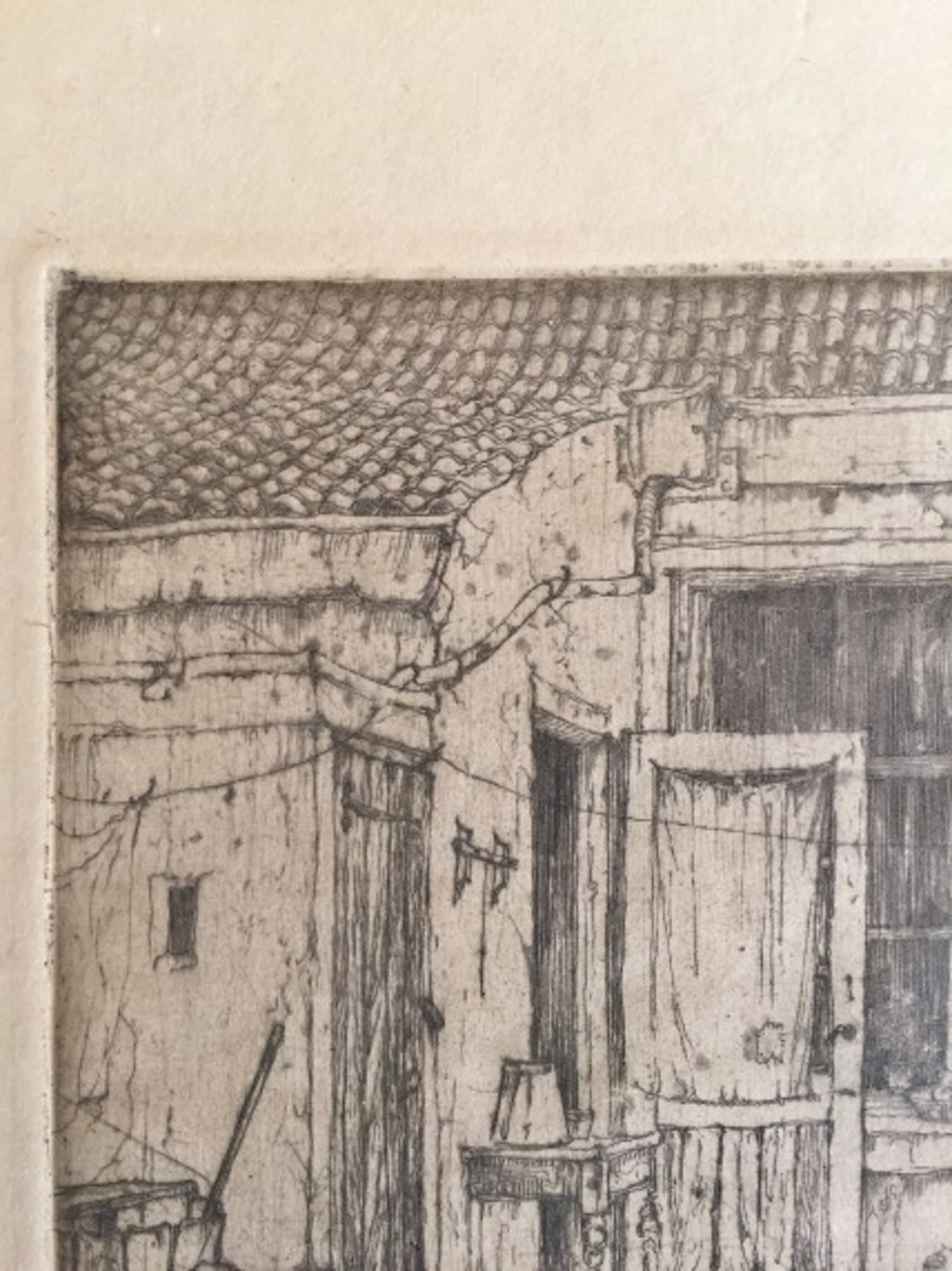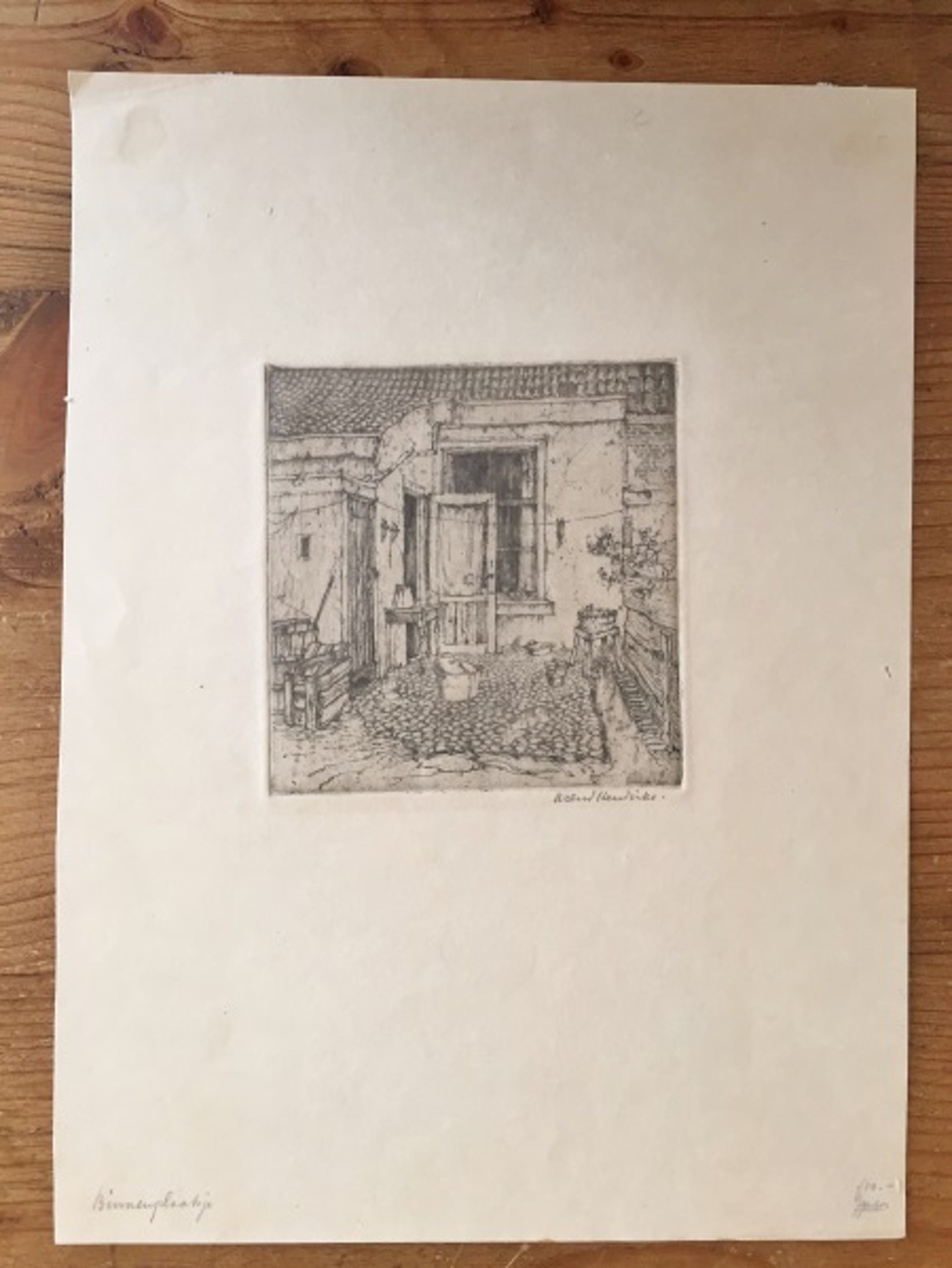“Binnenplaatsje” , 12x11,6 cm, papier 32x24 cm, signatuur in potlood r.o.,