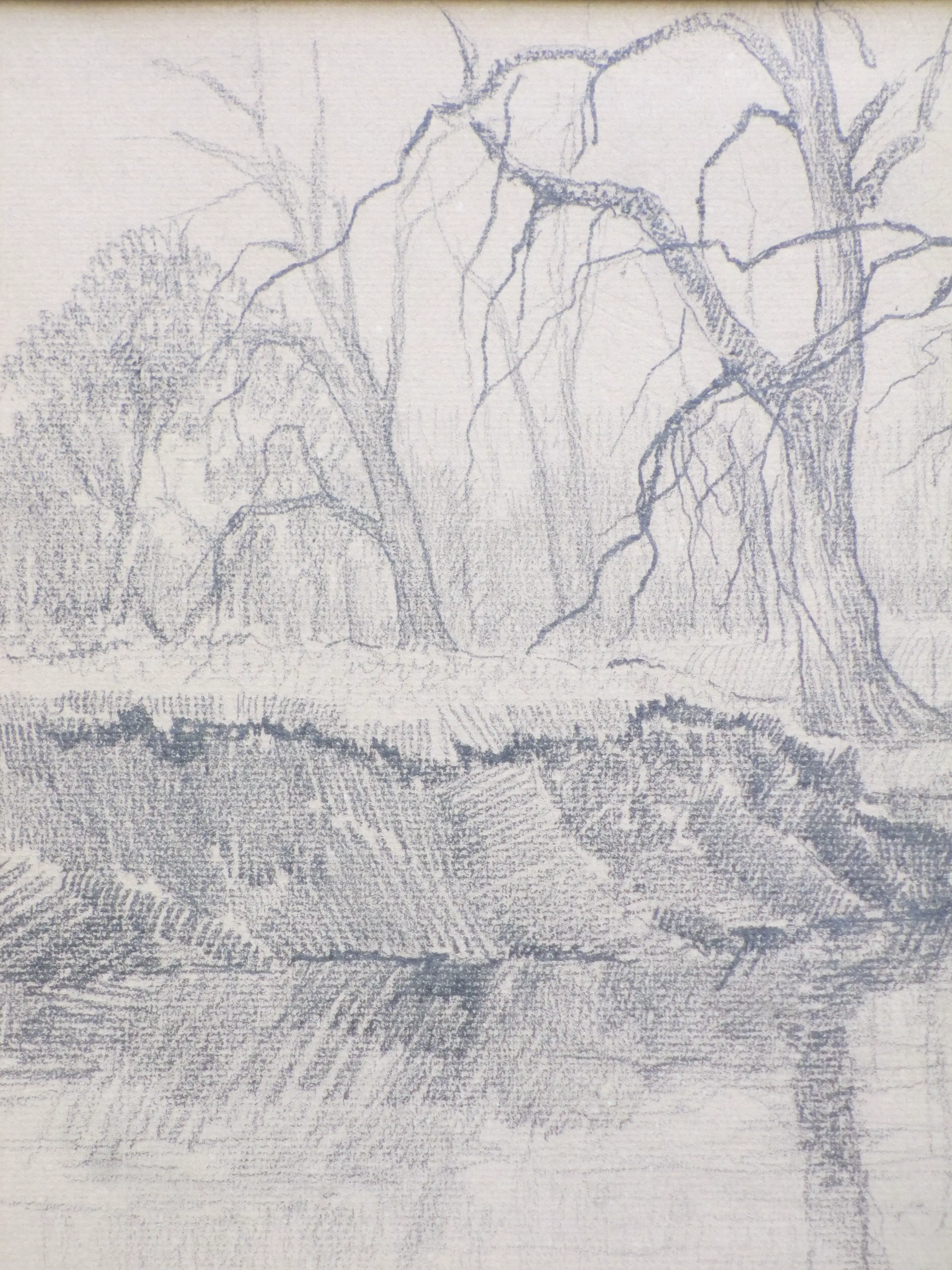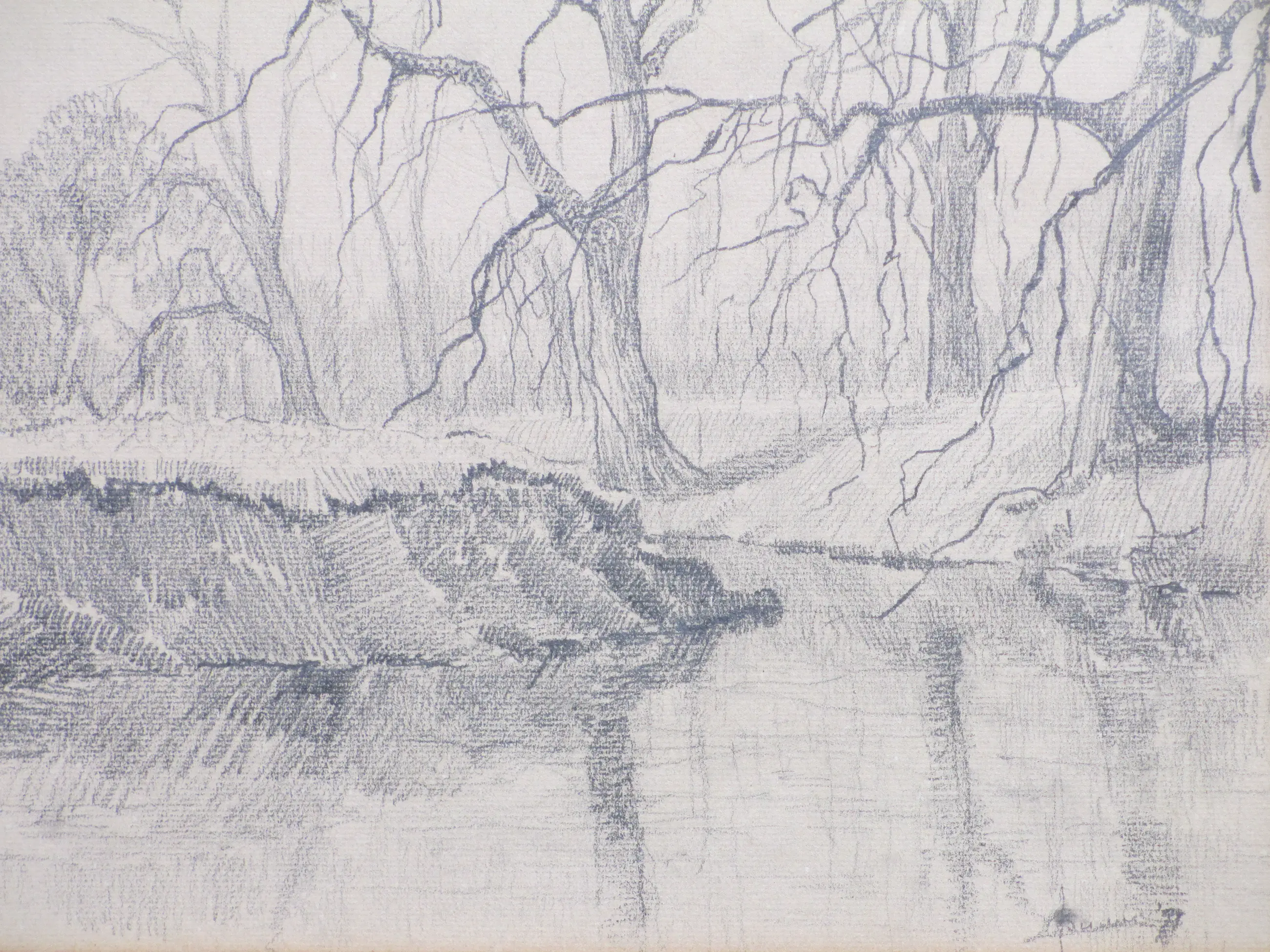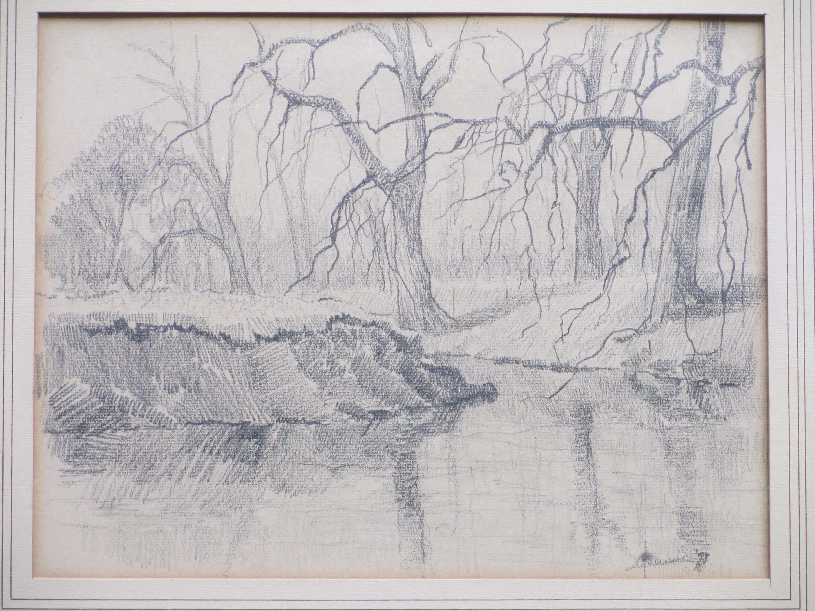 Tekening door Arend Jan van Driesten Tekening van een bosgezicht met een vijver Losbladig onder passepartout, beeldmaat 24x31, p.p.maat 40x46 Gesigneerd in potlood r.o. Authenticiteit volledig gegarandeerd