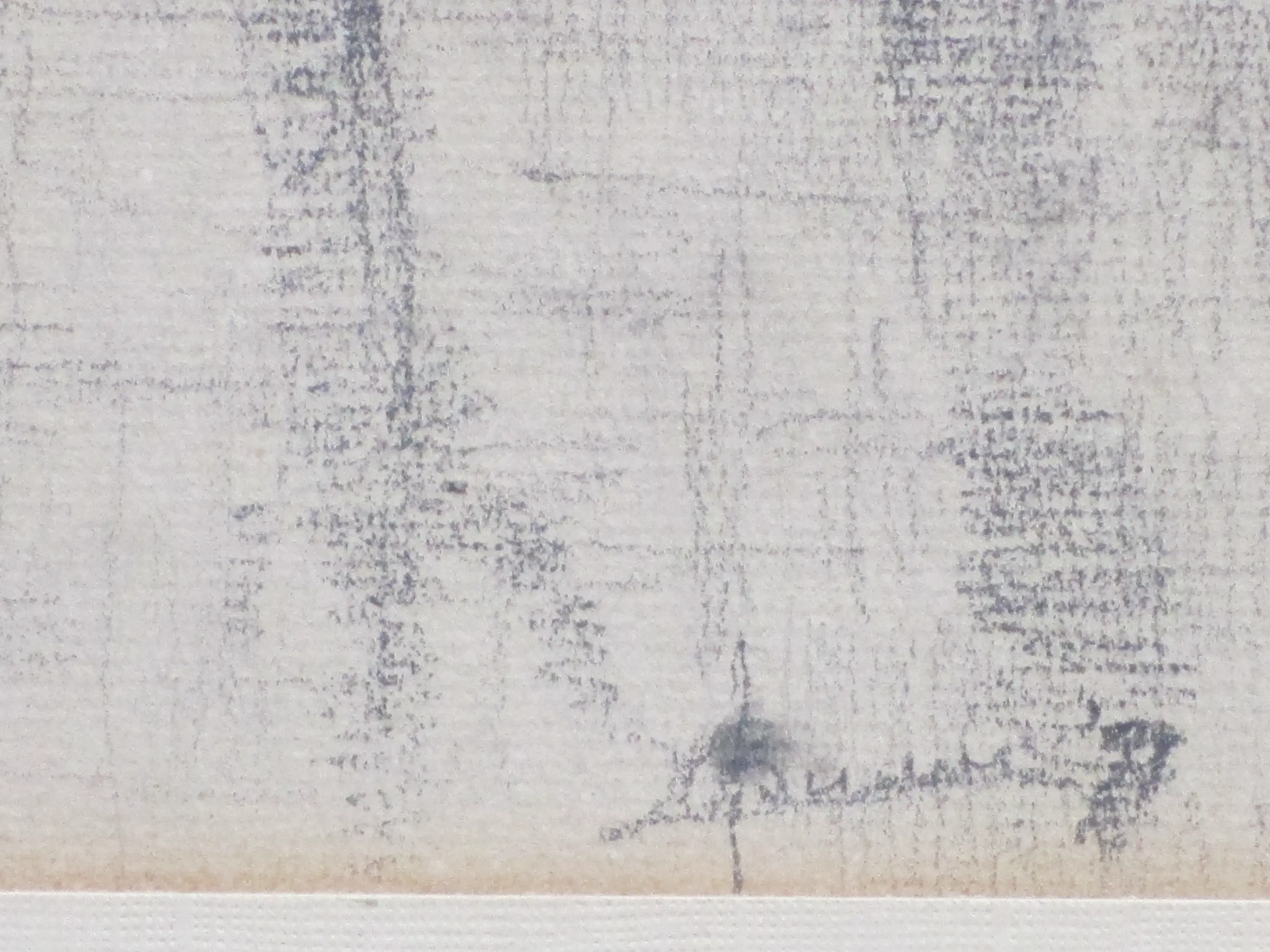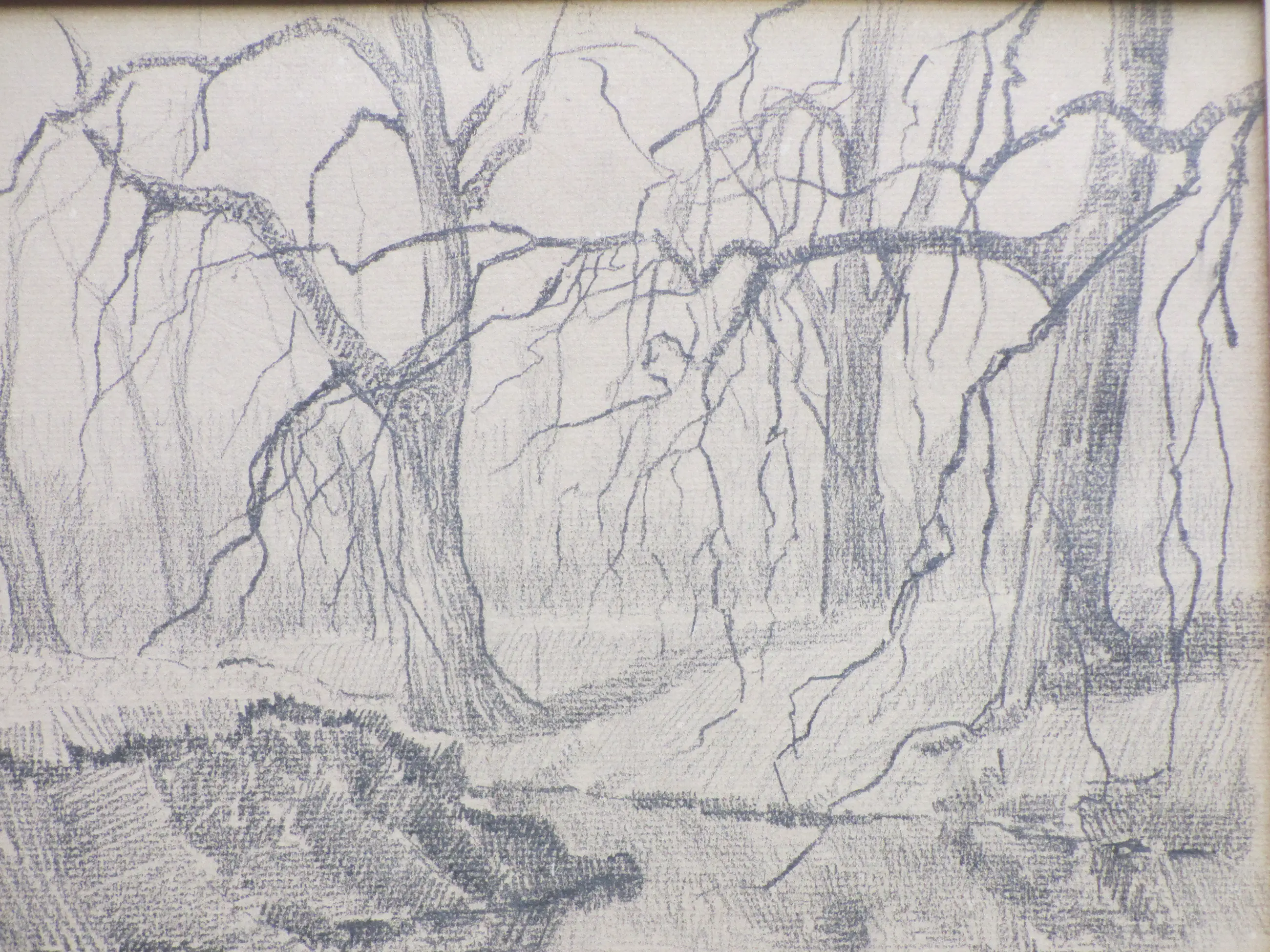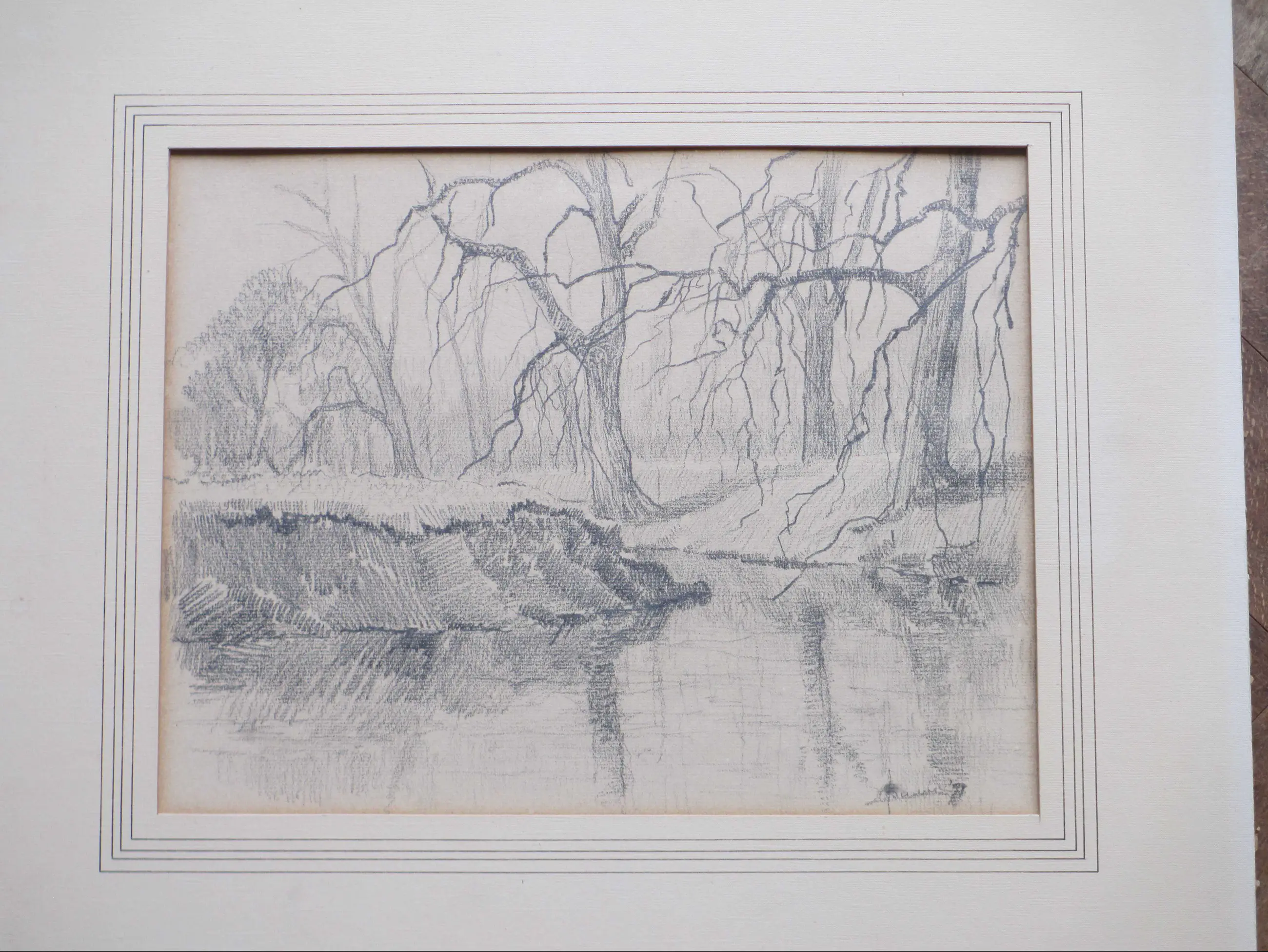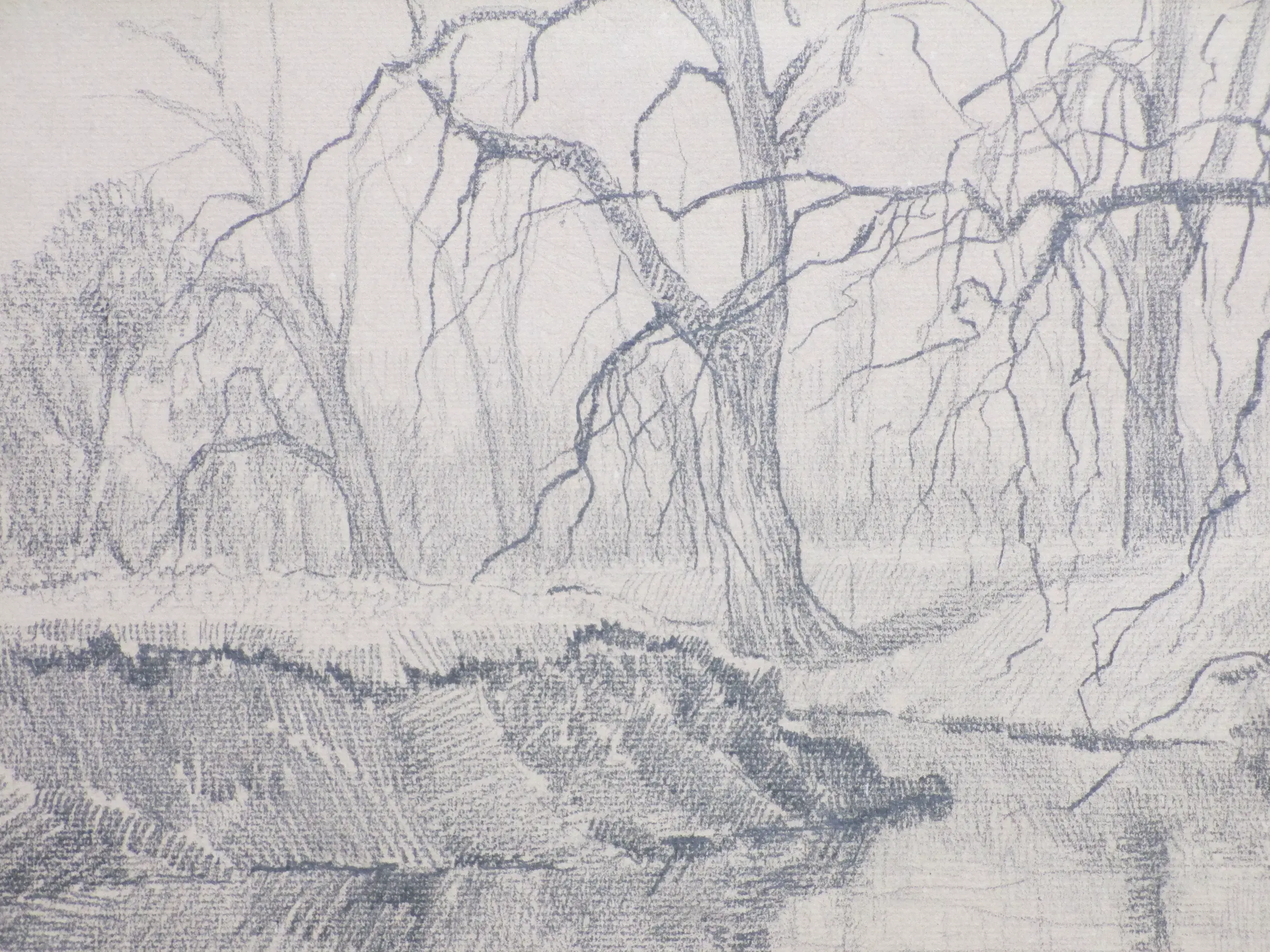 Tekening door Arend Jan van Driesten Tekening van een bosgezicht met een vijver Losbladig onder passepartout, beeldmaat 24x31, p.p.maat 40x46 Gesigneerd in potlood r.o. Authenticiteit volledig gegarandeerd