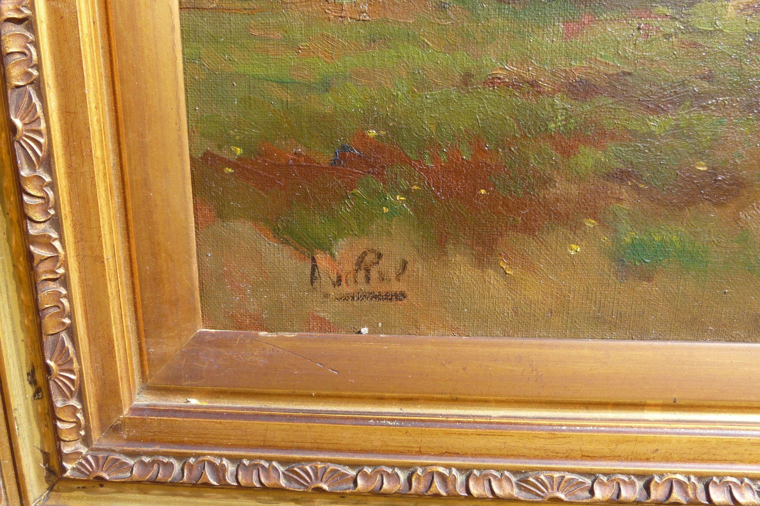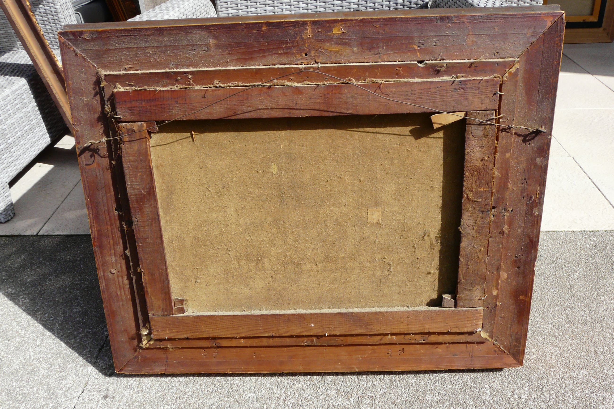 boerenhoeve met koeien in klassieke ornamentlijst aan het water en is links onder gesigneerd . schilderij heeft een kleine restoratie plekje aan de achterkant ca 2x2 cm het schilderij is helder van kleur en de lijst is in goede staat .