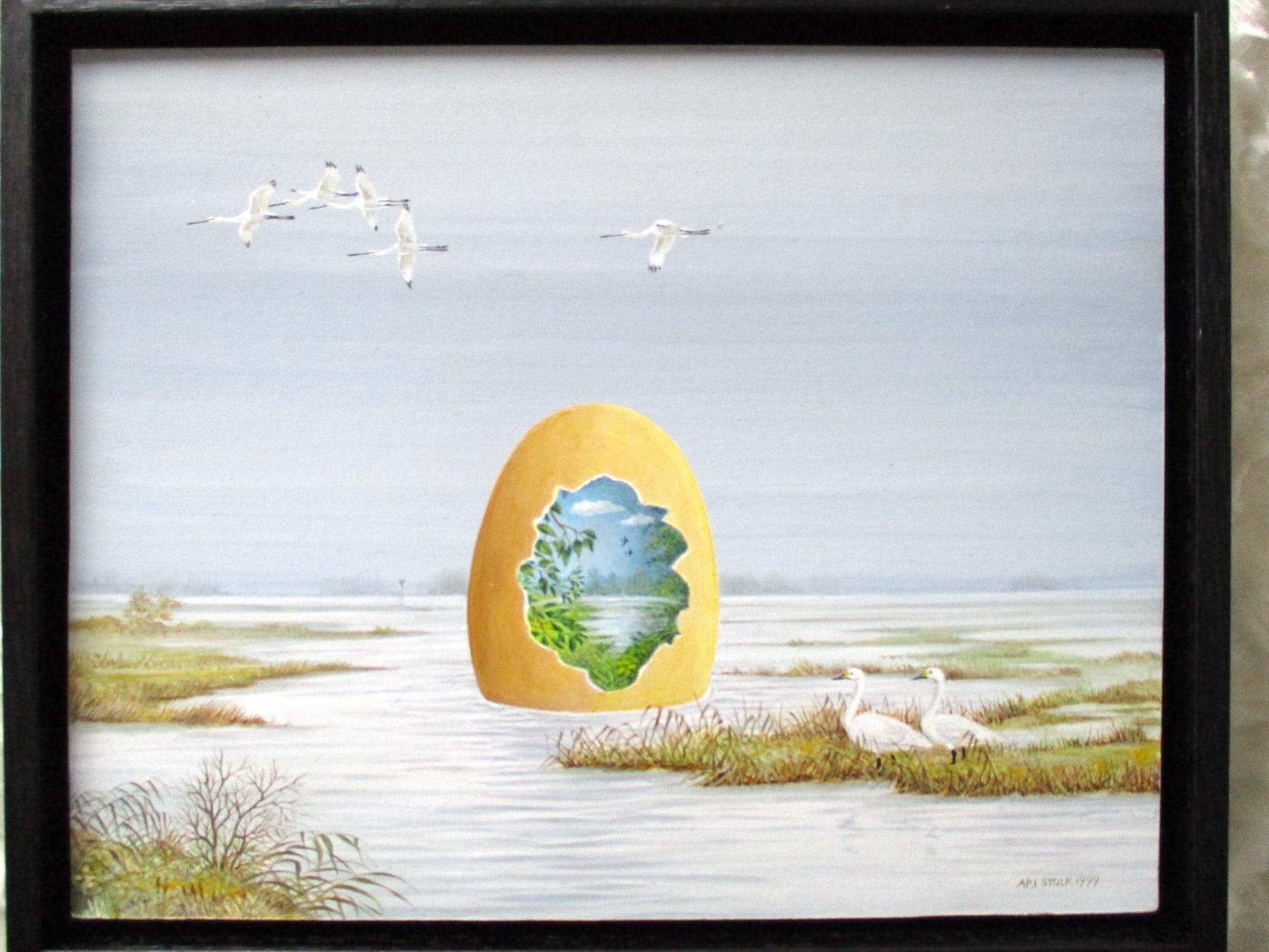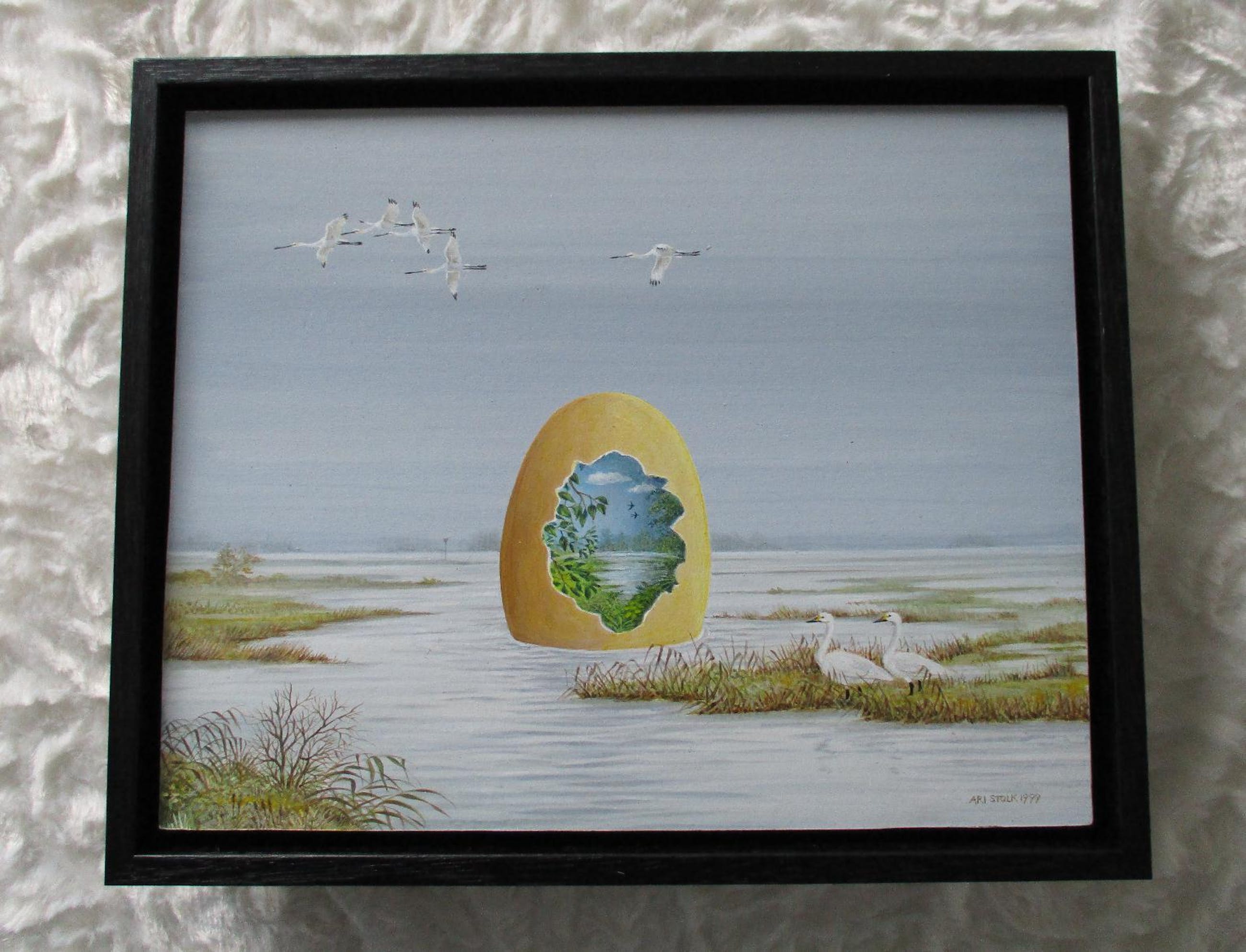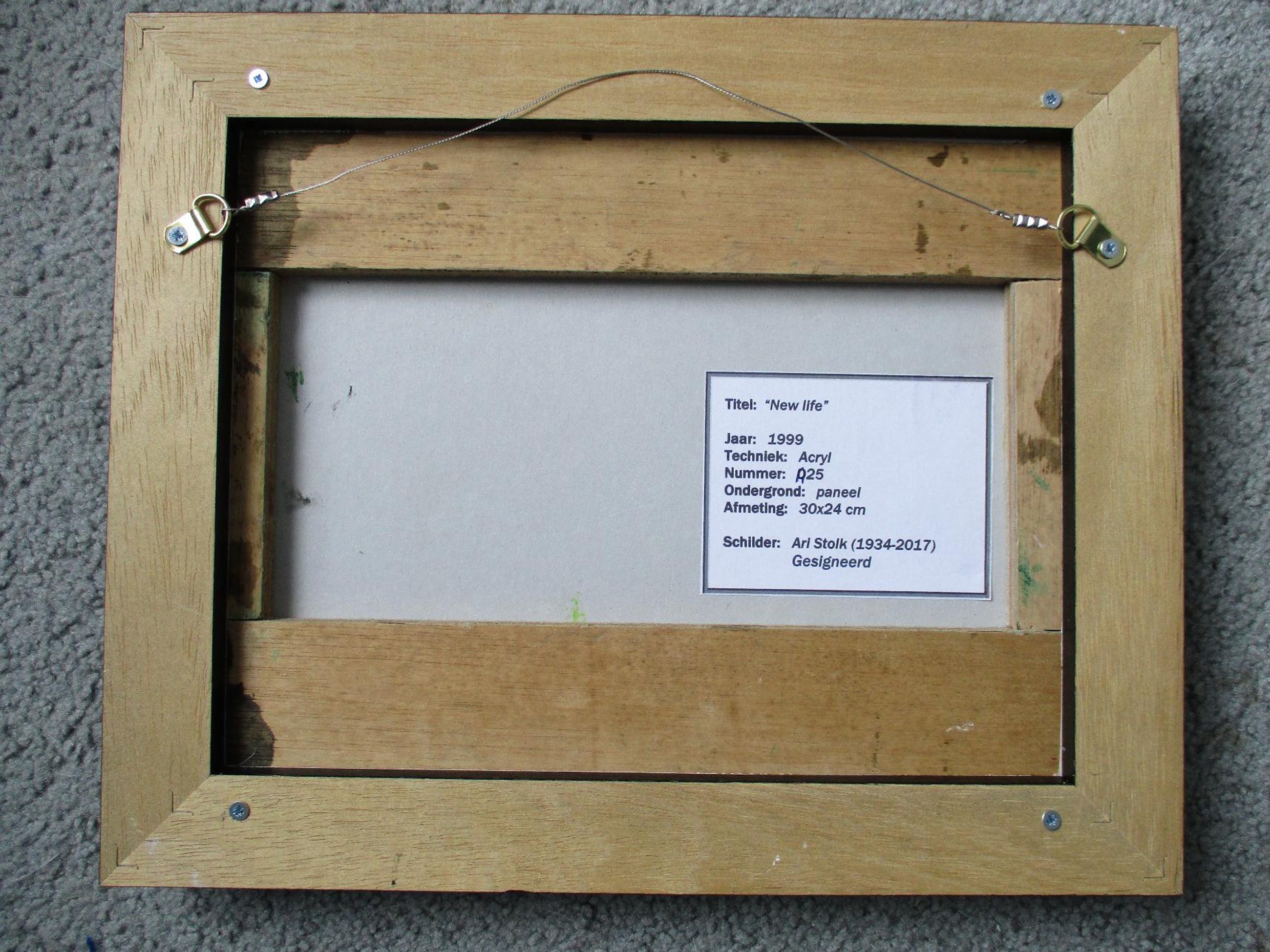 Werkje met een knipoog van Ari Stolk uit 1999. (Surrealistisch). Acryl, gesigneerd, op paneel, ingelijst. Afmetingen (hoogte x breedte): - lijst: 33 x 27 cm - werk: 30 x 24 cm