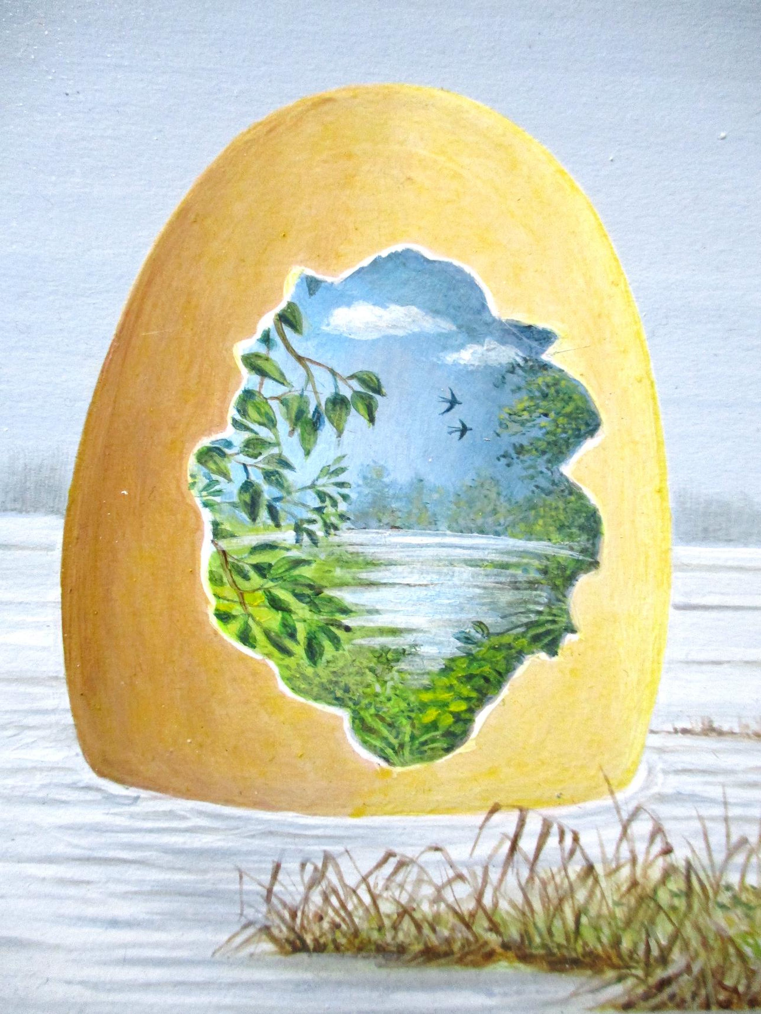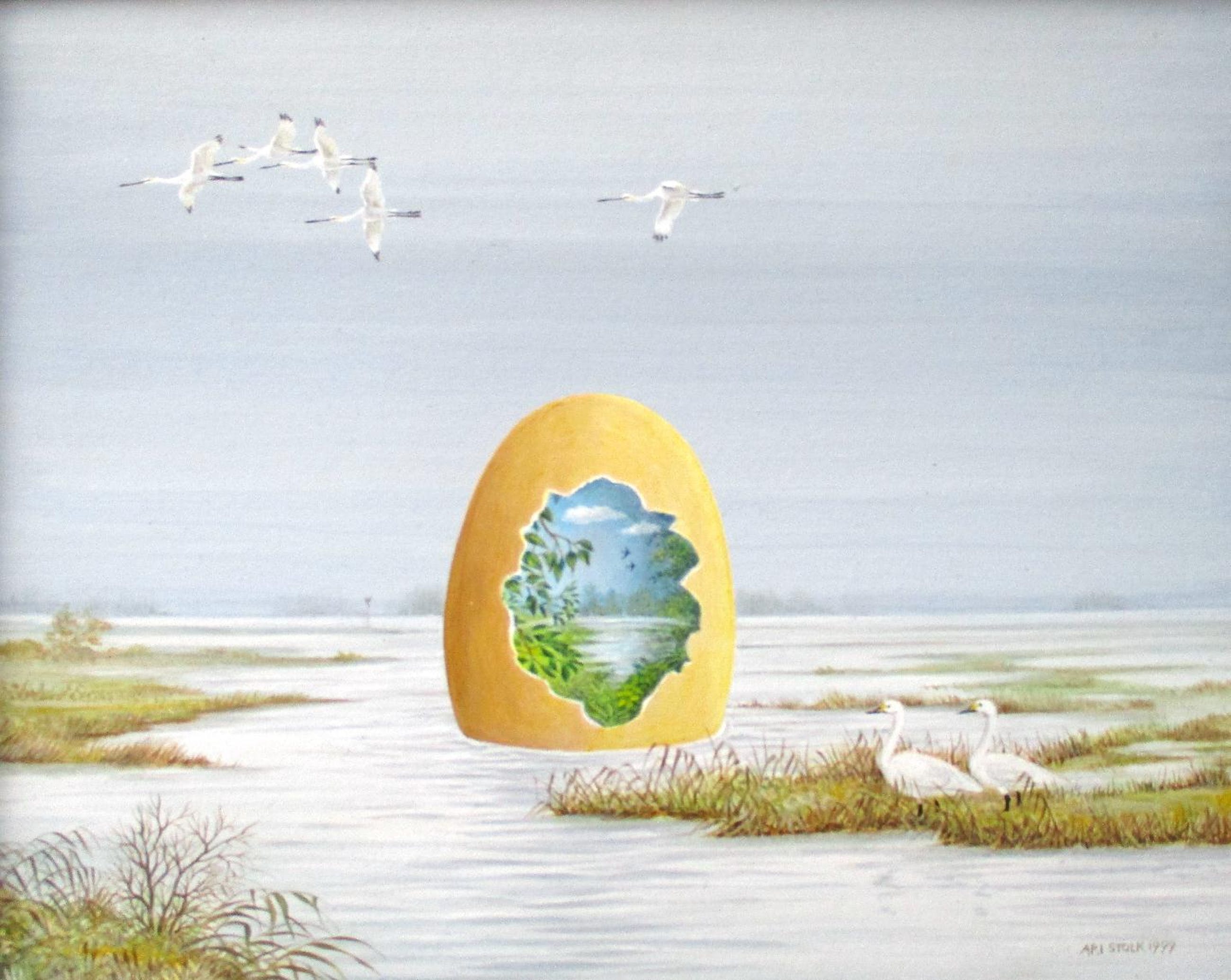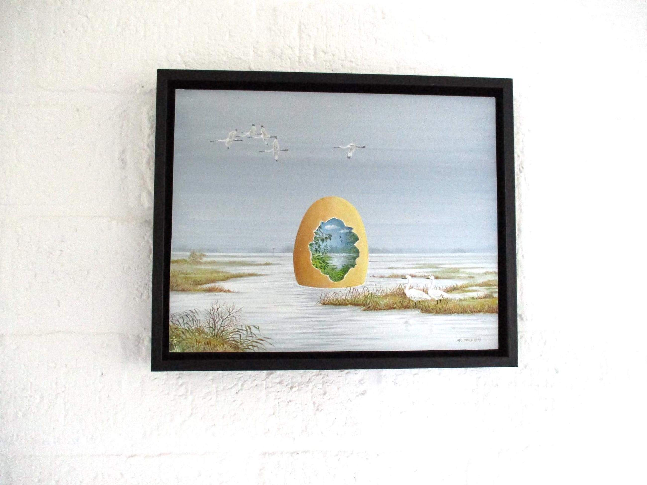 Werkje met een knipoog van Ari Stolk uit 1999. (Surrealistisch). Acryl, gesigneerd, op paneel, ingelijst. Afmetingen (hoogte x breedte): - lijst: 33 x 27 cm - werk: 30 x 24 cm