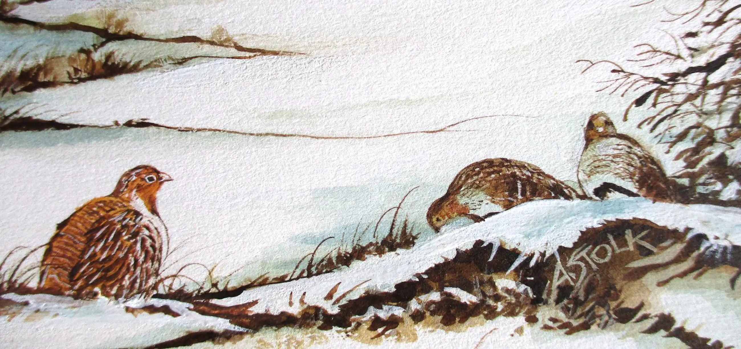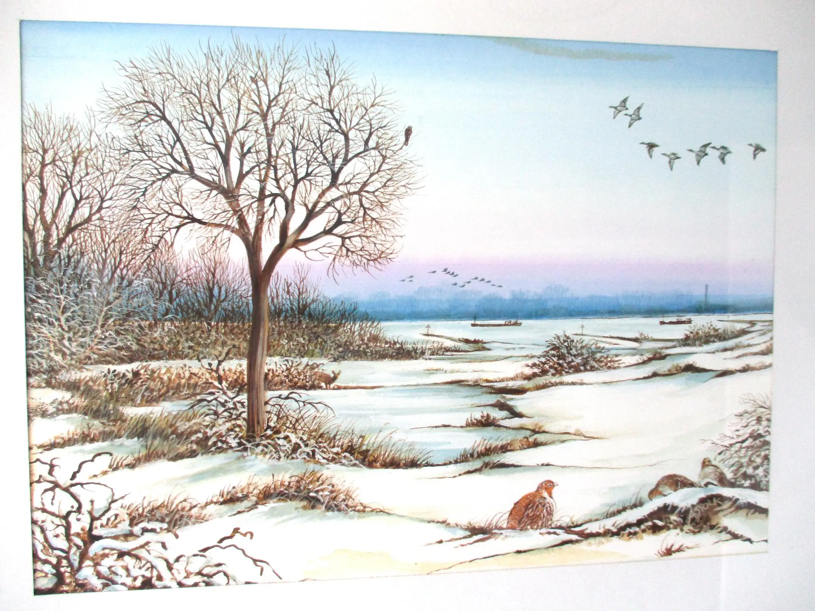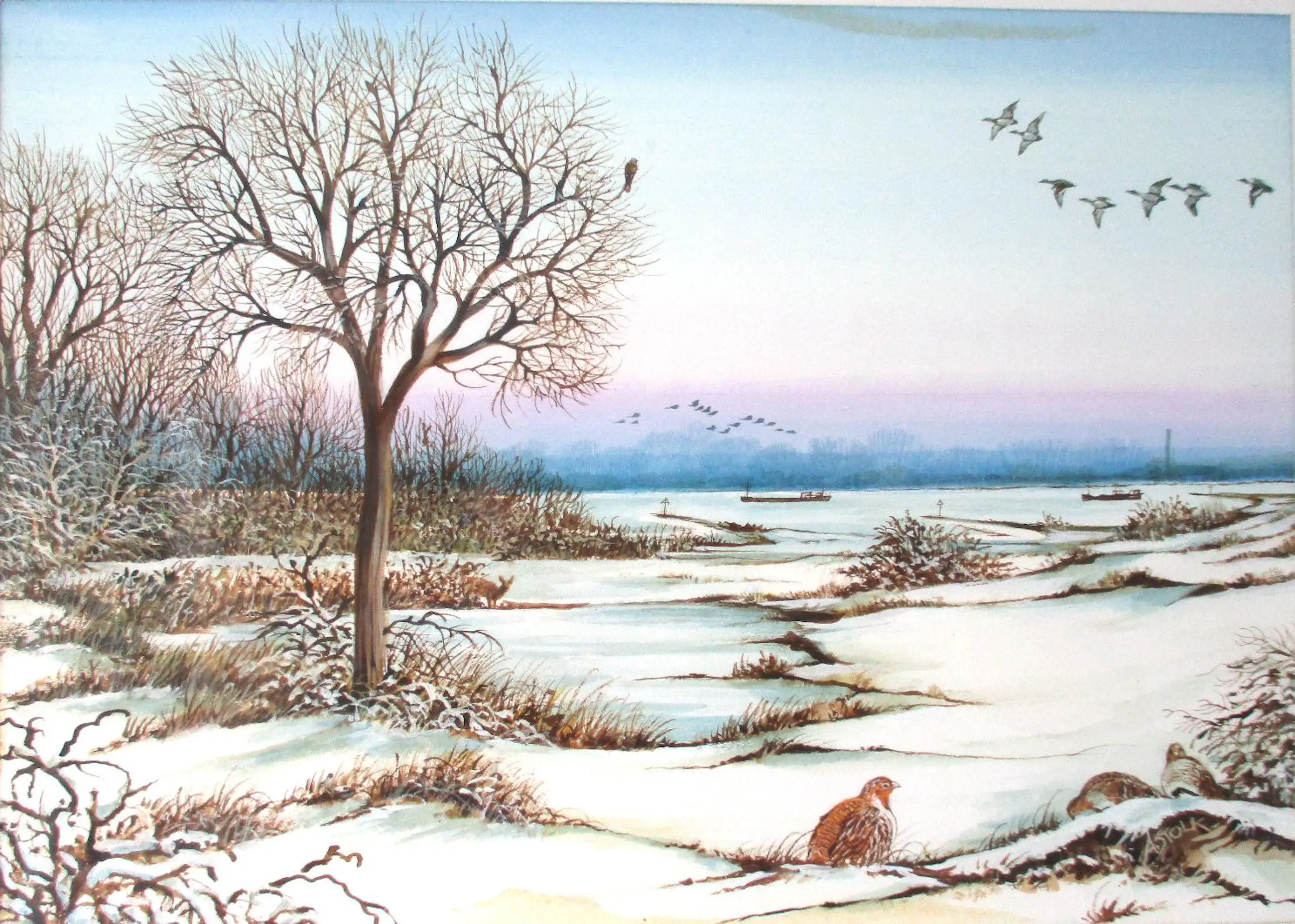 Patrijzen en eenden in winterlandschap. Gouache uit 1990-1999