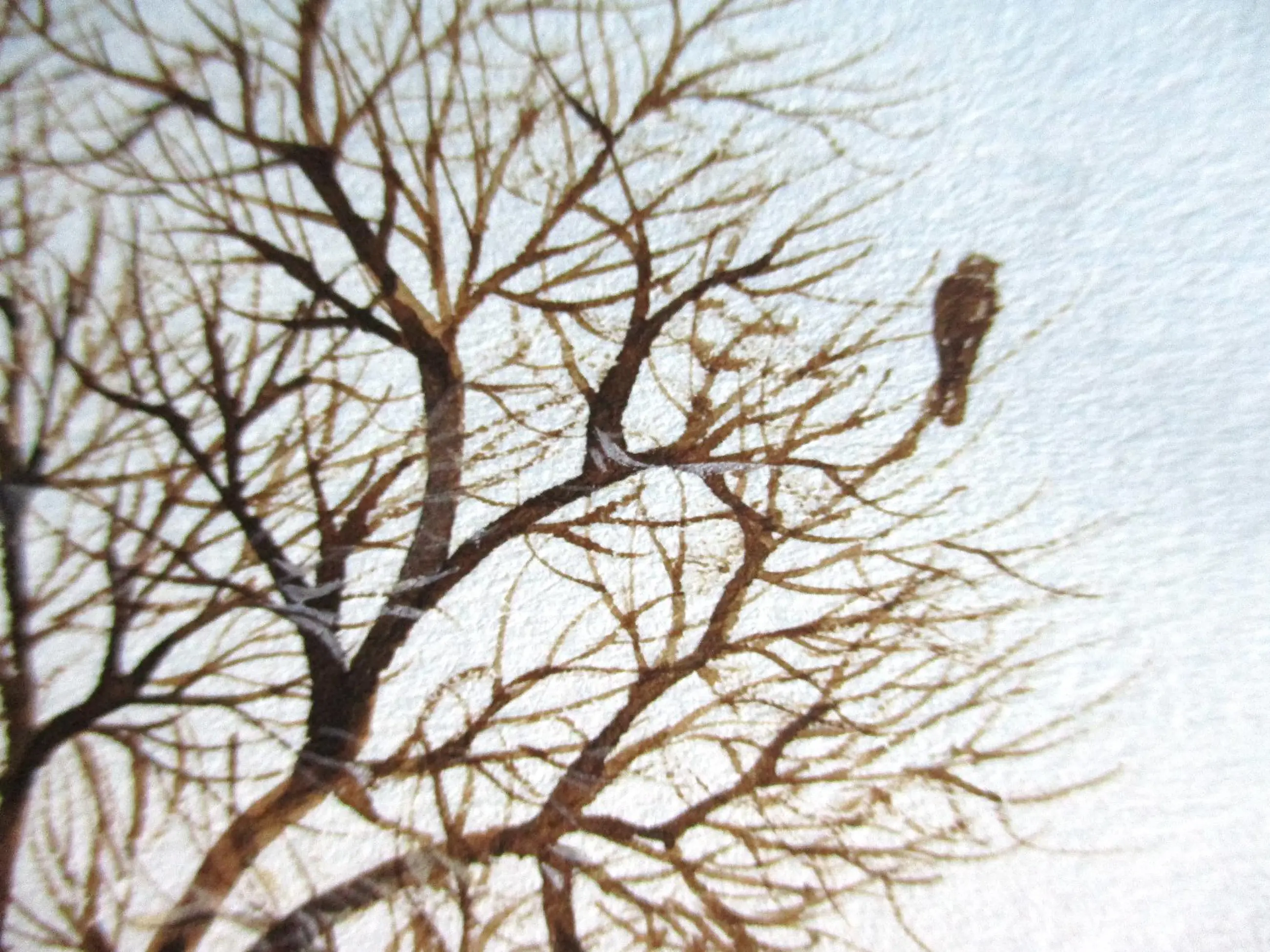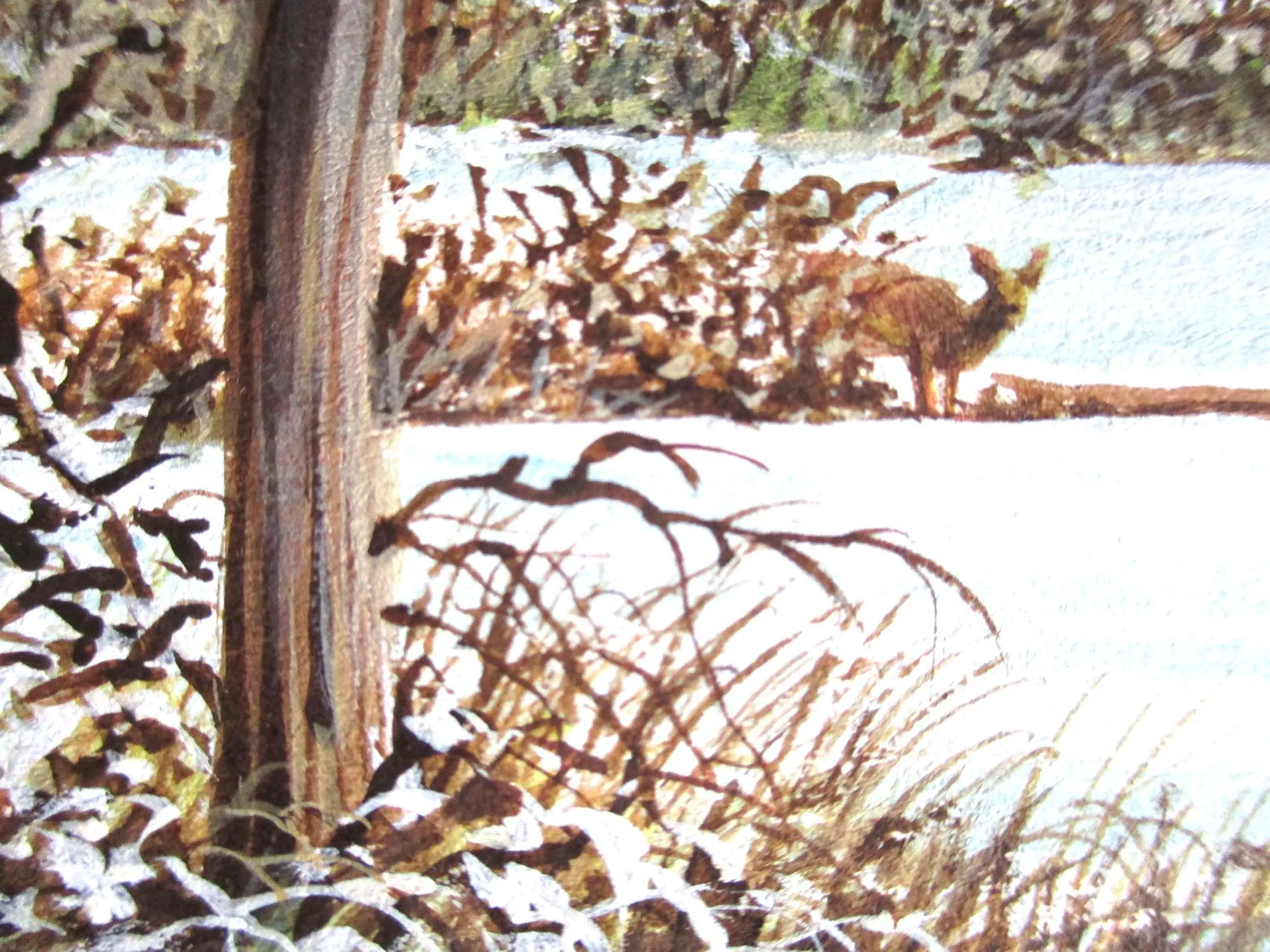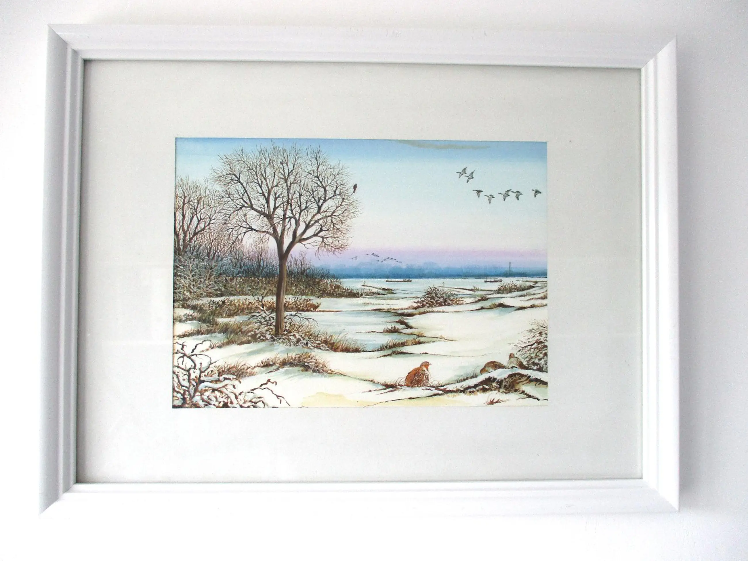 Patrijzen en eenden in winterlandschap. Gouache uit 1990-1999
