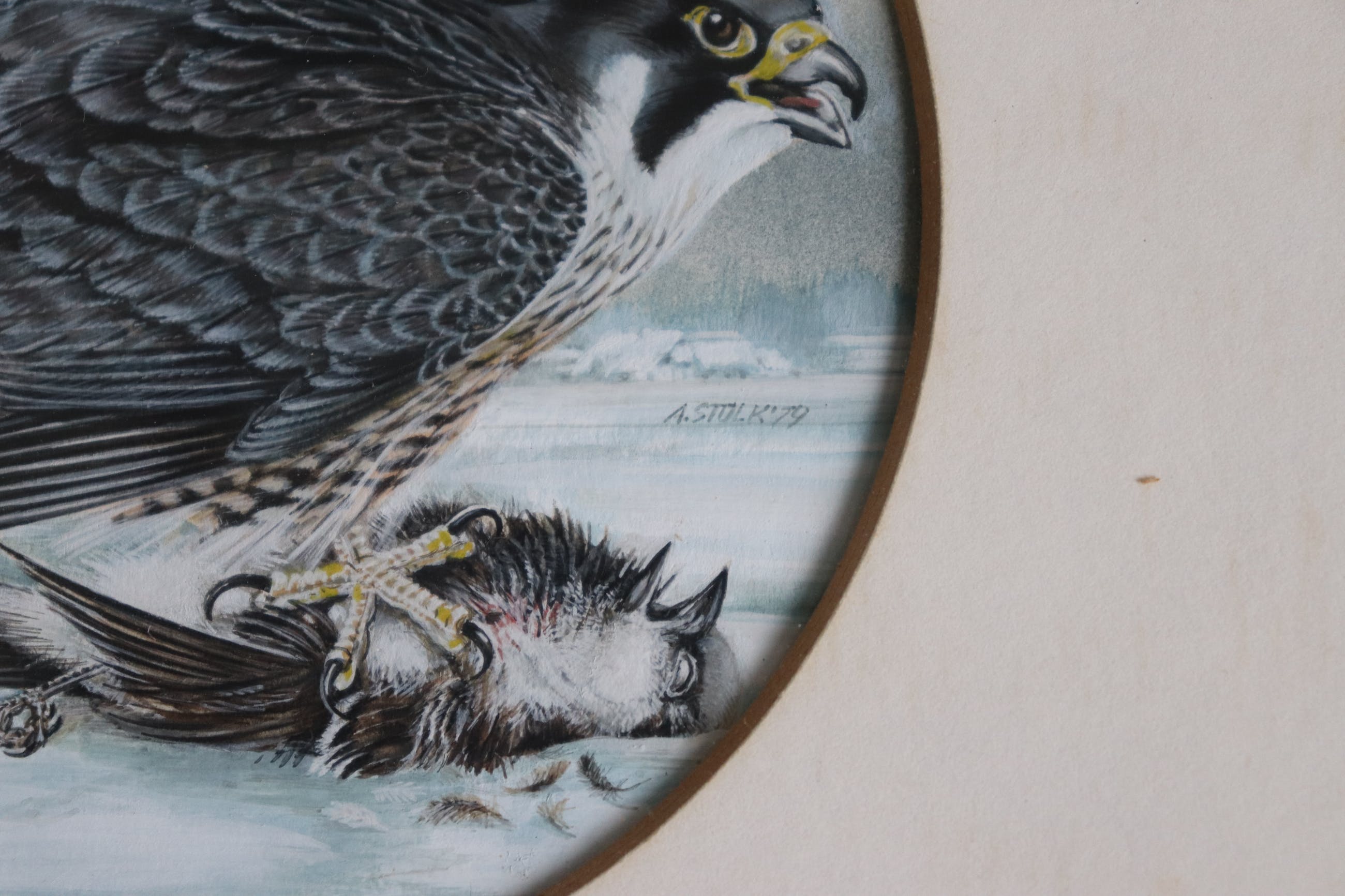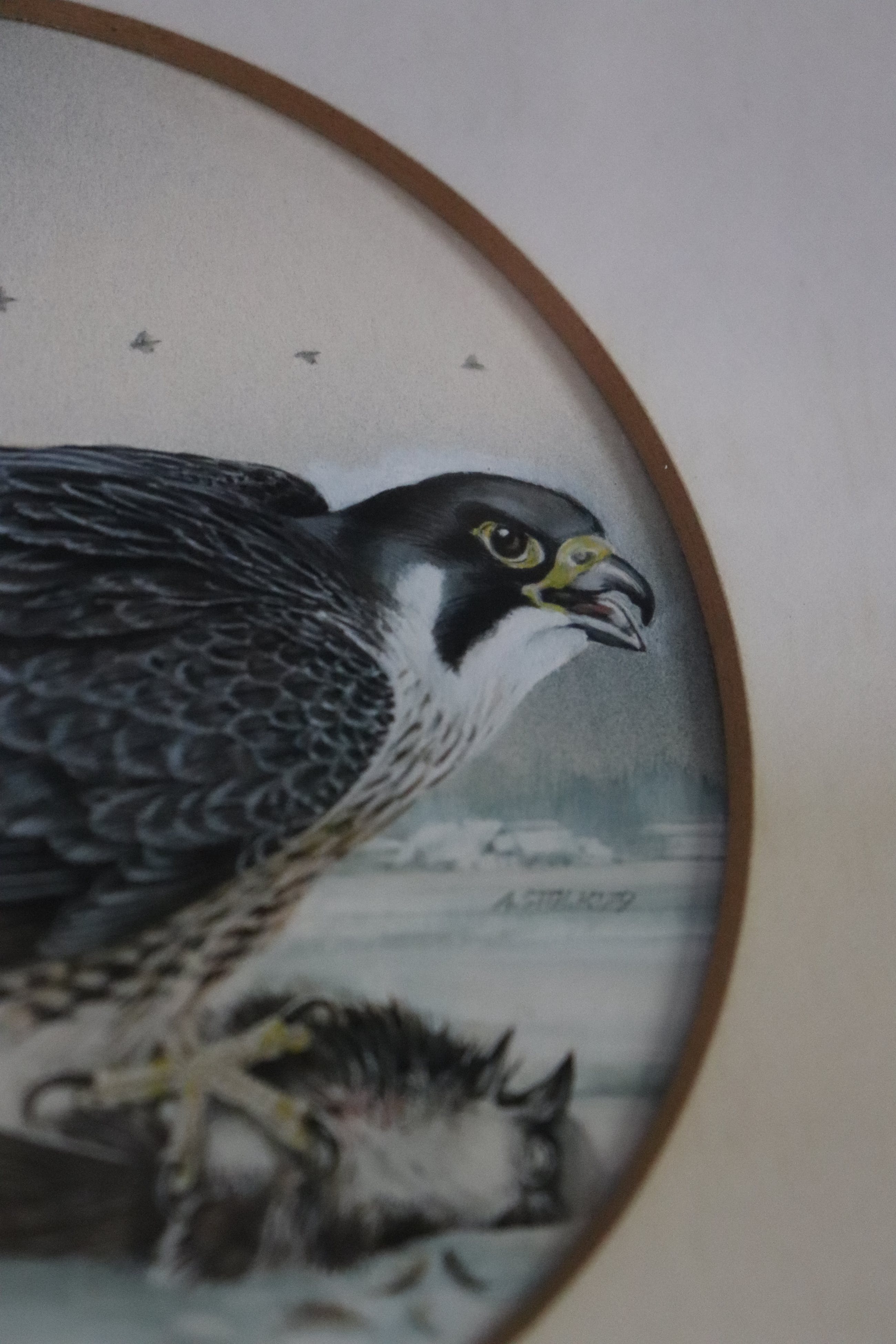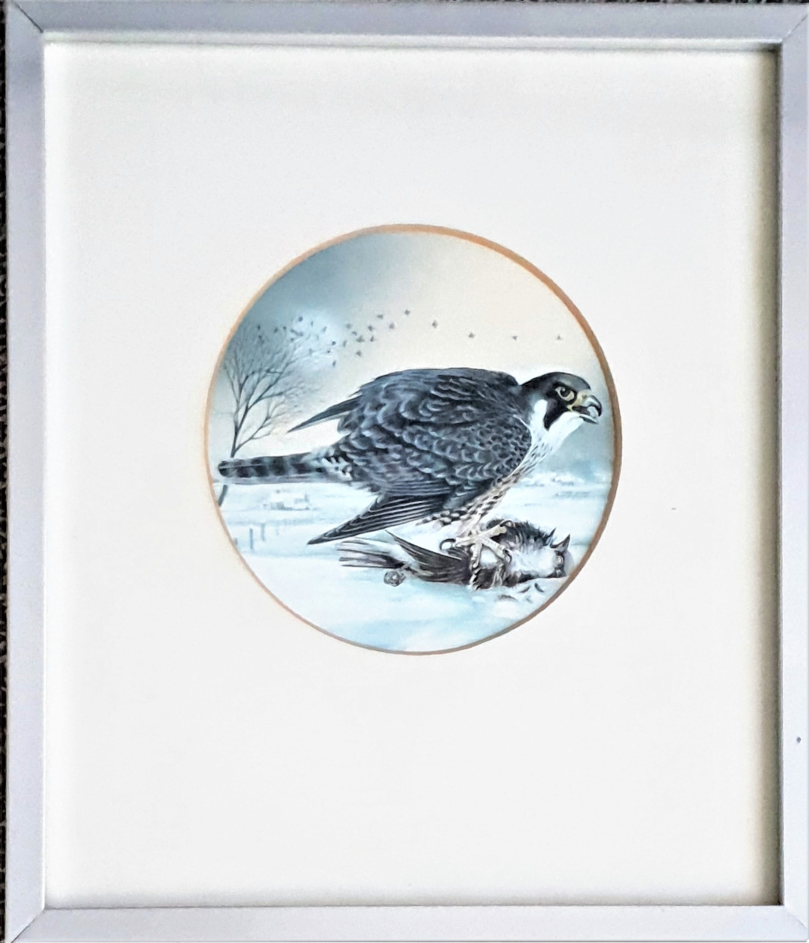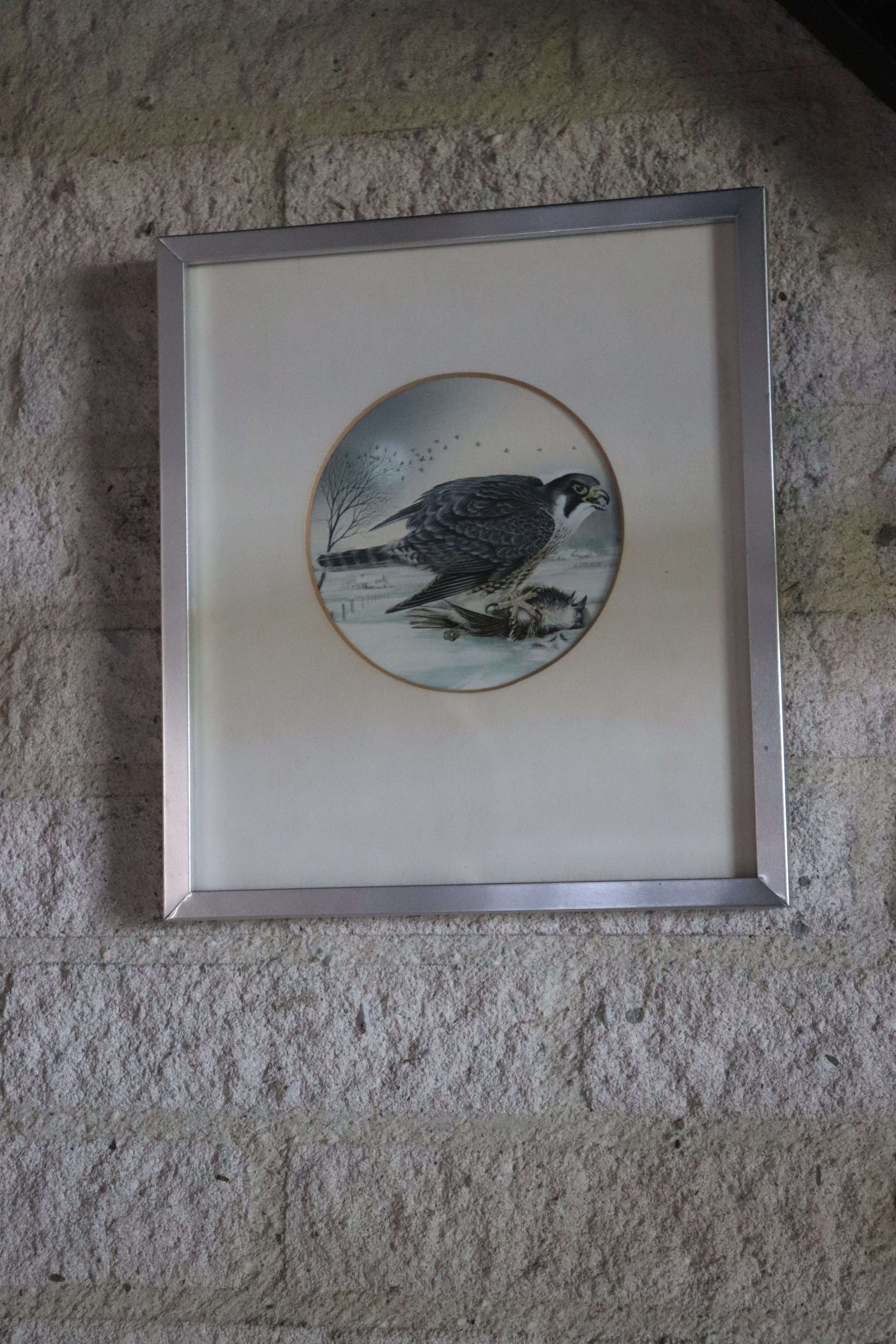 Mooi kunstwerk met slechtvalk heeft een diameter van 12 cm. Het kunstwerk is aangekocht bij Galerie Lieve Hemel. De lijst is zilverkleurig.